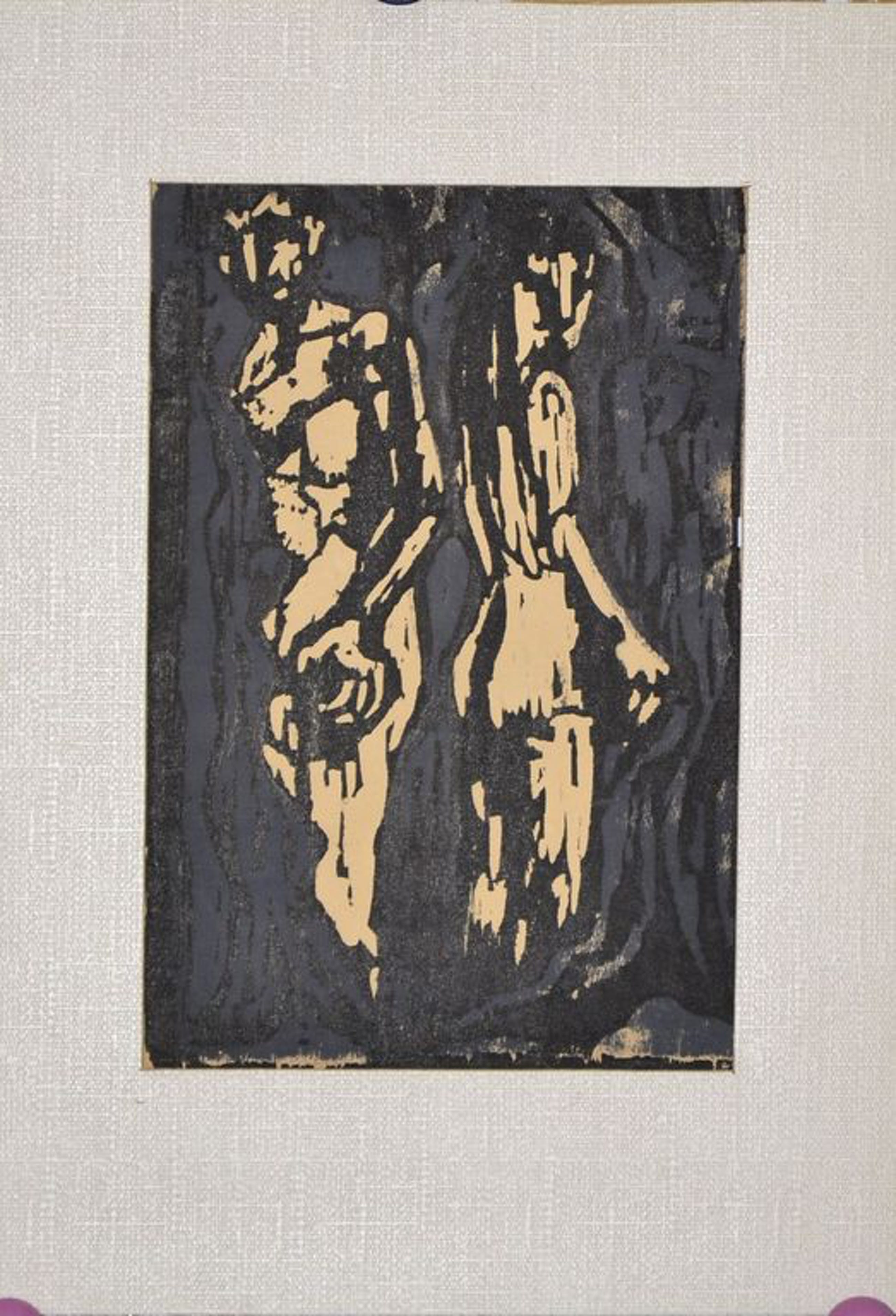Erg mooie houtsnede van Fon Klement getiteld Adam en Eva. Het werk is gesigneerd onder het passe-partout aan de linkerkant. Hier staat: Klement 1958 Handruk Adam en Eva.