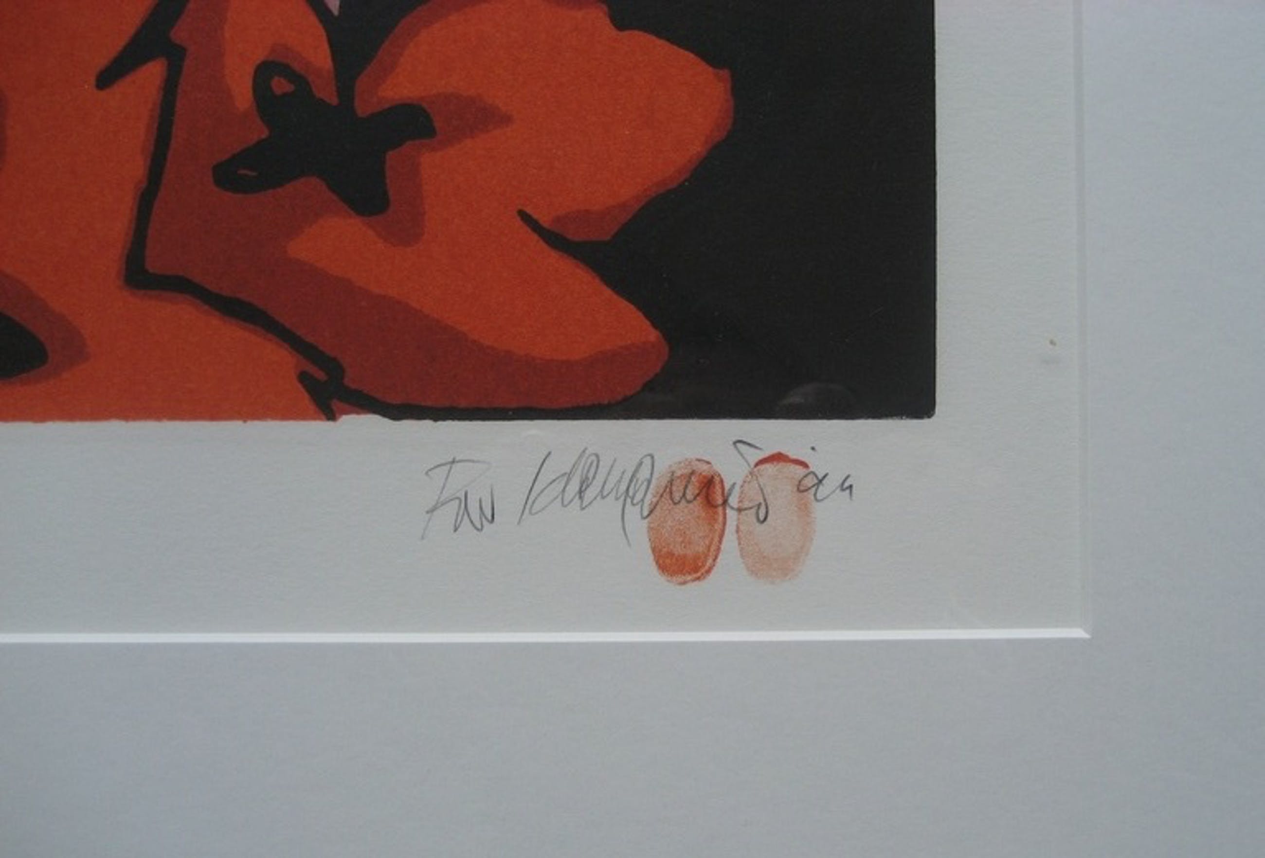 Fraaie boarddruk van Fon Klement, getiteld Les Coquelicots (de klaprozen). Het werk is rechtsonder door de kunstenaar met potlood gesigneerd en voorzien van jaartal ('94) en van de kenmerkende duimafdrukken. Middenonder, eveneens met potlood, staat de titel, linksonder eigen druk en oplagenummer (119/125).