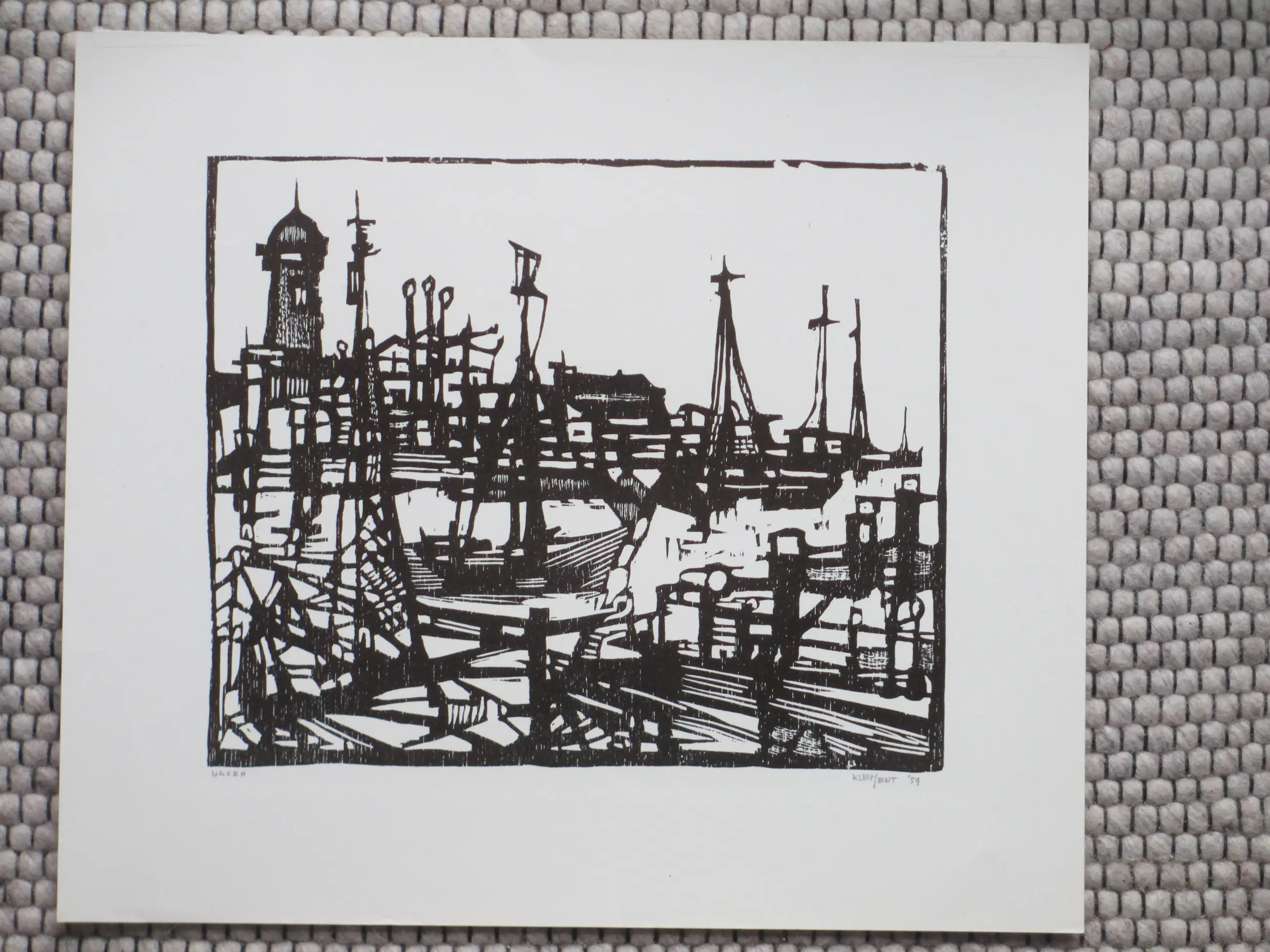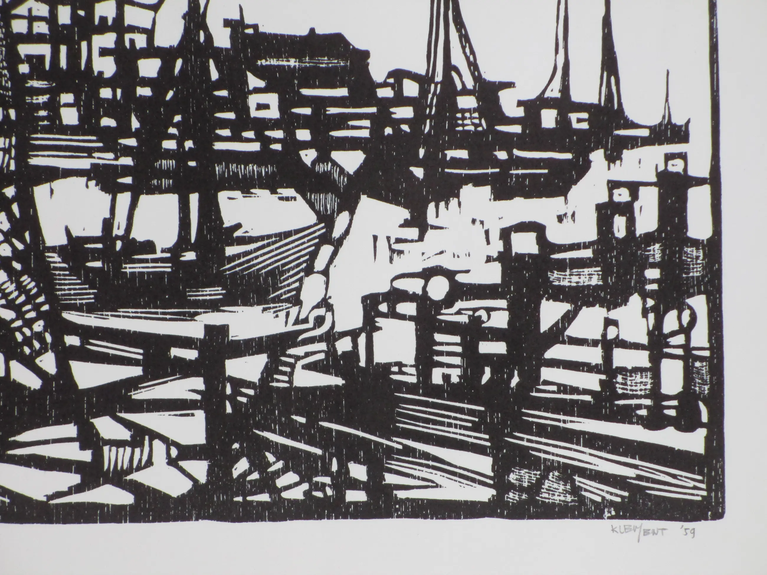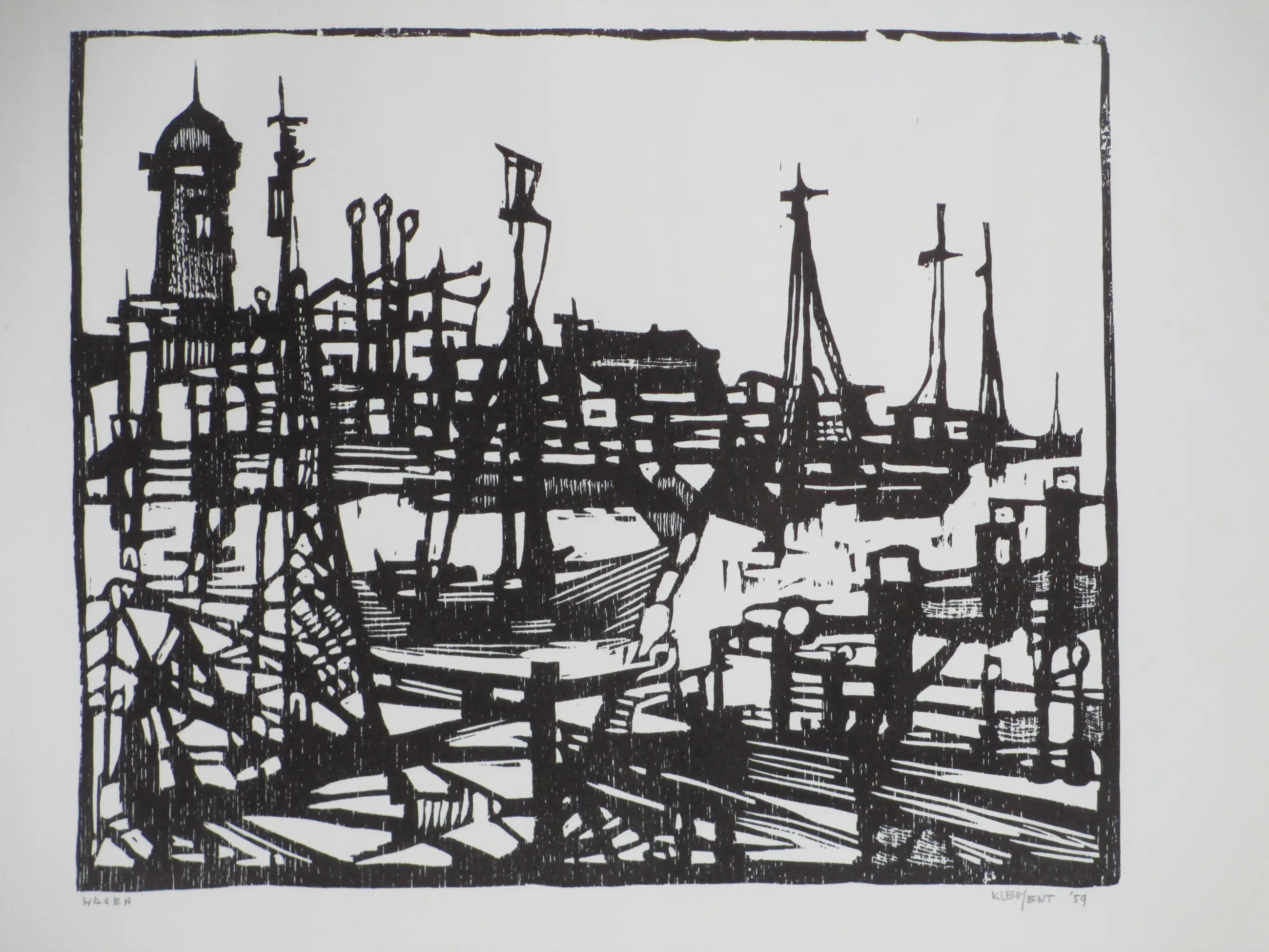 Hout/linosnede door Fon Klement Voorstelling van een haven Losbladig, beeldmaat 23x28, bladmaat 34x39 Gesigneerd en gedateerd in potlood r.o.: 'Klement '59' Getiteld in potlood l.o.: 'Haven'