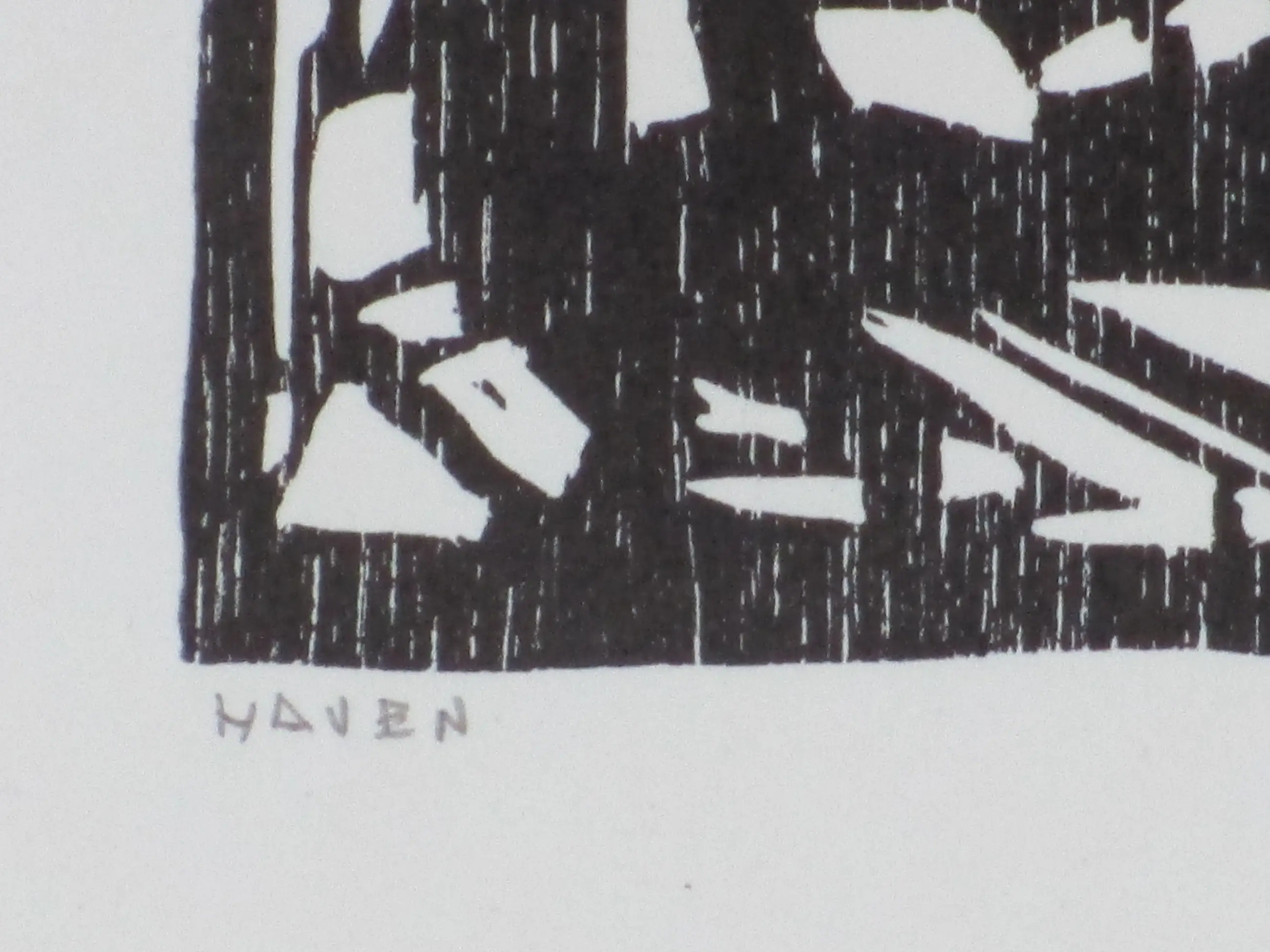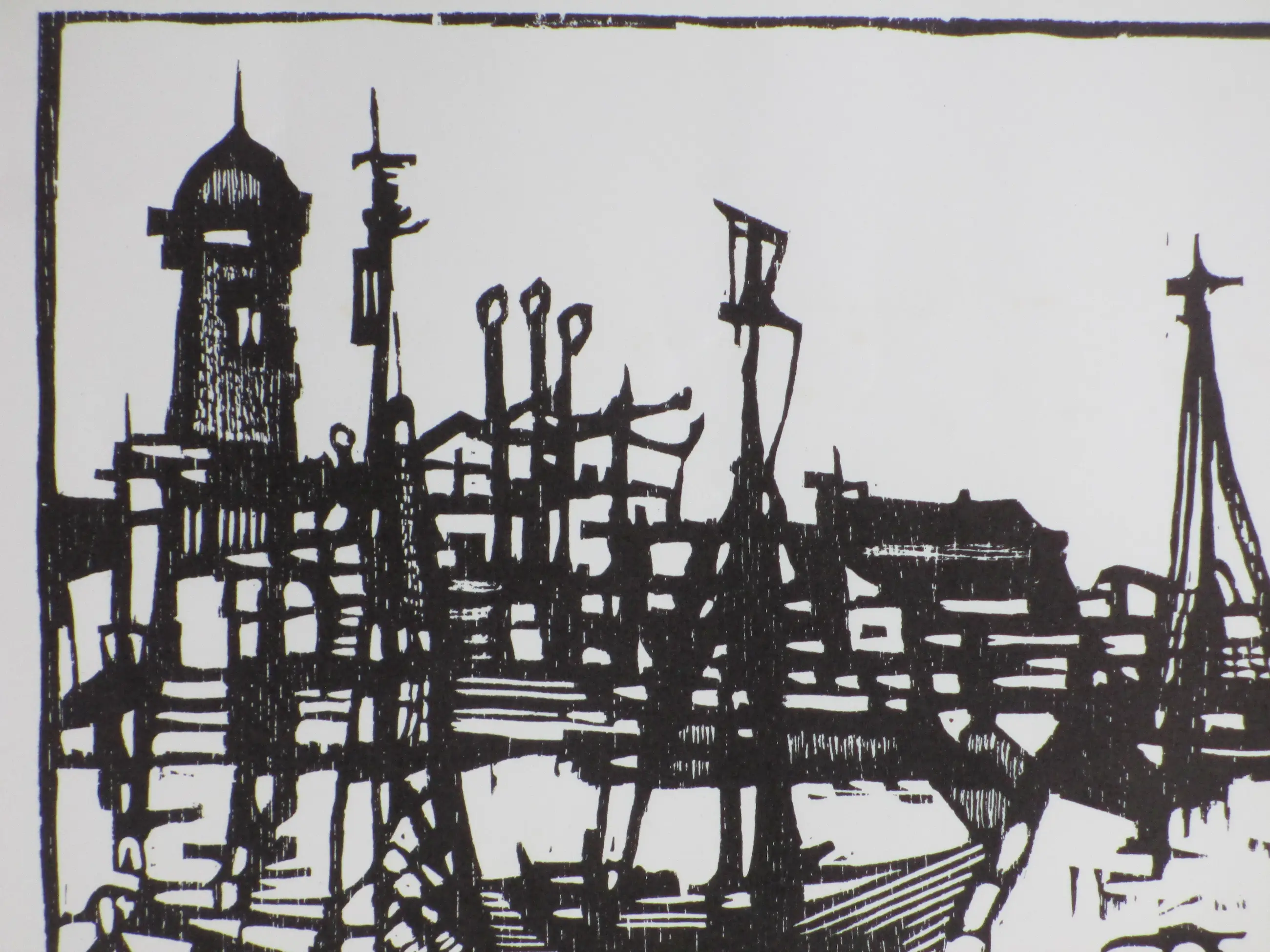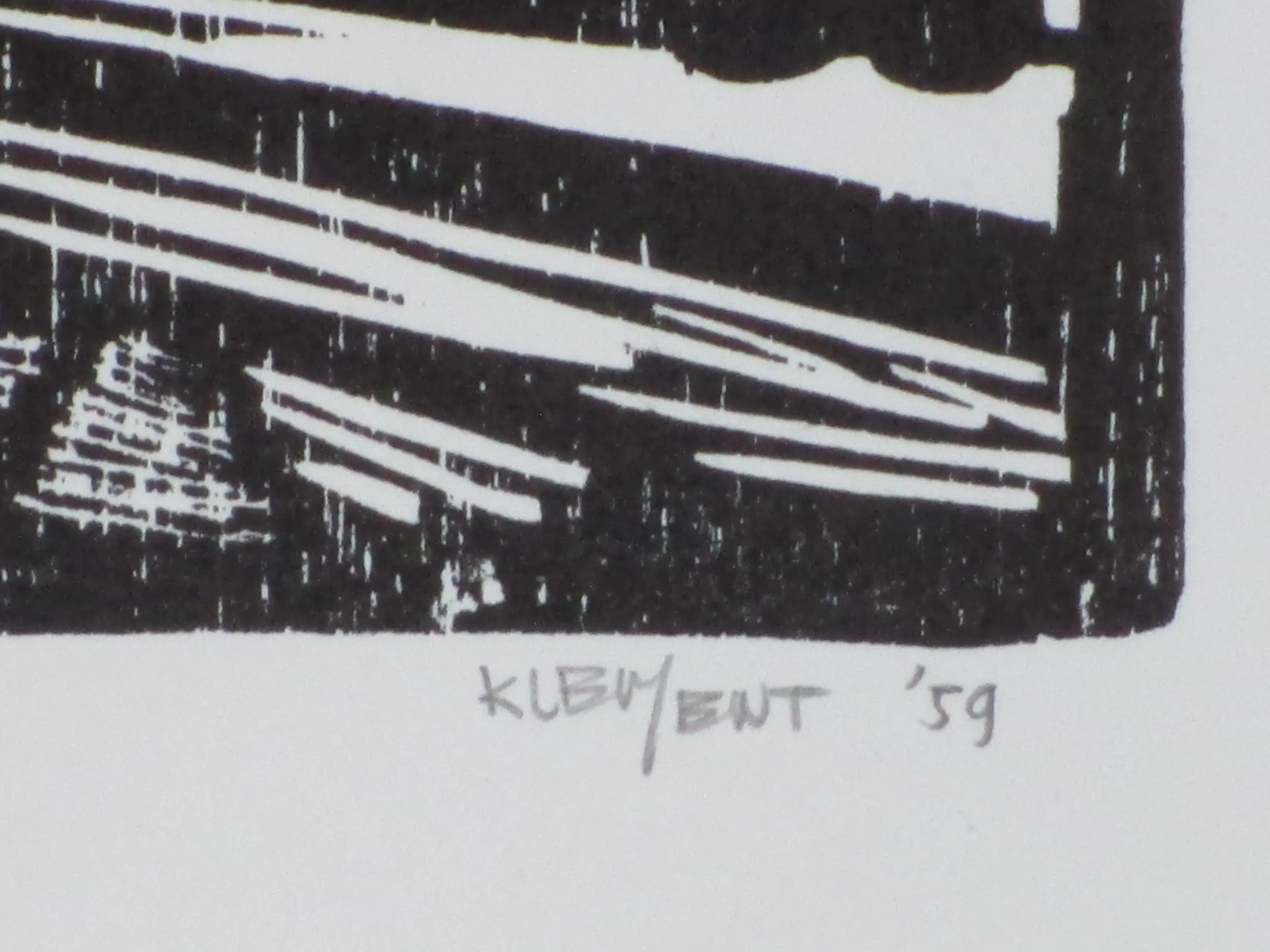 Hout/linosnede door Fon Klement Voorstelling van een haven Losbladig, beeldmaat 23x28, bladmaat 34x39 Gesigneerd en gedateerd in potlood r.o.: 'Klement '59' Getiteld in potlood l.o.: 'Haven'