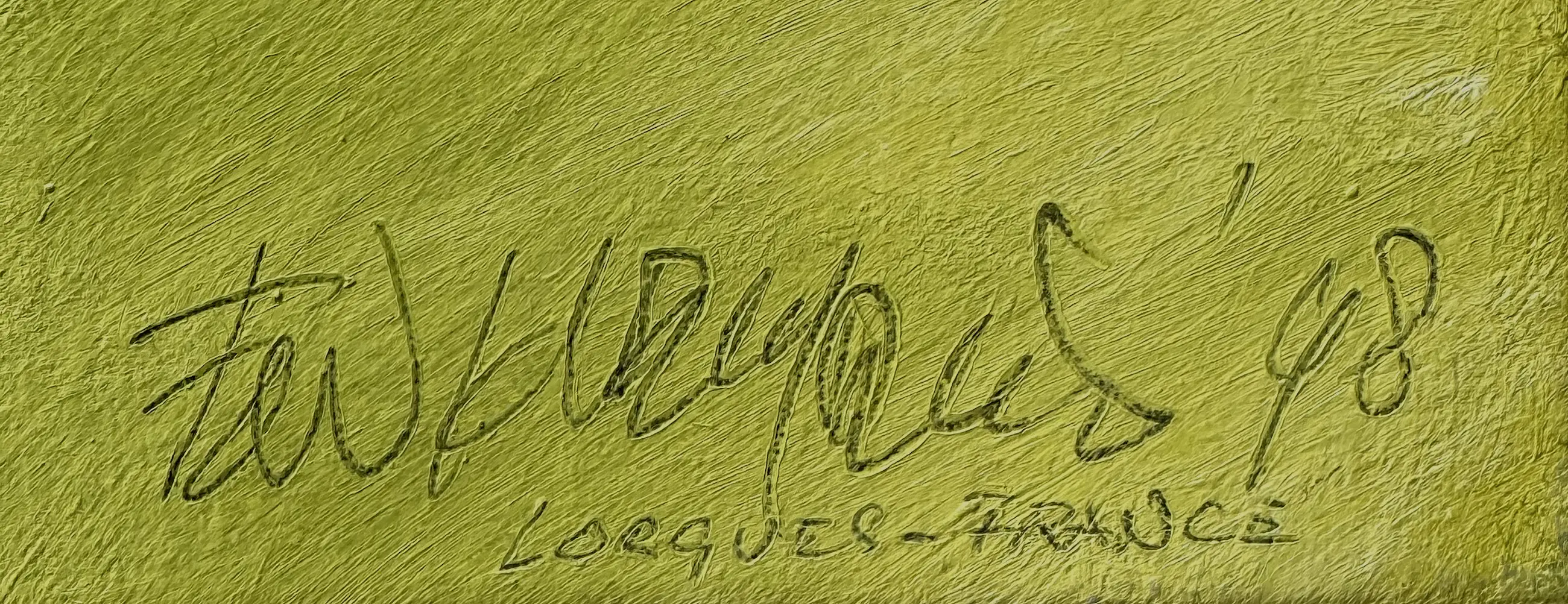Het werk is, rechts onderaan gesigneerd en gedateerd, door de kunstenaar. De authenticiteit van dit werk wordt volledig gegarandeerd. Een certificaat van echtheid kan, op aanvraag, na aankoop en betaling van het werk worden gemaild.