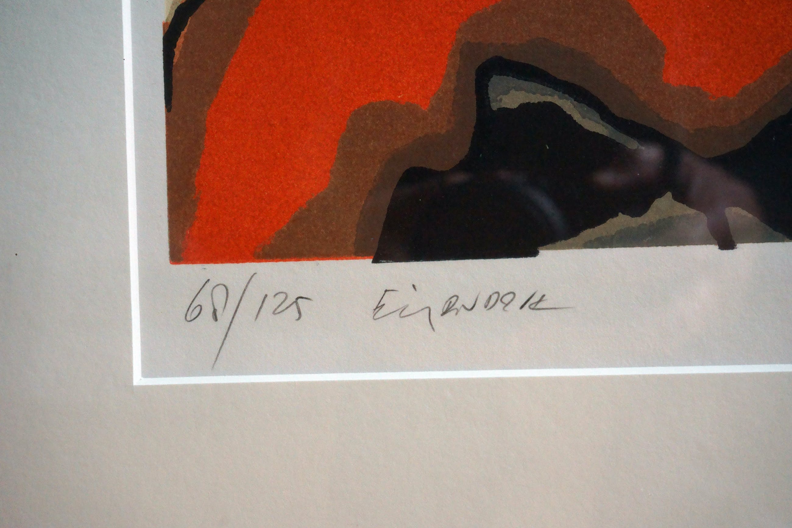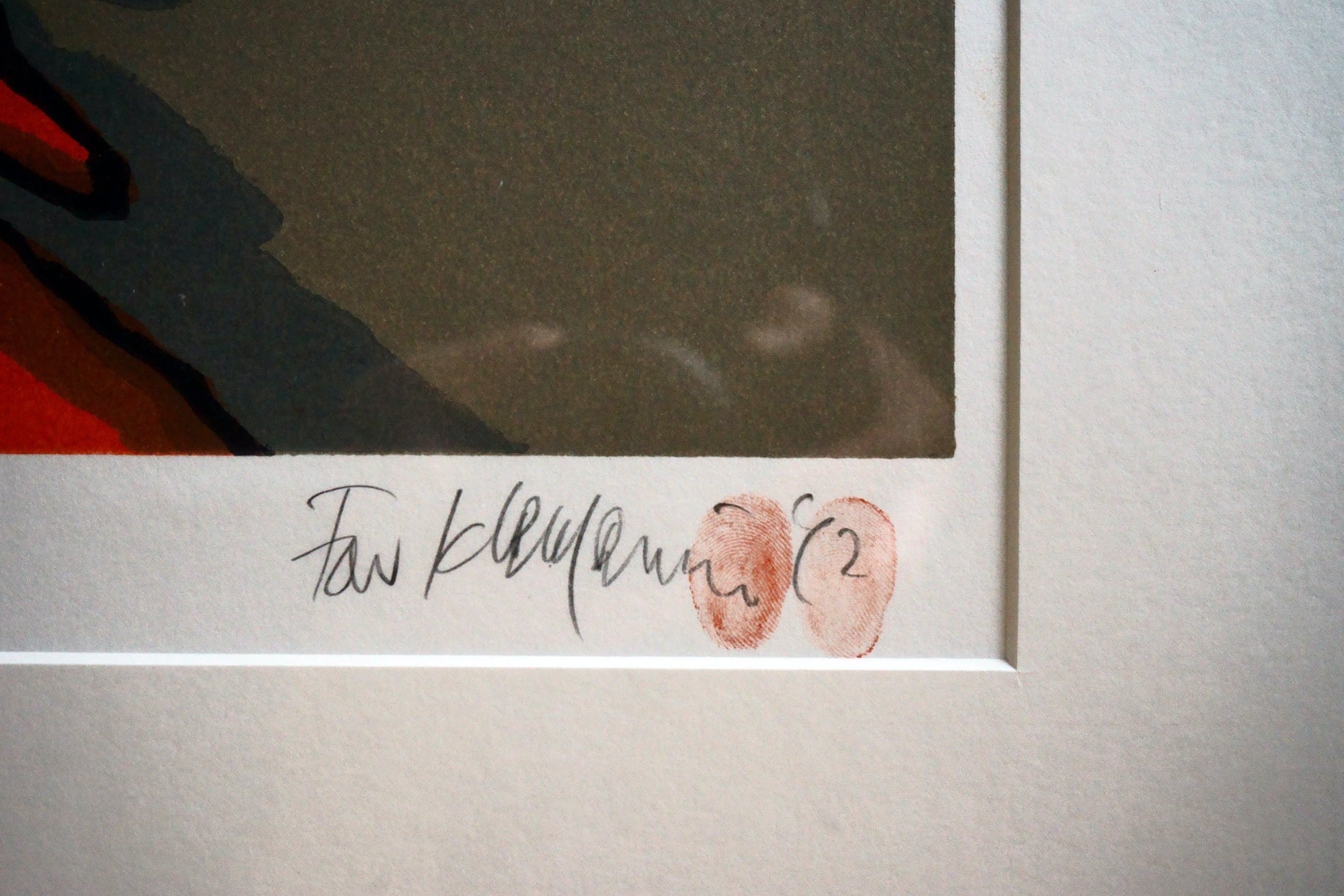Mooie en in uitmuntende staat verkerende boardsnede van Fon Klement. Ingelijst in een moderne zilverkleurige lijst. Handgesigneerd en genummerd: 68/125.
