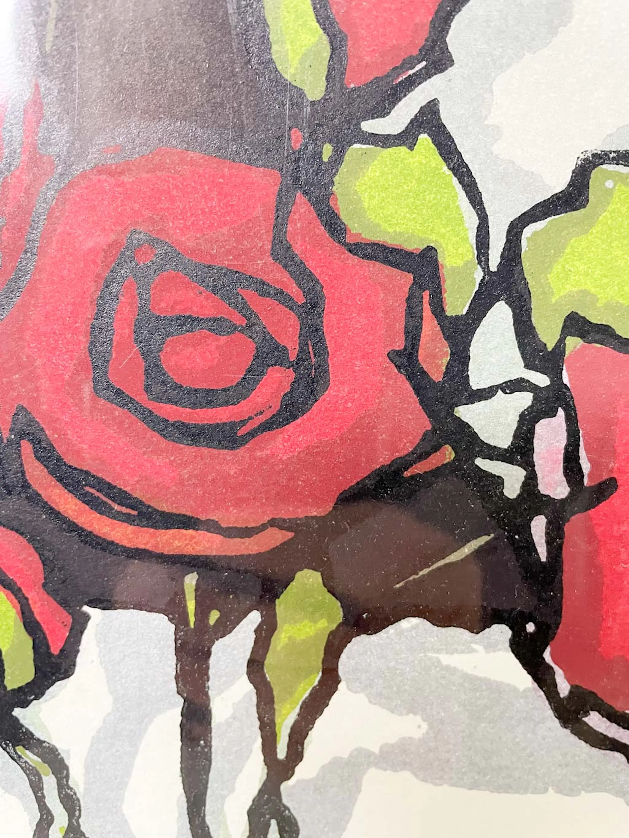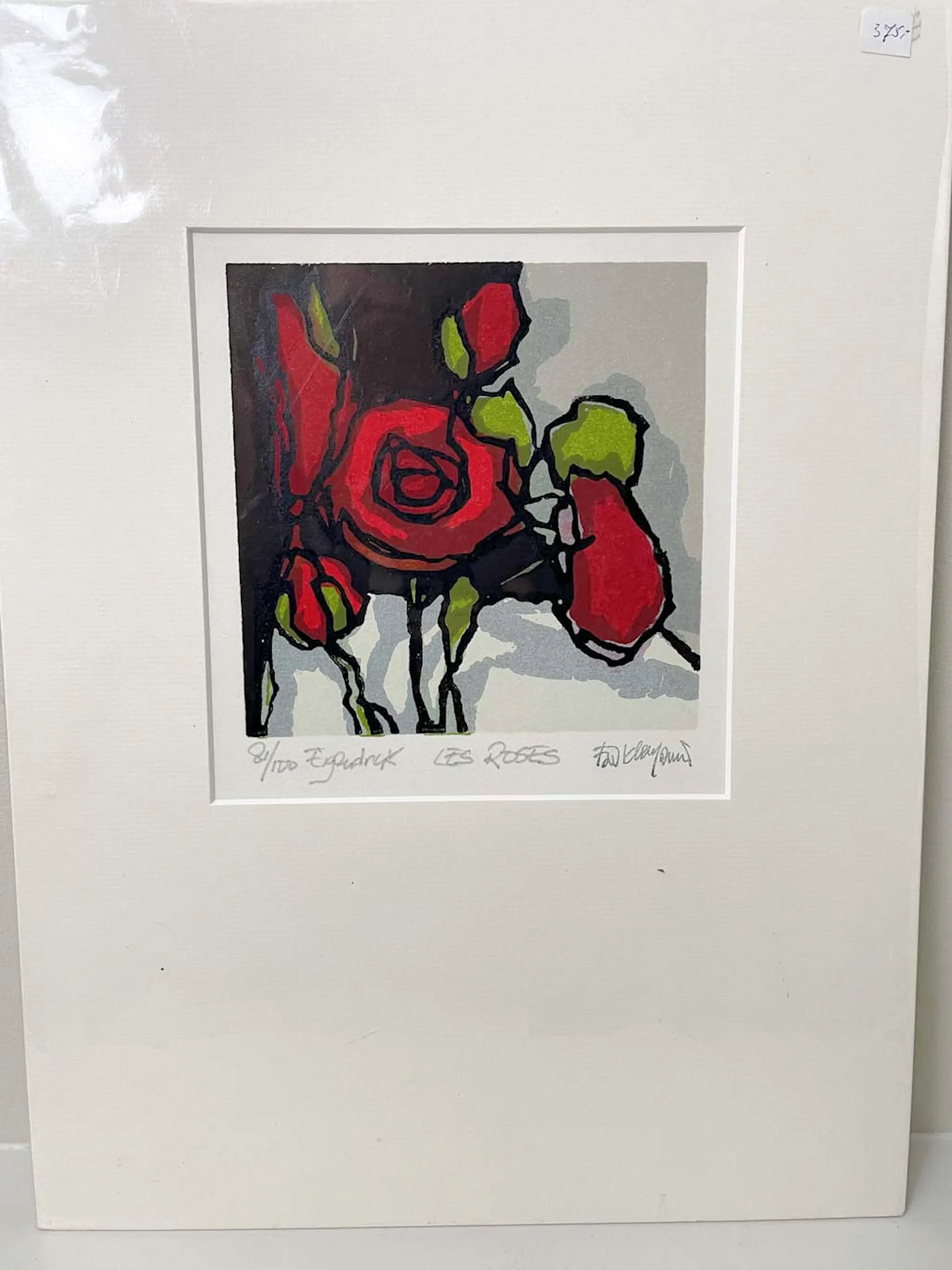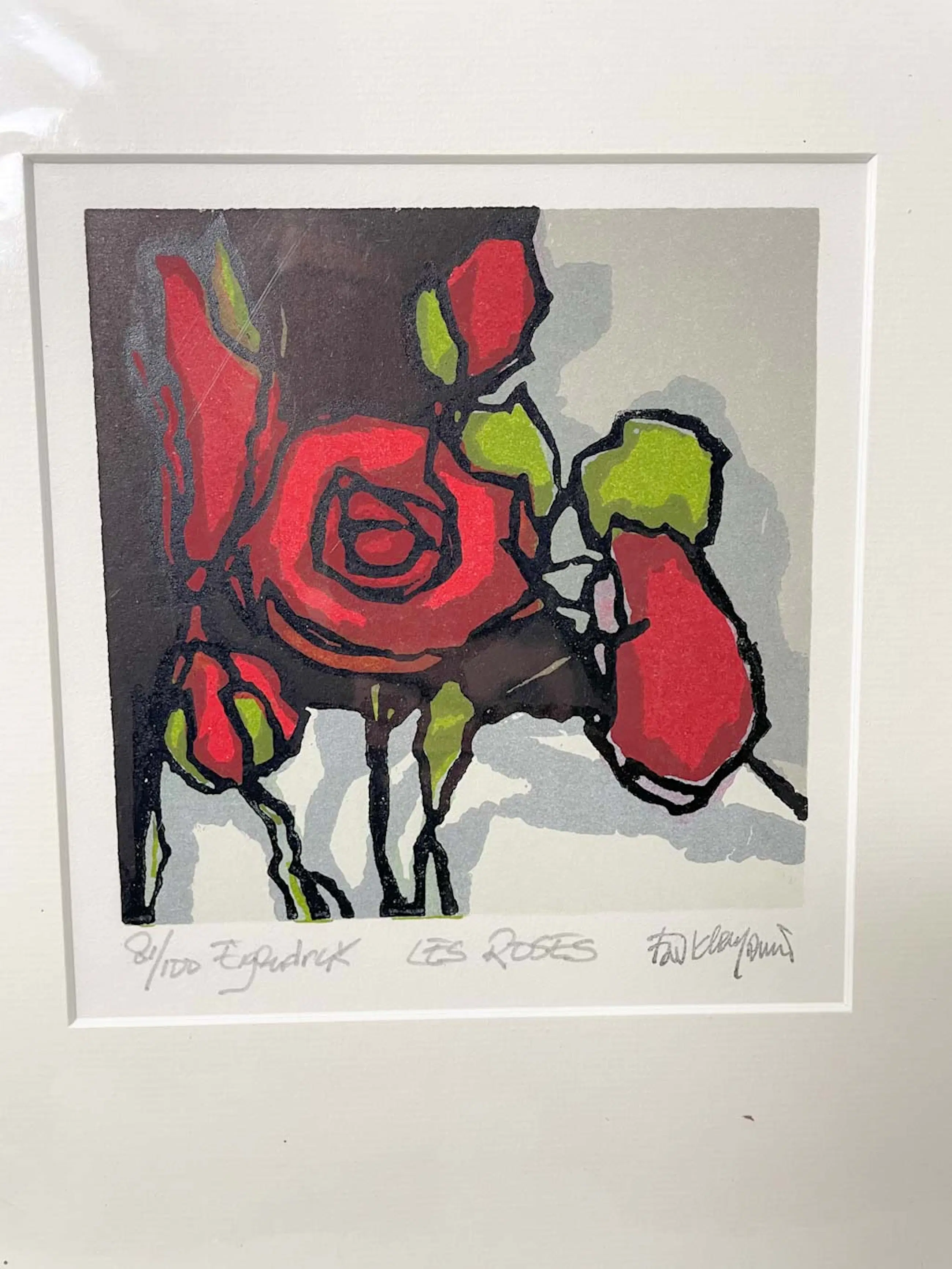 Schitterende hout/linosnede van rode rozen Direct van kunstenaar Verpakt in cellofaan vandaar wat spiegeling