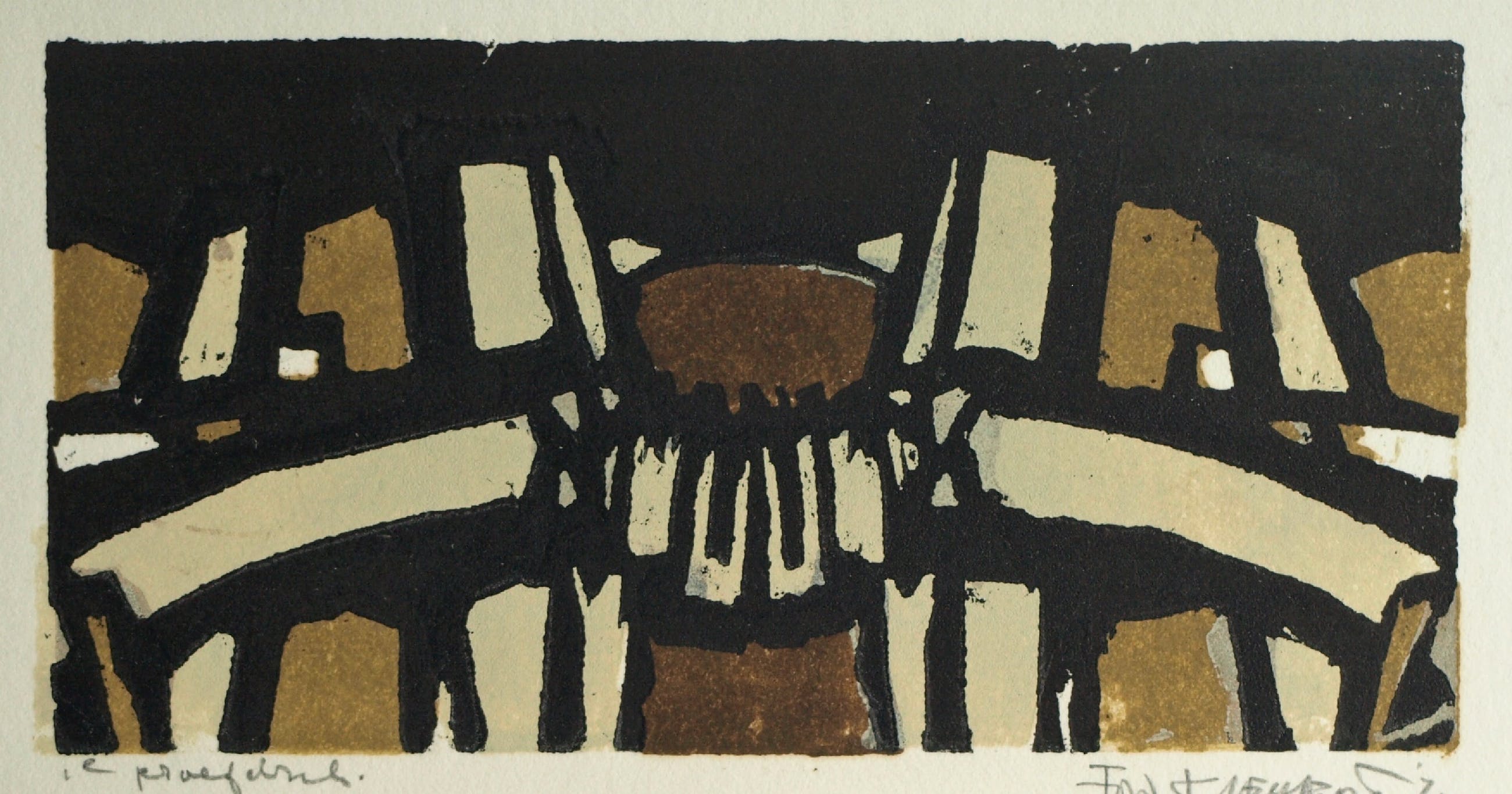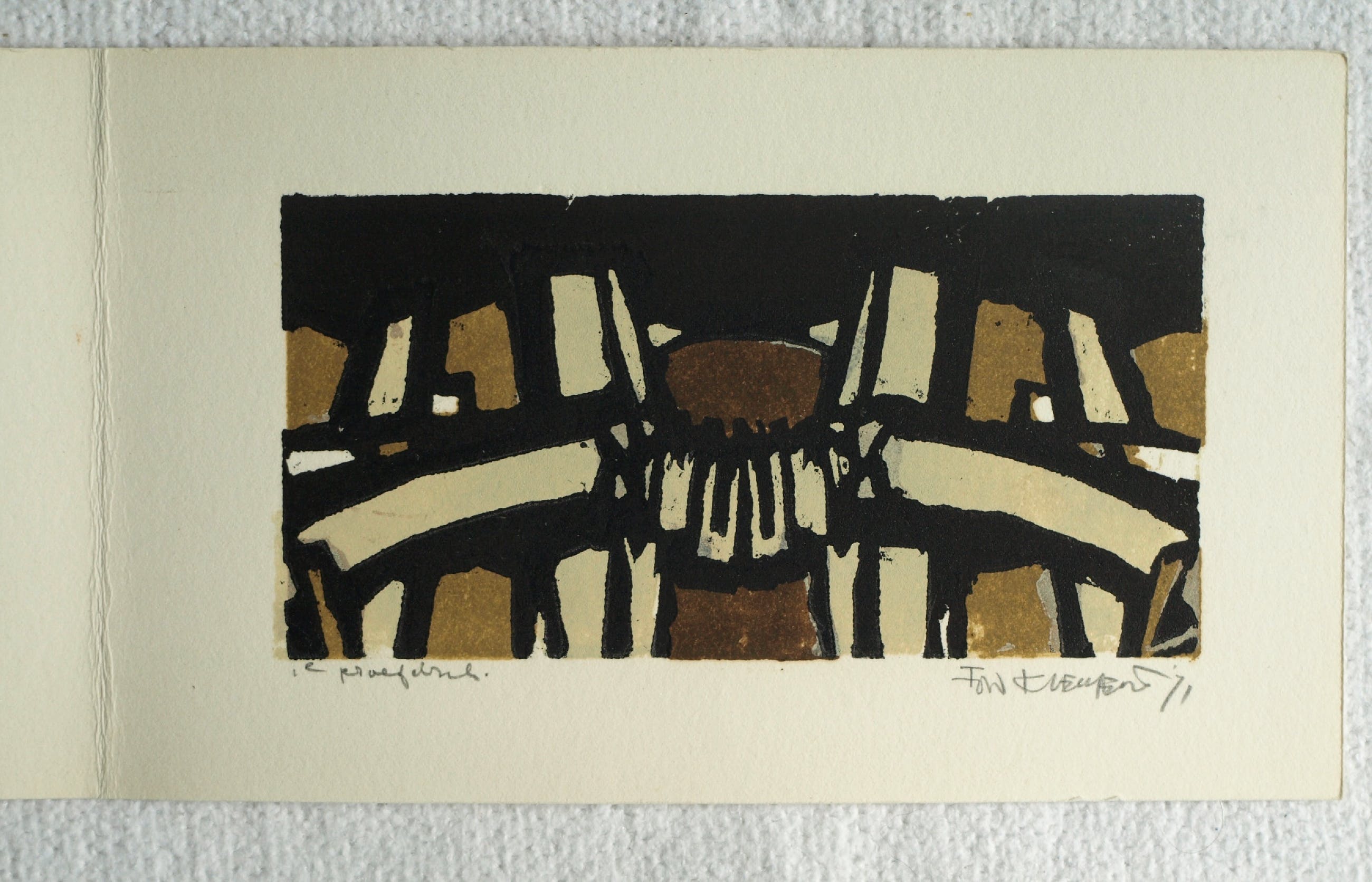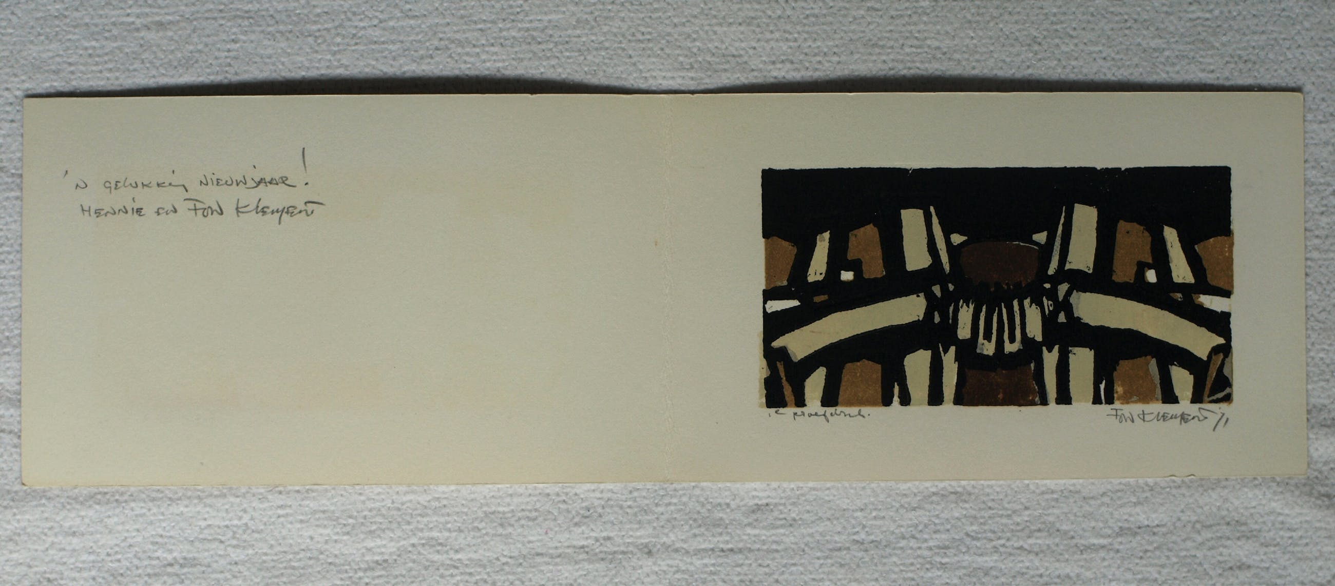 Een nieuwjaarskaart uit 1971 van de Nederlandse kunstenaar Fon Klement (1930-2000), met de proefafdruk van een boardsnede van de kunstenaar.