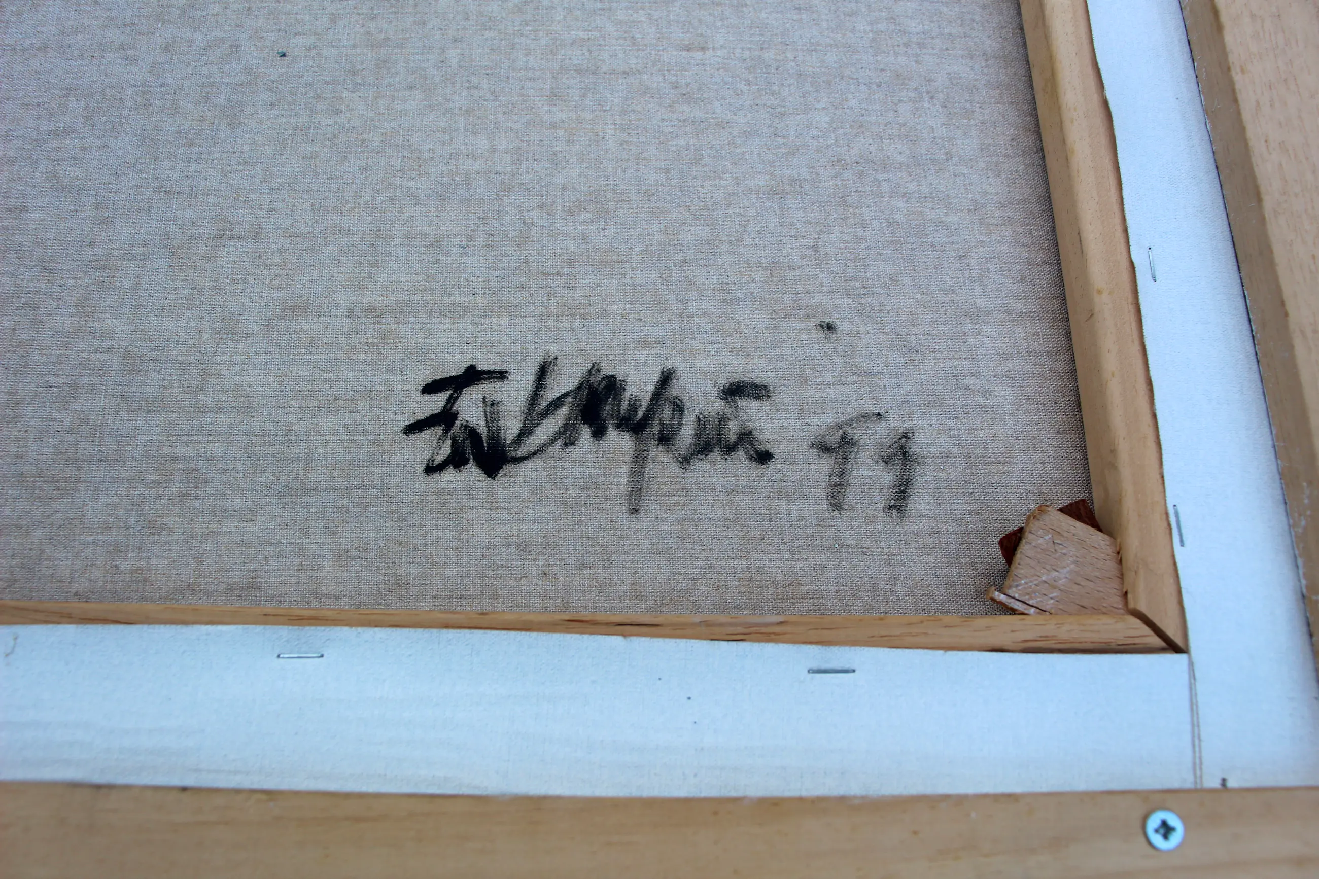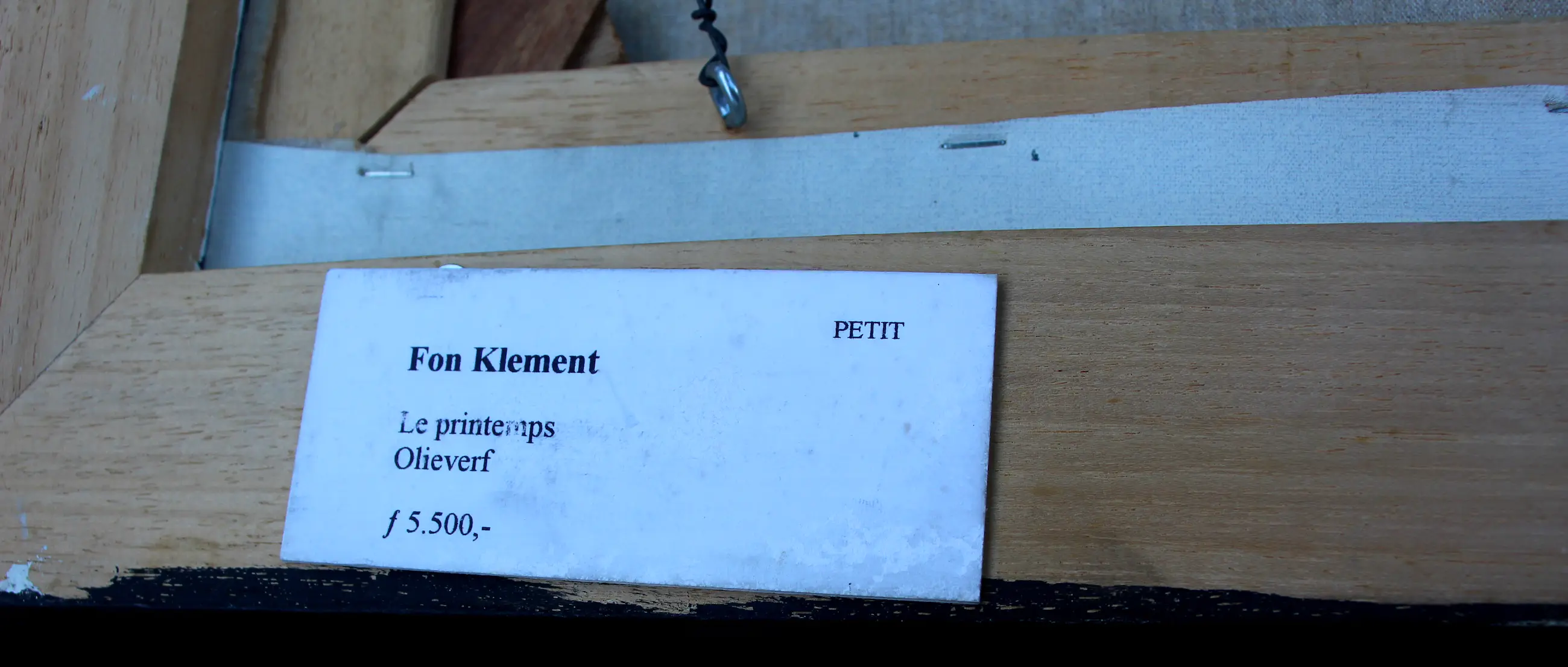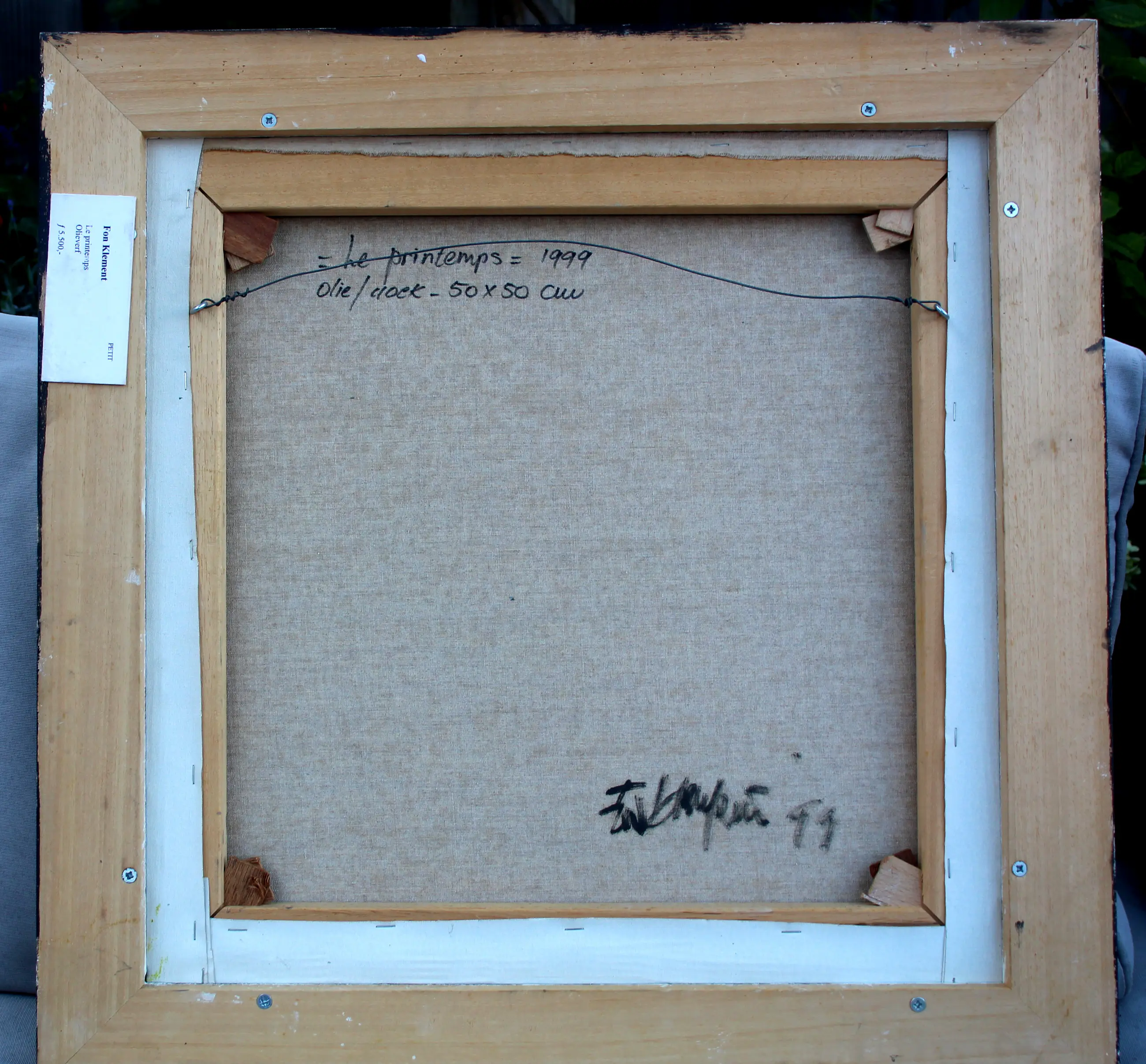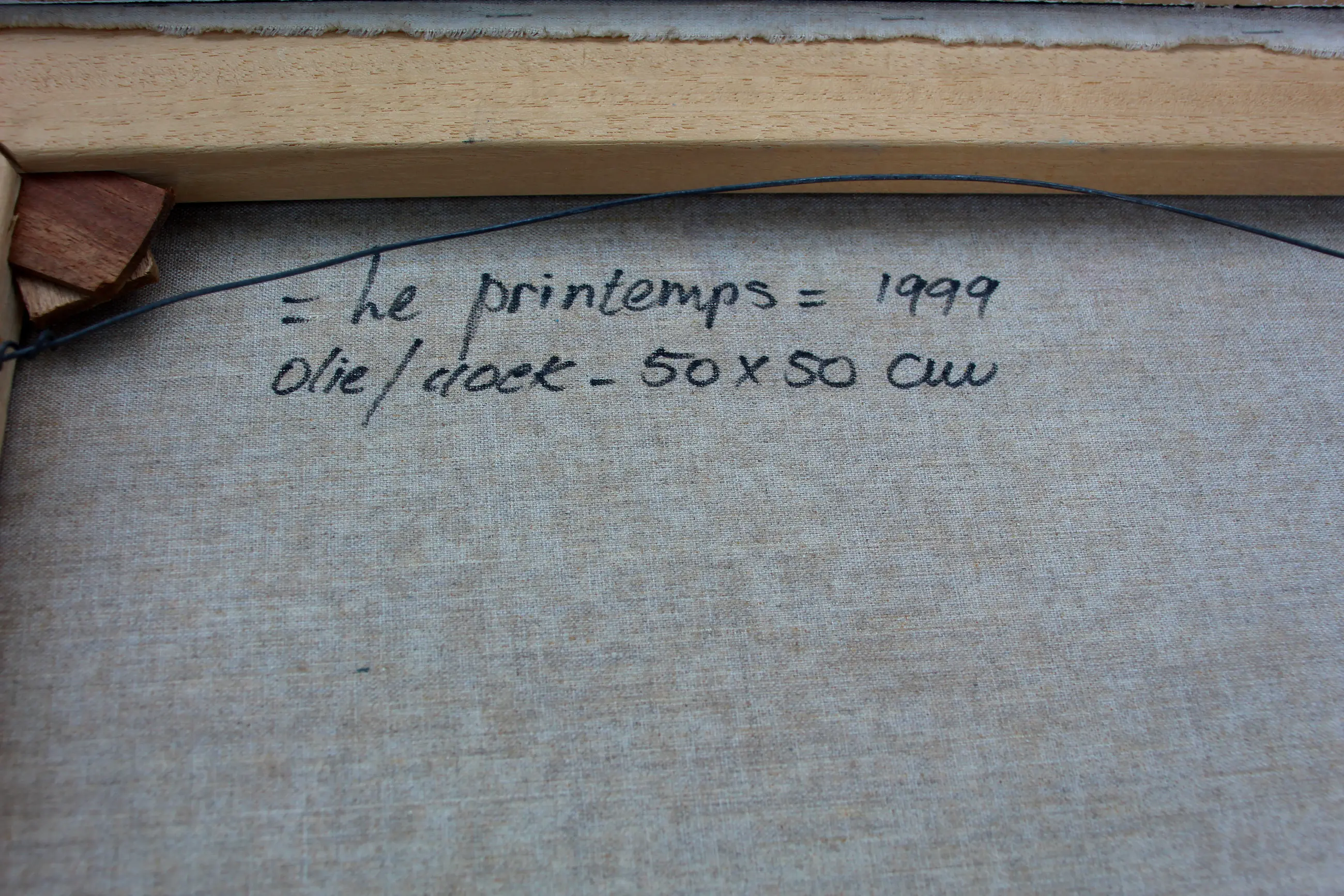 Olieverf op doek van Fon Klement uit 1999. Titel: Le printemps (de lente). Het werk is linksonder gesigneerd en gedaterd. Ook op de achterzijde is het werk gesigneerd en gedateerd. Tevens staat daar de titel, techniek en afmetingen vermeld. De galerieprijs was 5.500 gulden.