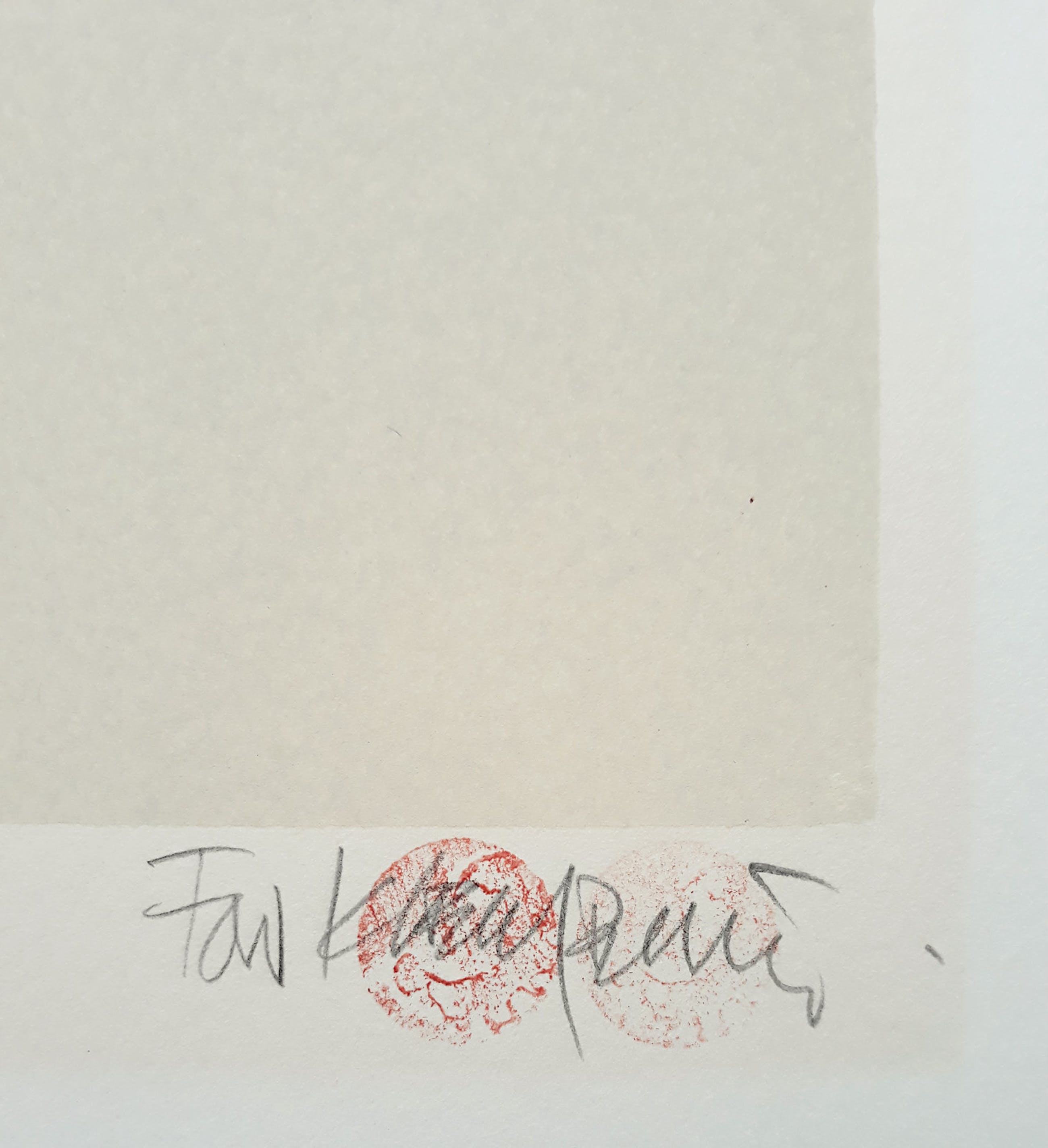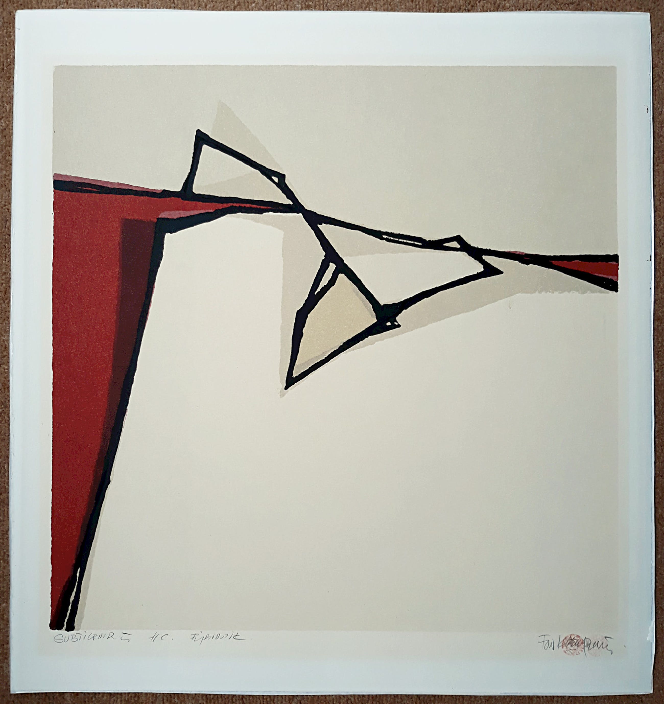 Karakteristiek, mooi werk van Fon Klement op zeer dik geschept papier. Met potlood gesigneerd en getiteld, een H.C. exemplaar. Afkomstig uit de kunstcollectie van ABNAMRO, in zeer goede conditie. Blad heeft ingelijst gezeten want er is een lichte verkleuring binnen een vorig passe-partout. Opnieuw ingelijst met passe-partout valt dit niet meer op.