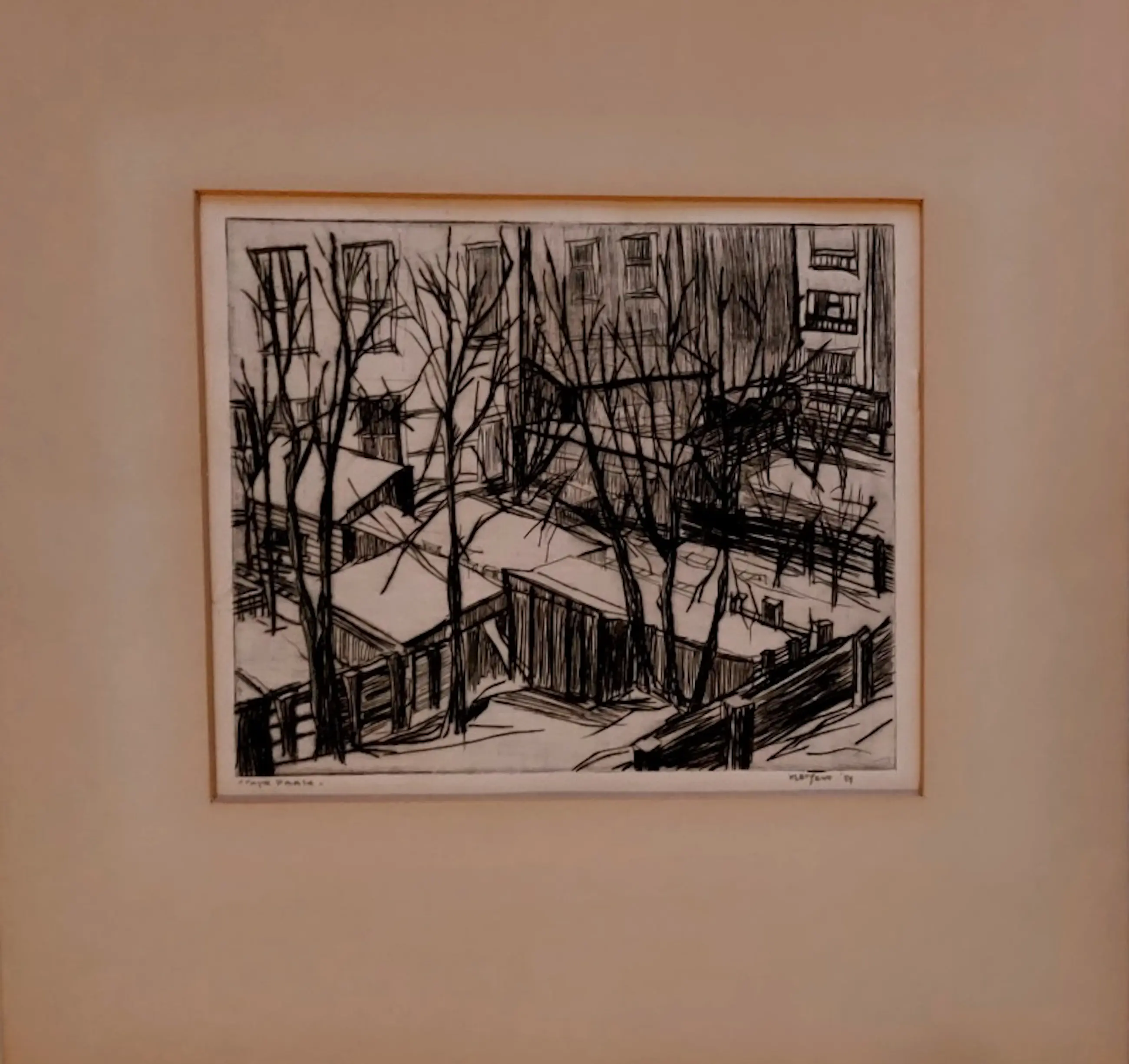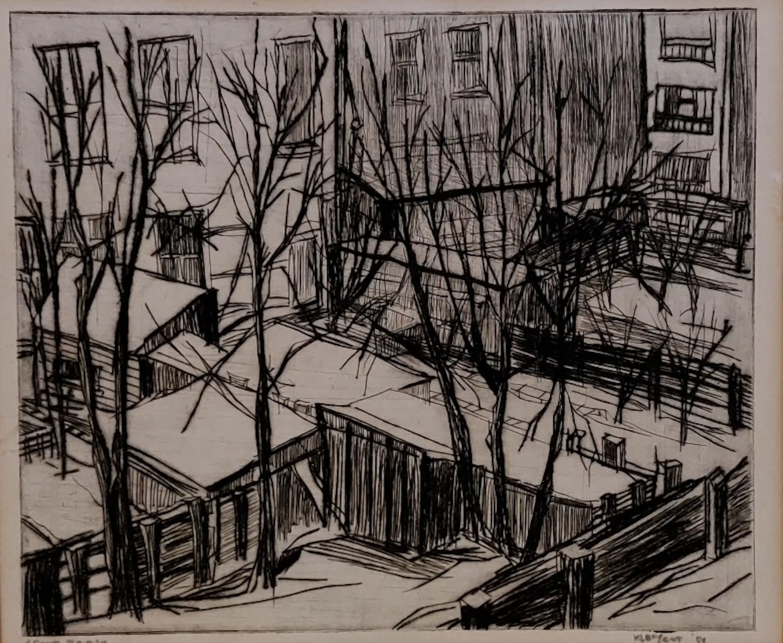 Vroeg werk uit 1959 van Fon Klement, lang voor hij zijn bekende boardsneden begon te maken. Prachtige droge naald ets in het originele passe partout. Ook de achterzijde van de originele omlijsting met beschrijving is nog aanwezig. De lijst is helaas kapot en niet meer aanwezig.