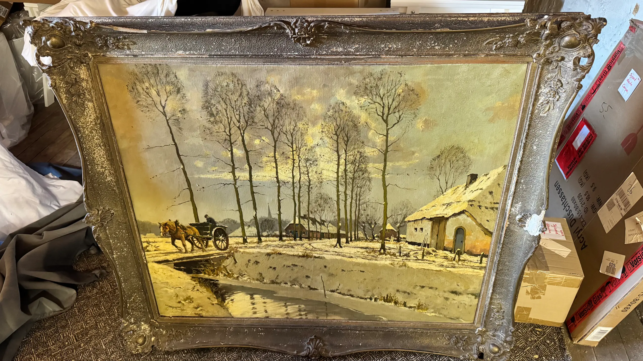Prachtig schilderij van kunstenaar Fons Verstraeten, met een sfeervol winterlandschap als onderwerp. Op het doek is een rustieke scène te zien met een paard en wagen die zich een weg banen door het besneeuwde landschap. Op de achtergrond zijn meerdere boerderijen afgebeeld, wat het geheel een warme, landelijke uitstraling geeft.