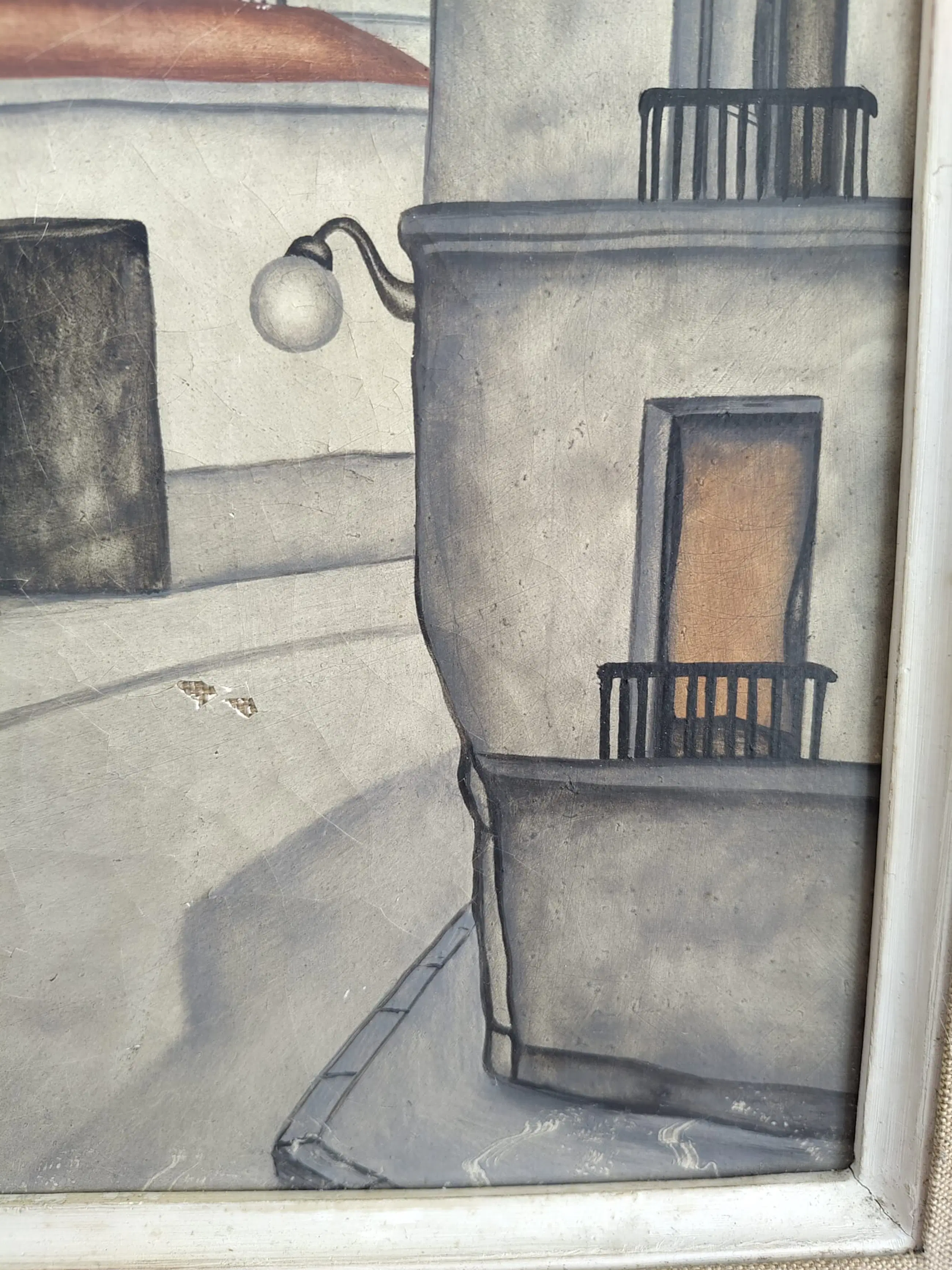 Het werk vertoont scheuren en kleine gebreken die alleen bij nauwkeurige inspectie zichtbaar zijn.