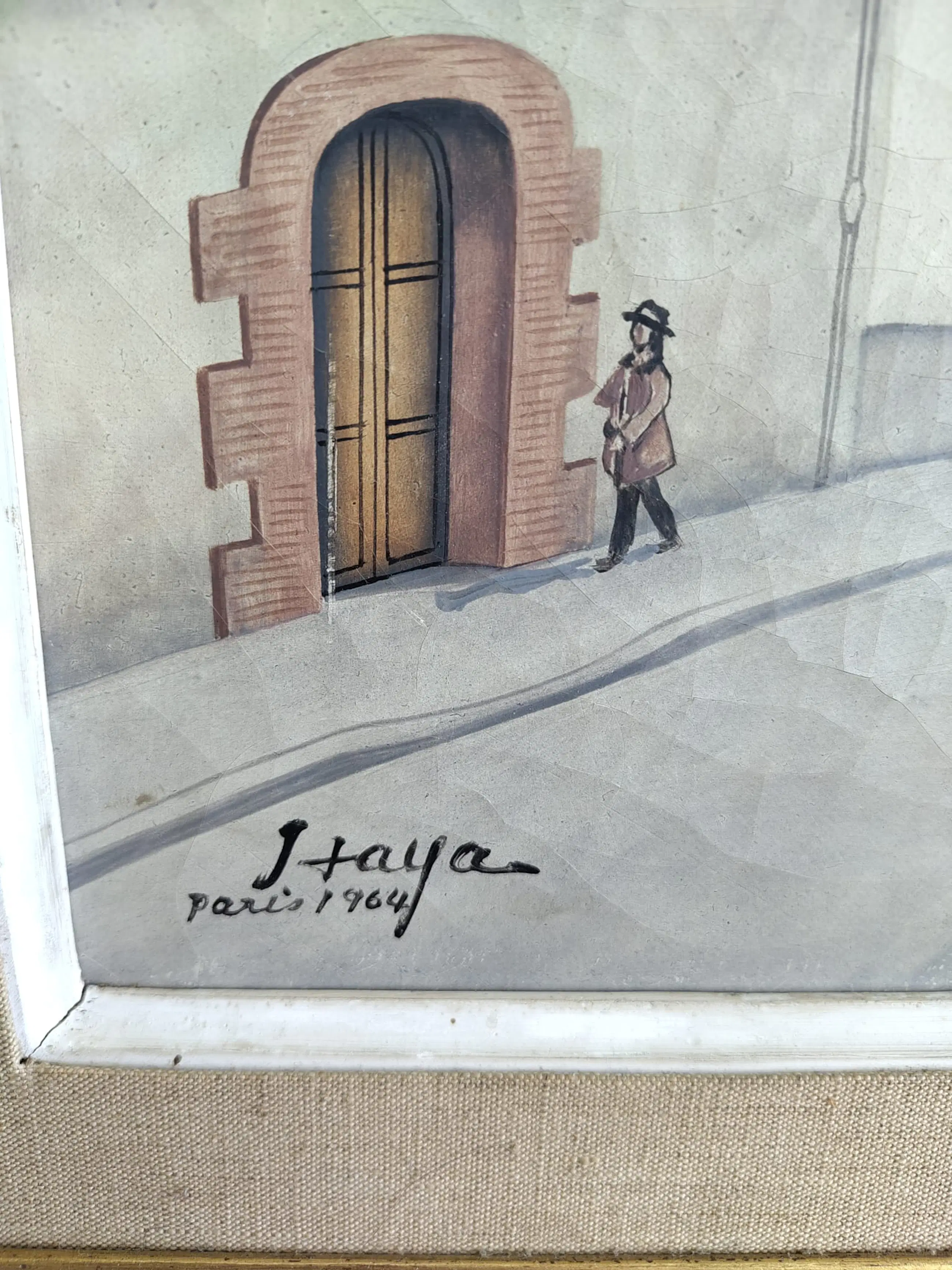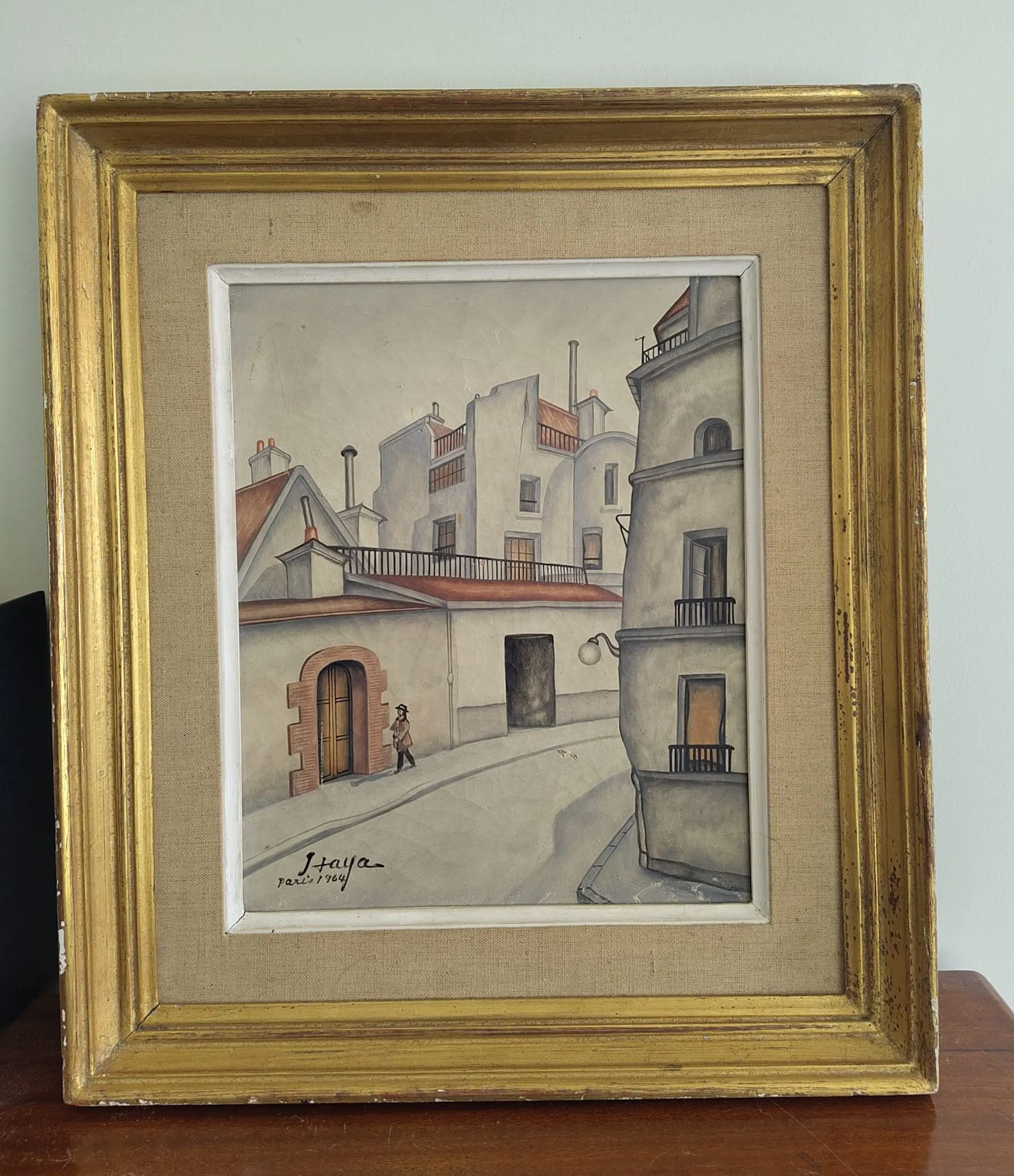 Een Parijse scène, gecreëerd in 1964 door Foussa Itaya, een Frans-Japanse kunstenaar, wiens werk zich onderscheidt door een poëtische en verfijnde benadering van de Parijse architectuur en het stadsleven.
