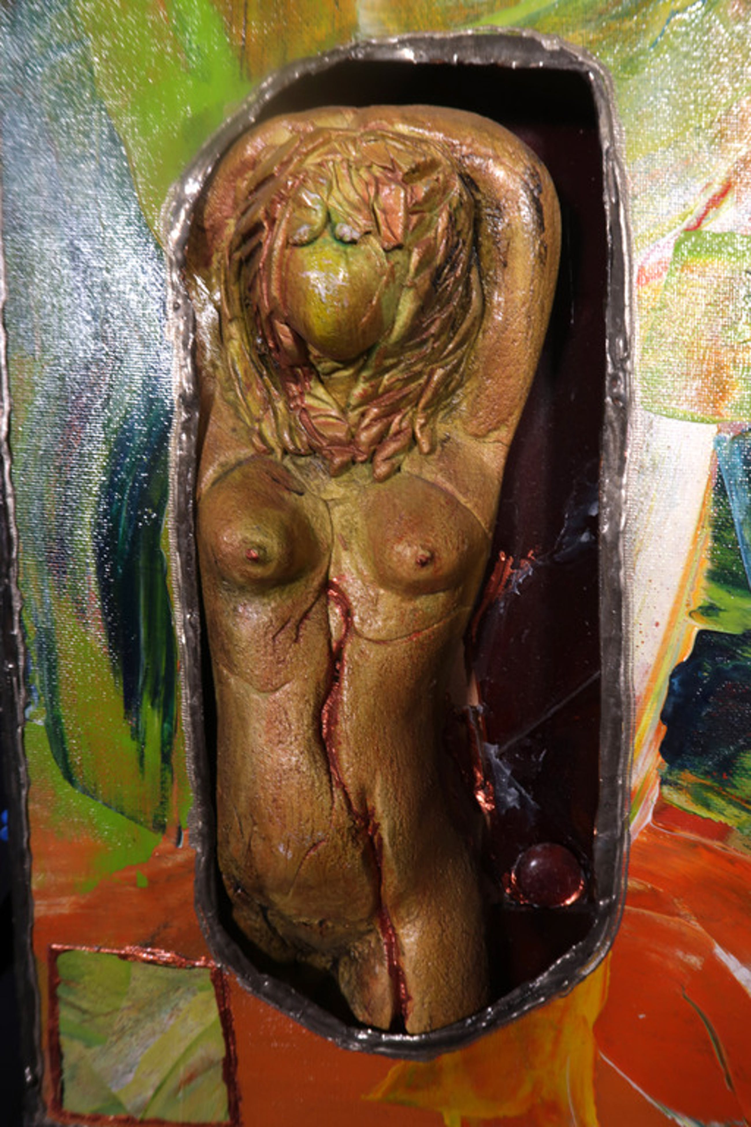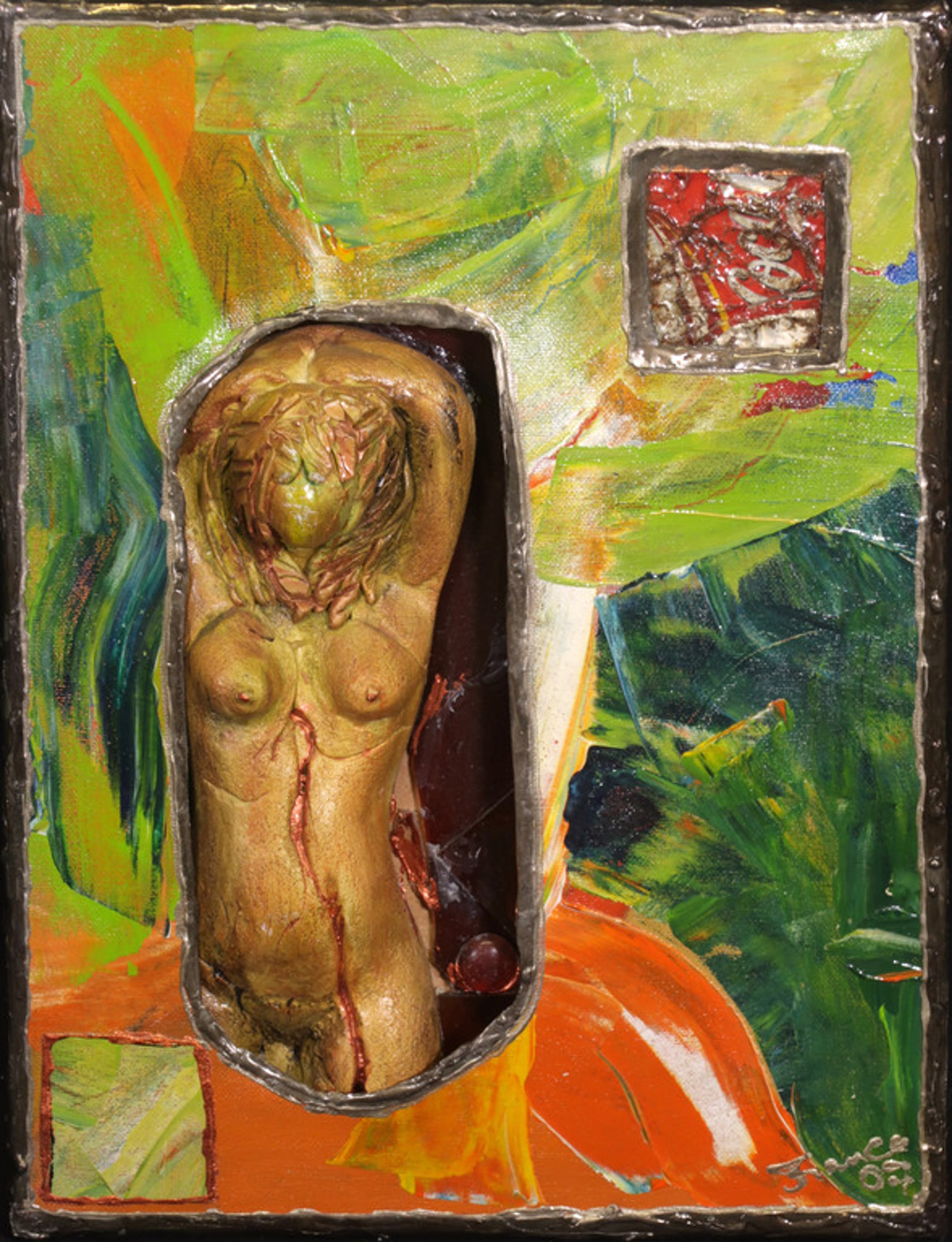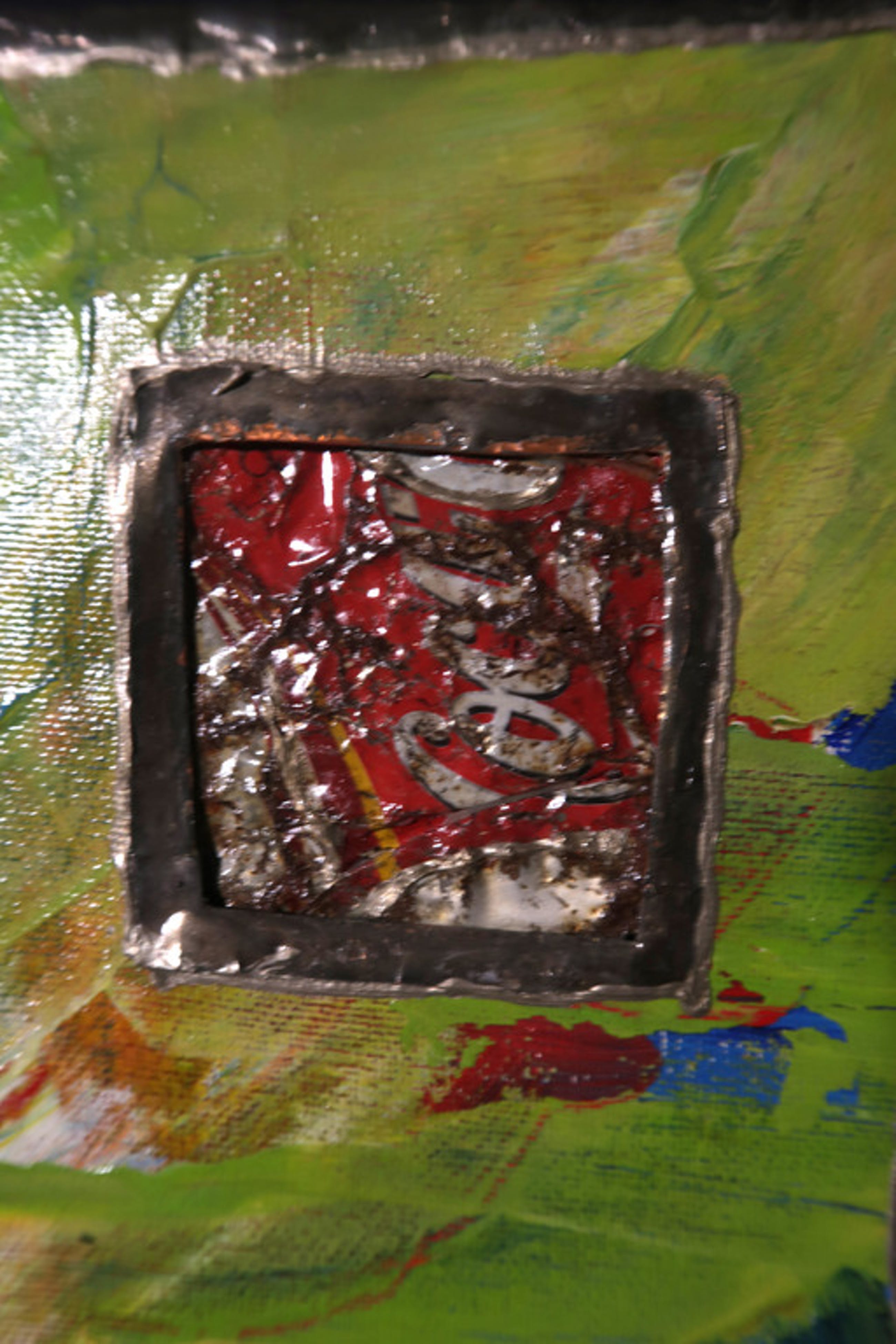 Materiaal: Olieverf en collage op doek. Voorzien van loden afwerking rondom, met sculptuur en glazen elementen