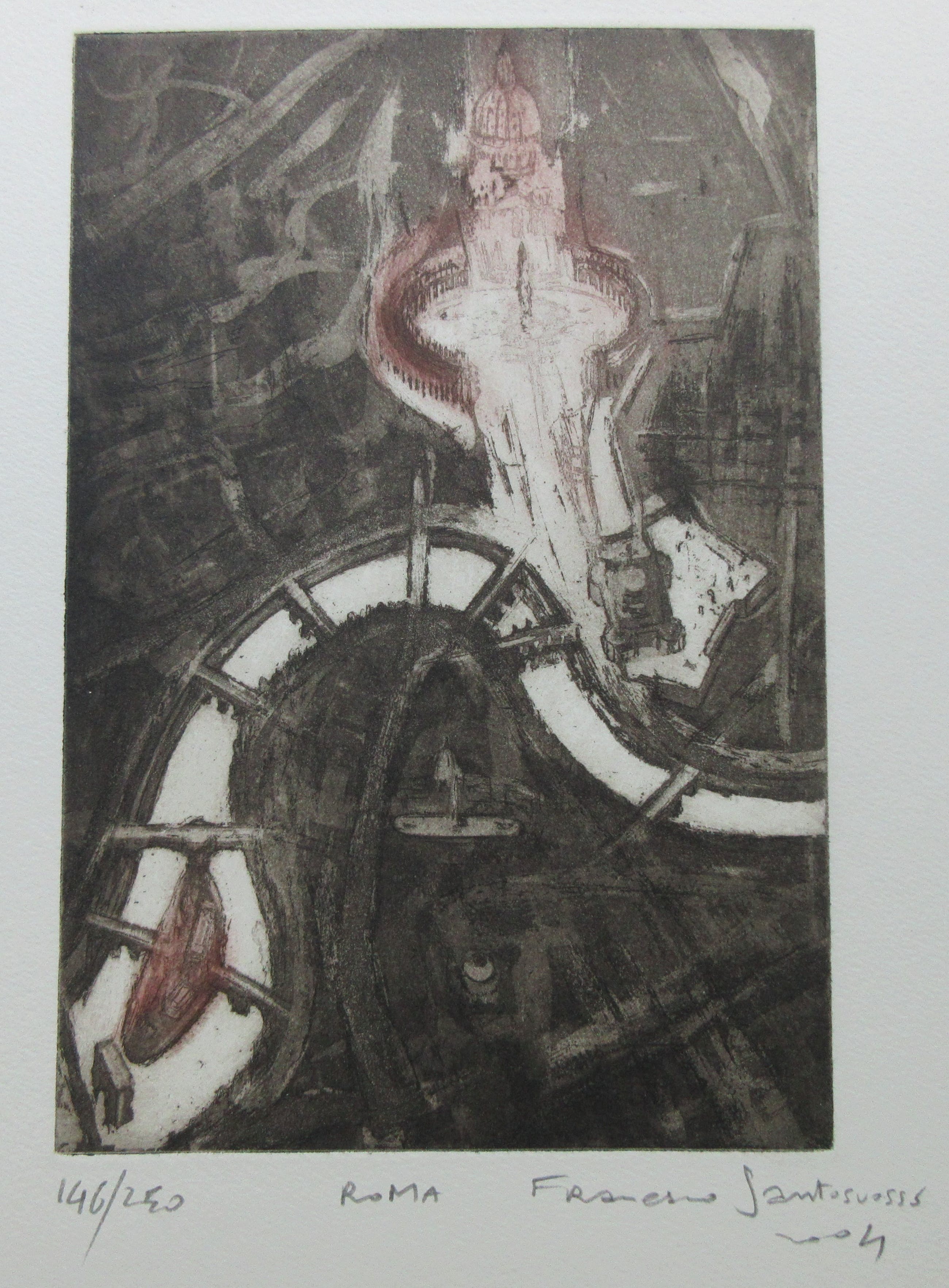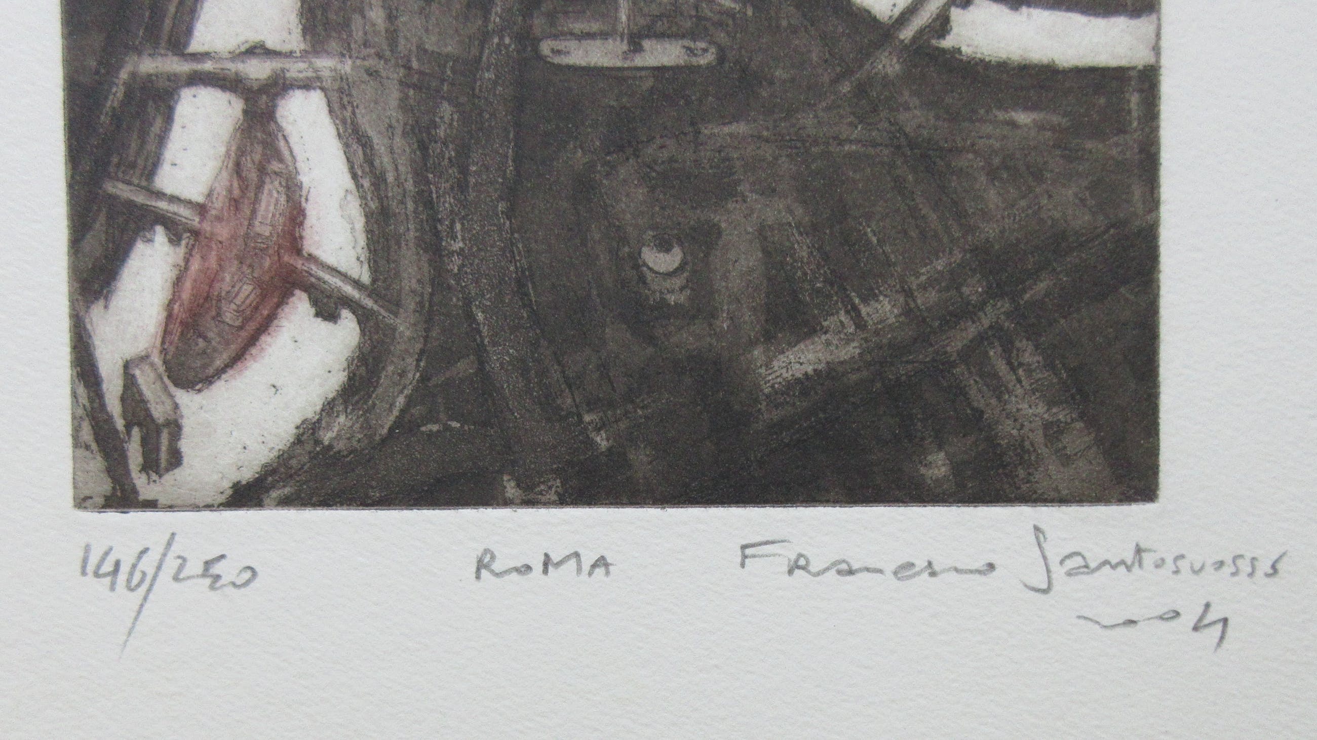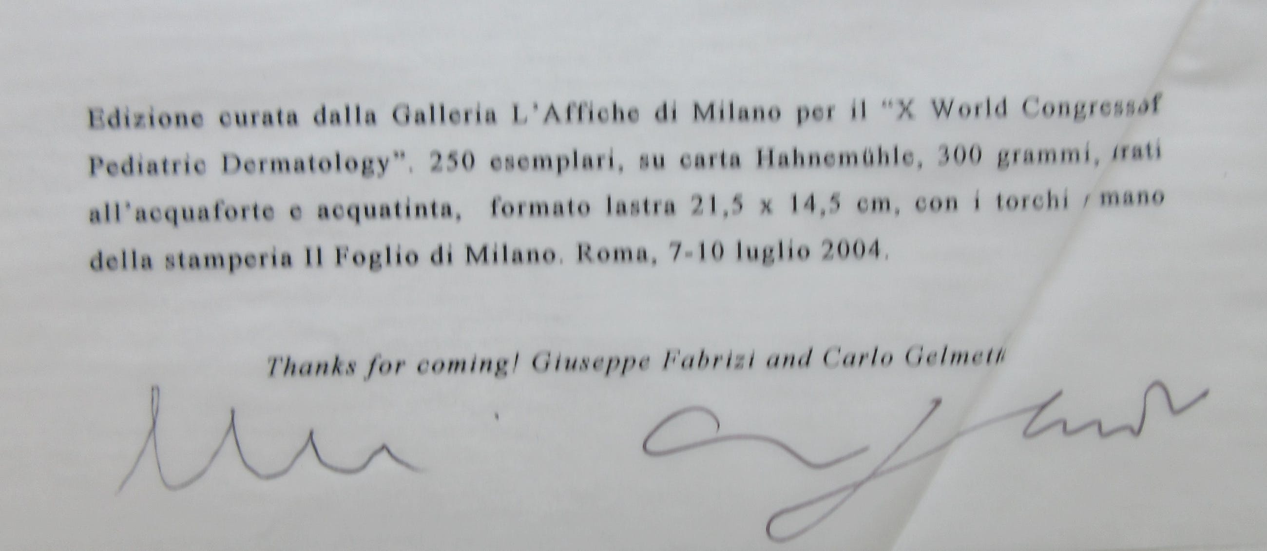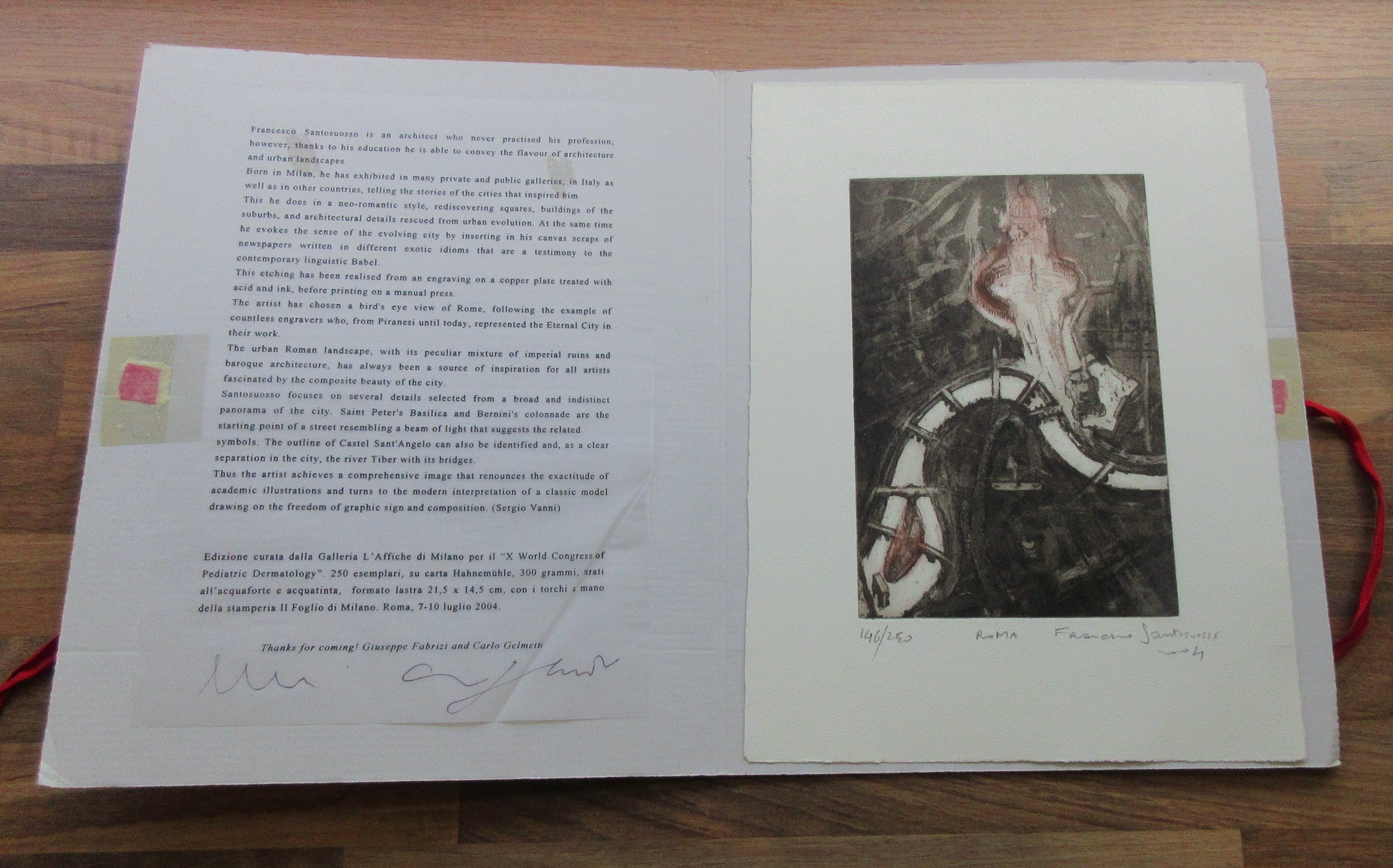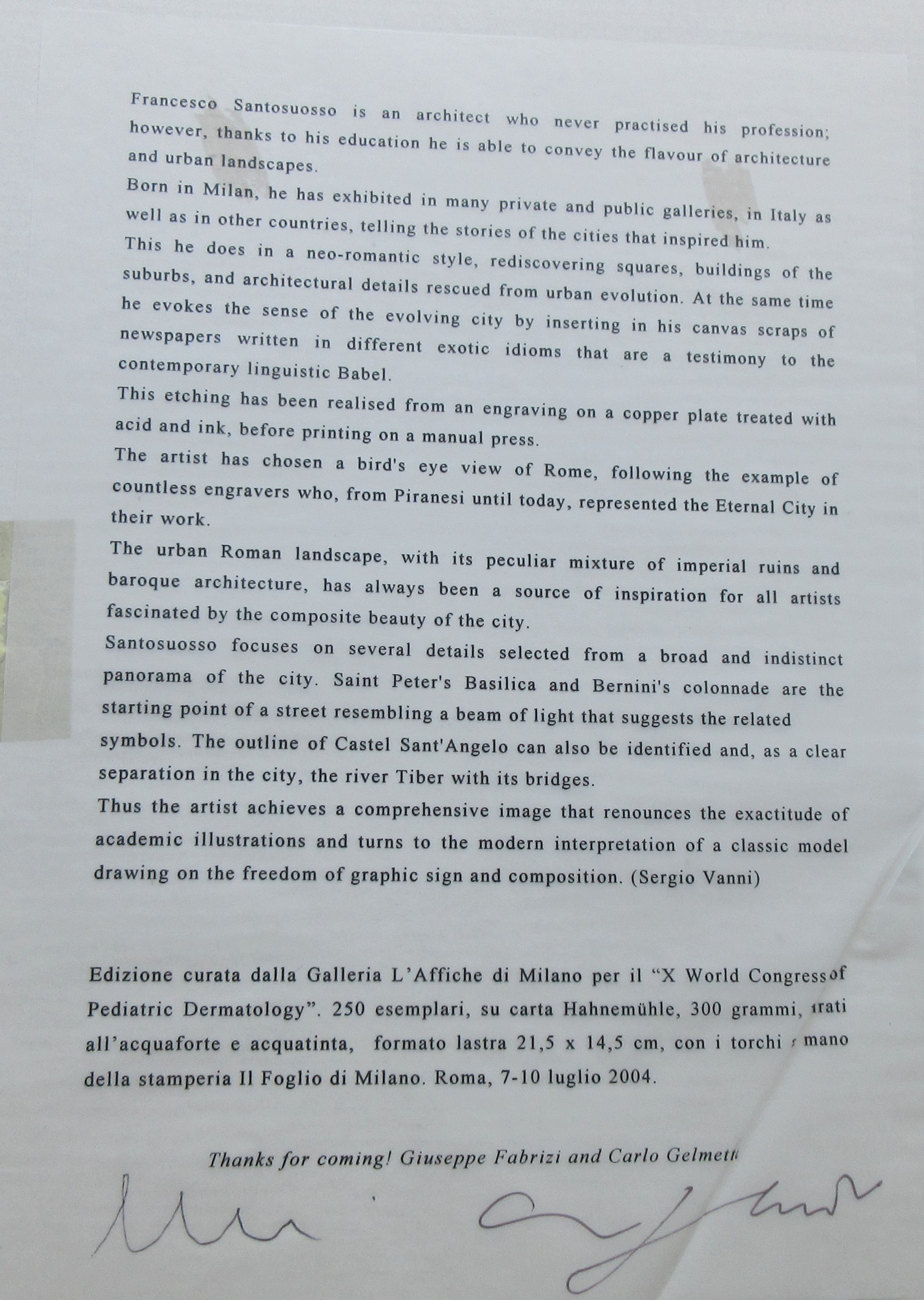Erg mooie Aquatint en Aquaforte van Rome gemaakt door de Milanese kunstenaar Francesco Santosuosso in 2004 voor het X Wereld Congres van Pedriatische Dermatology in Milaan. De ets is gemaakt in oplage van 250 stuks, dit is nummer 146. De ets is gedrukt op origineel Hahnemühle papier van 300 gram en zit in een kartonnen map met rood lint. Op de eerste pagina wordt de persoon en het werk van Francesco Santosuosso toegelicht en staan de technische gegevens van het werk en de uitgever; Galleria L'Affiche di Milano.