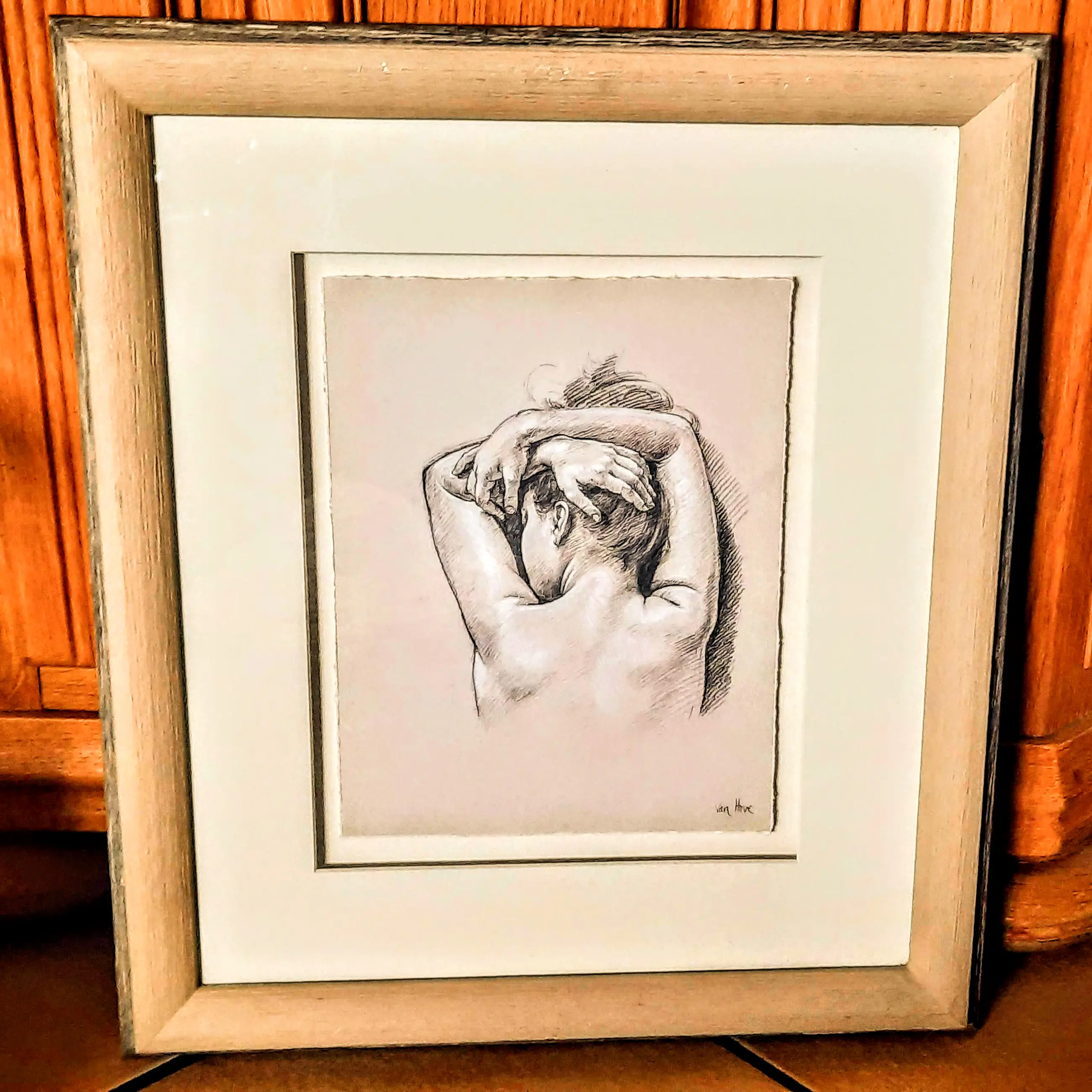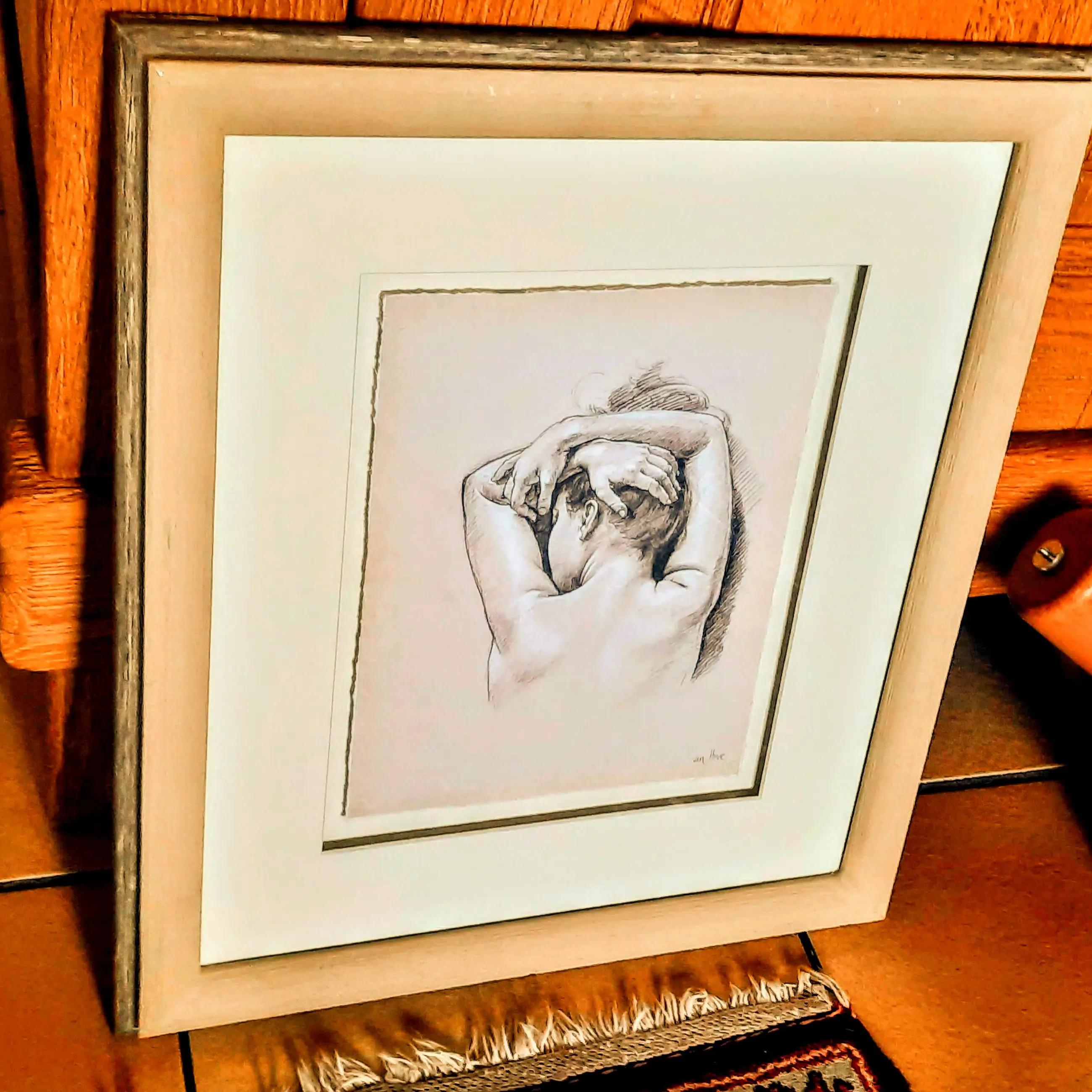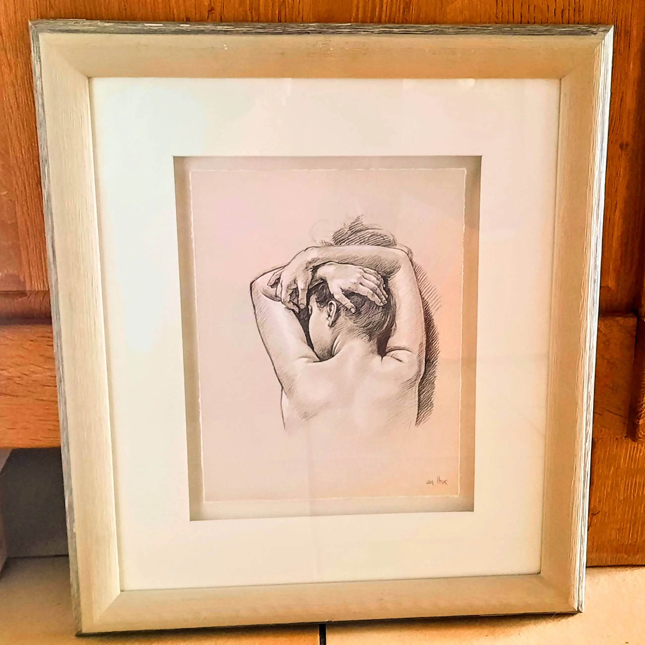 De litho toont een tekening van een naakte jonge vrouw van achteren, haar handen gevouwen boven haar hoofd. De tekening is met de hand gesigneerd door de kunstenaar in de rechteronderhoek.