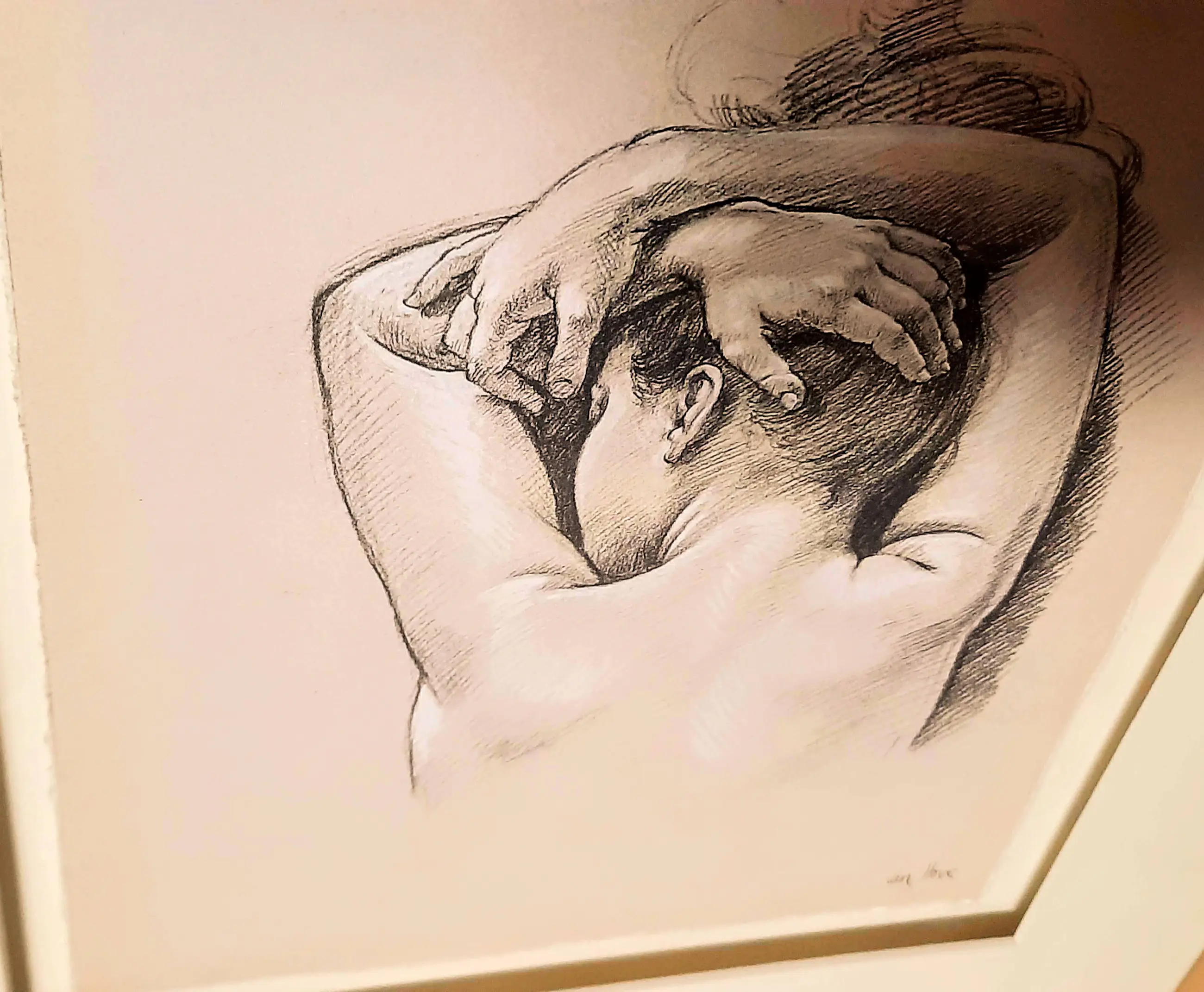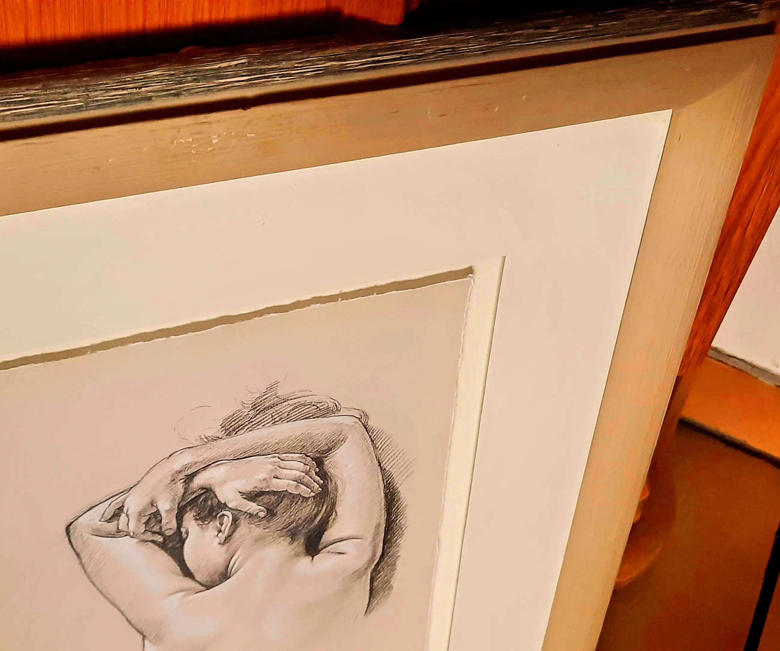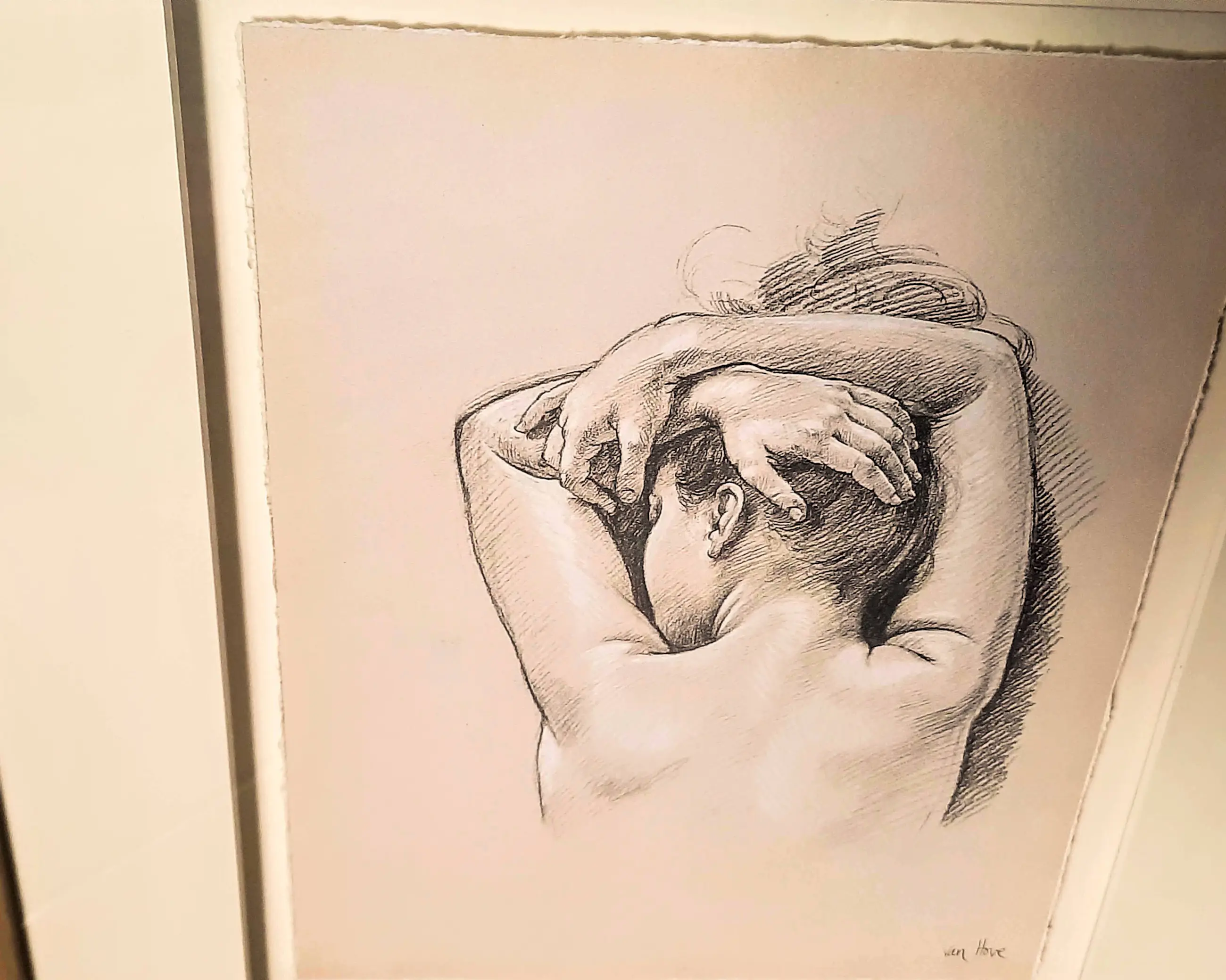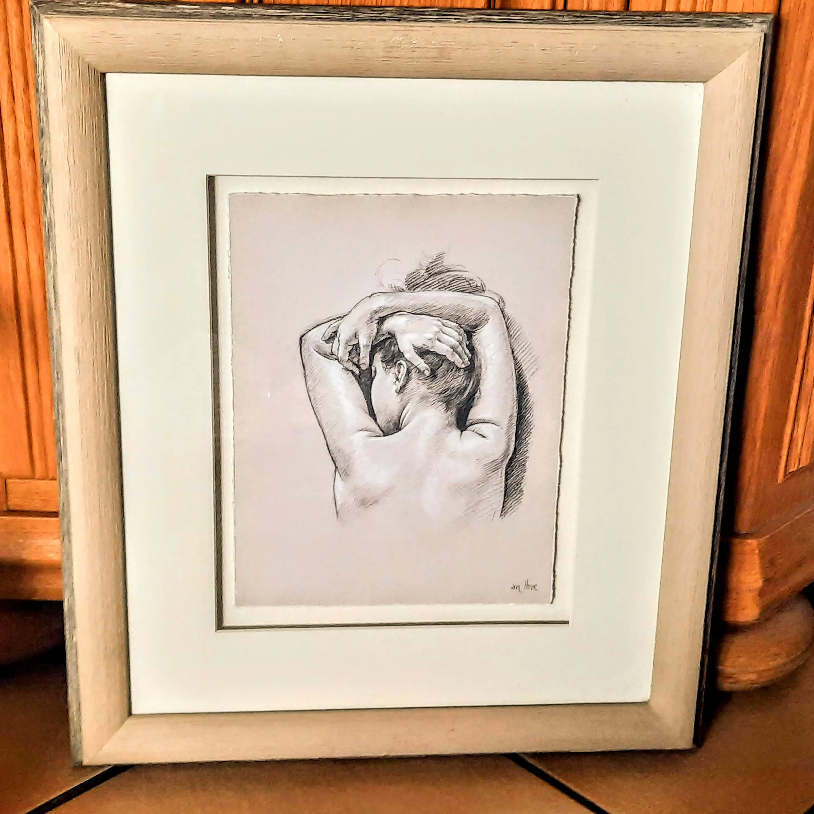 De litho toont een tekening van een naakte jonge vrouw van achteren, haar handen gevouwen boven haar hoofd. De tekening is met de hand gesigneerd door de kunstenaar in de rechteronderhoek.