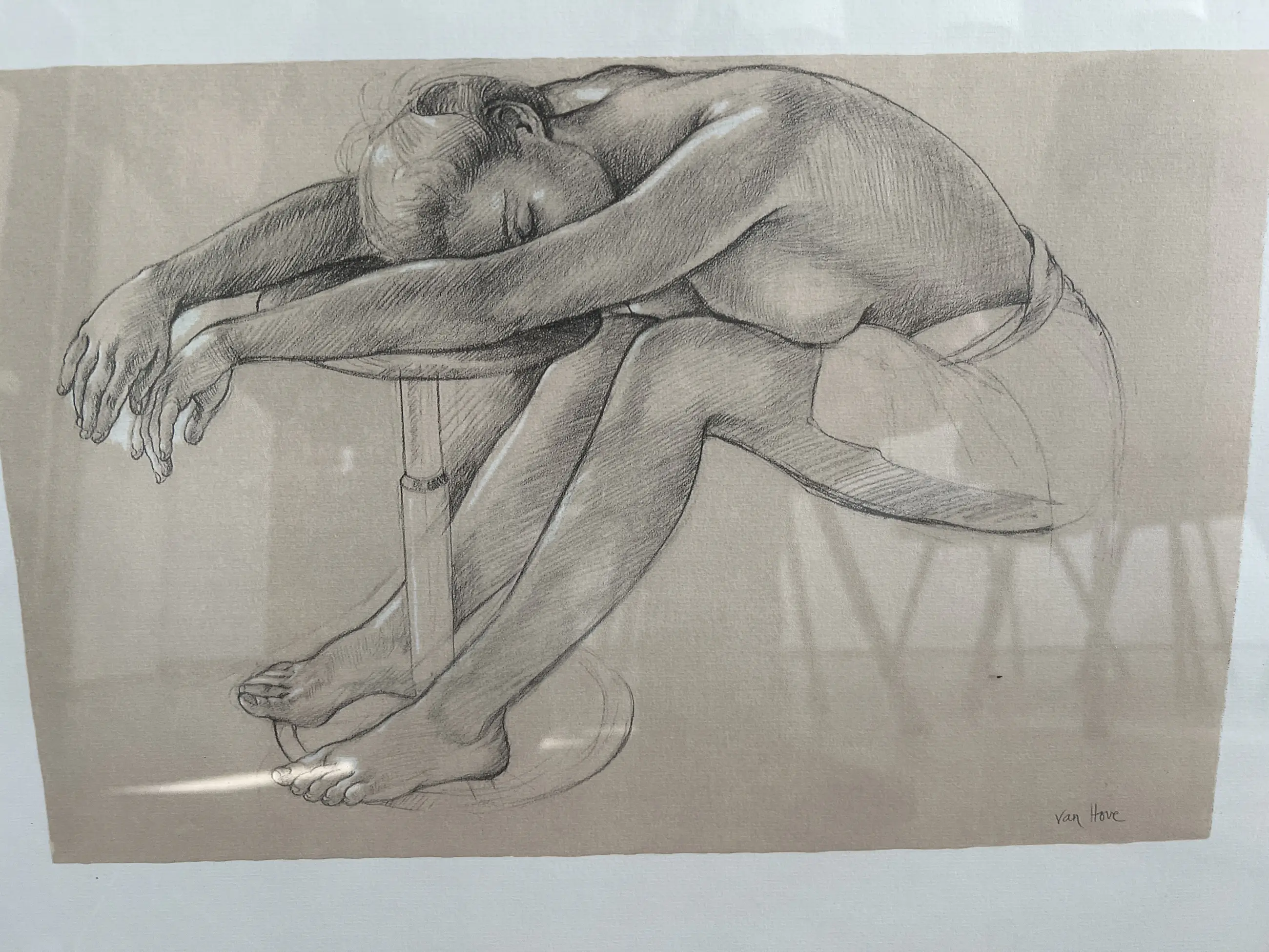 Vrouwelijk naakt leunende met hoofd en armen op ronde kruk. Zij heeft een doek om haar middel.
