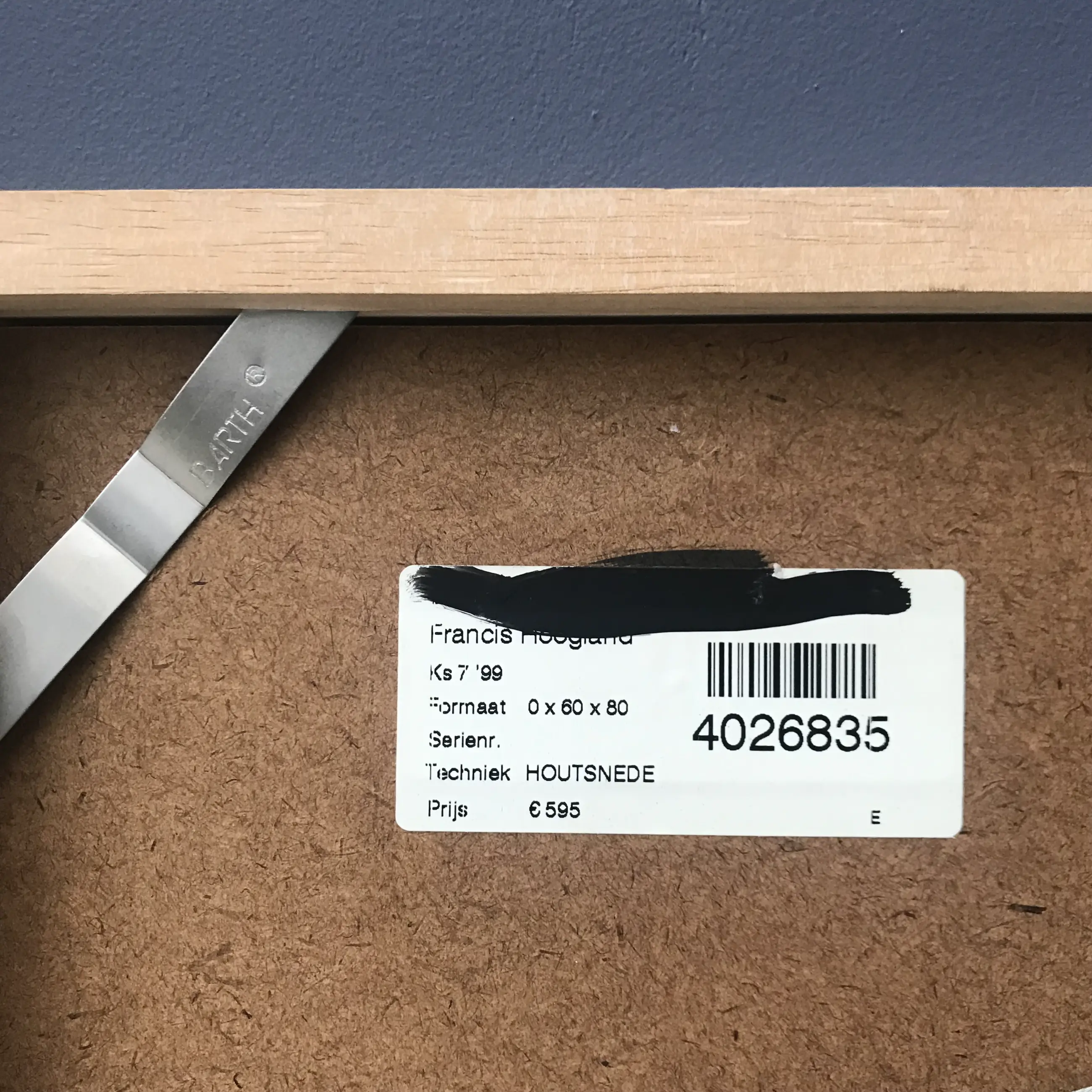 Techniek: zeefdruk Gedateerd: midden onder in potlood ('99) Gesigneerd: midden onder in potlood Genummerd: links onder in potlood (13/15) Afmeting lijst: 83x63cm Afmeting beeld: 43x42cm Conditie werk: zeer goed Professioneel ingelijst. Kan zo aan de muur!