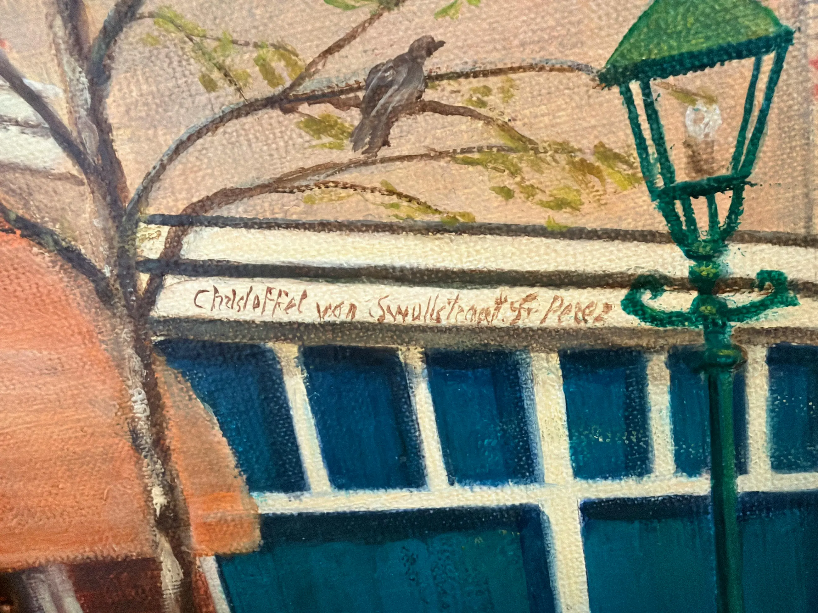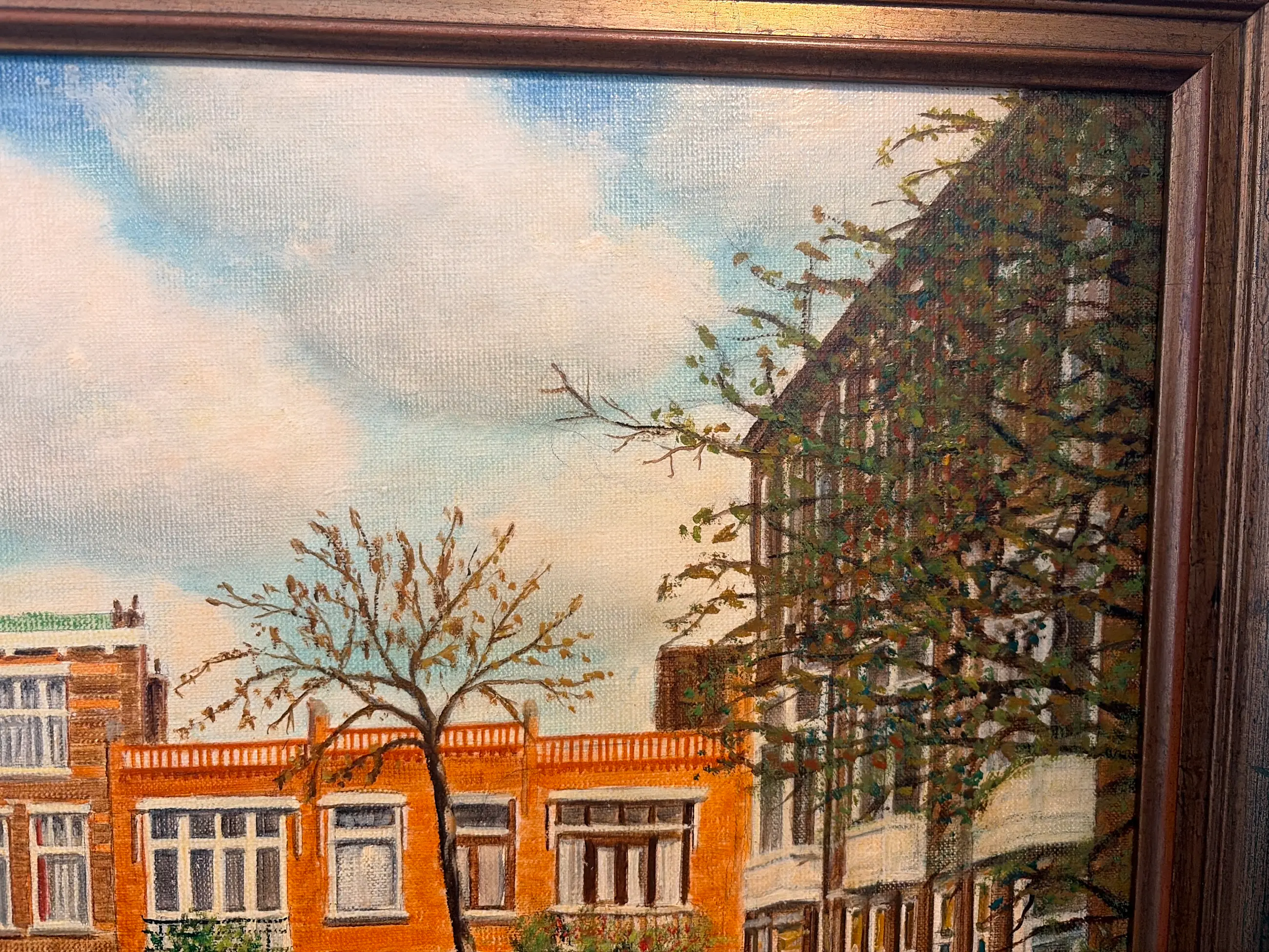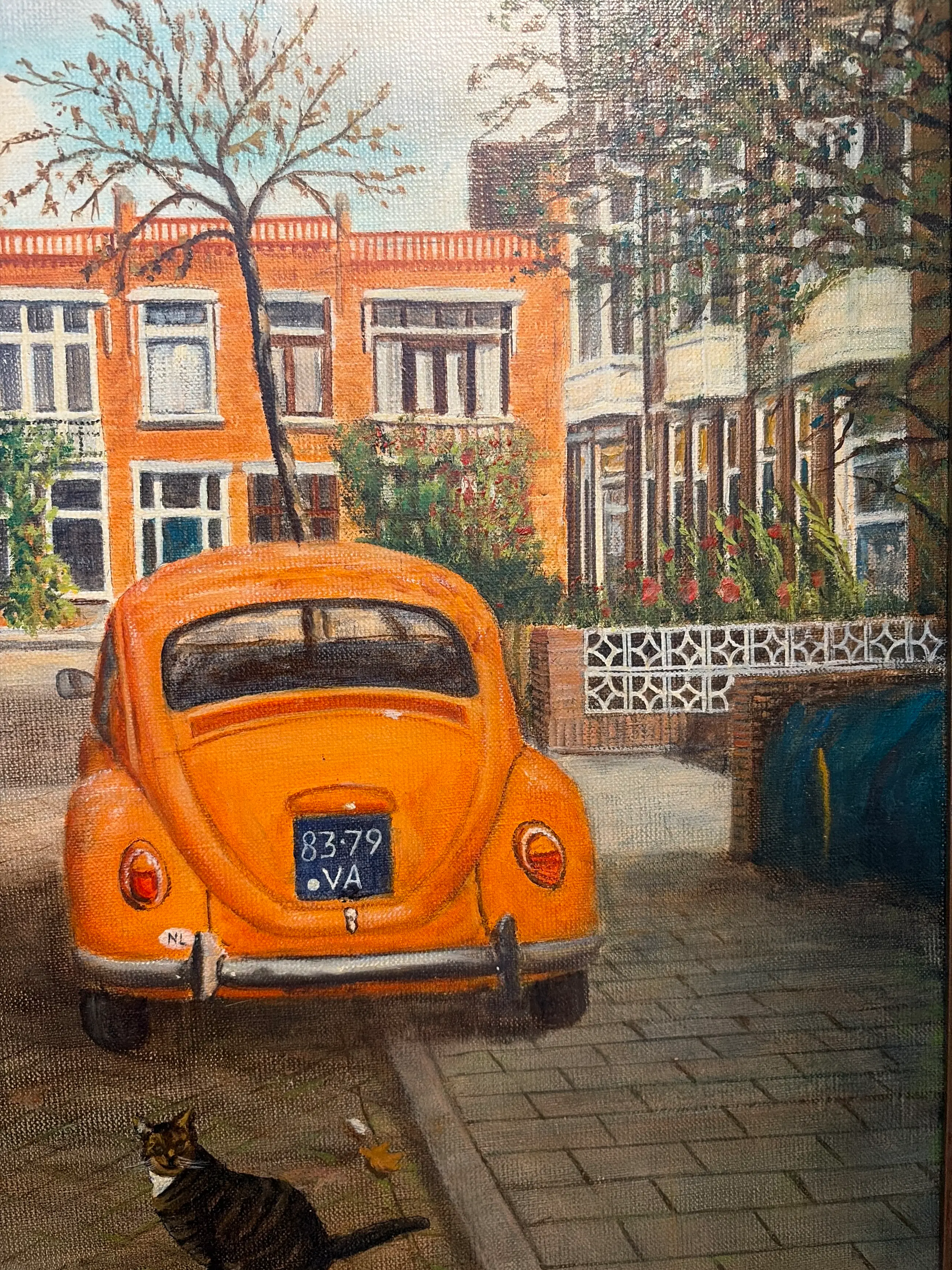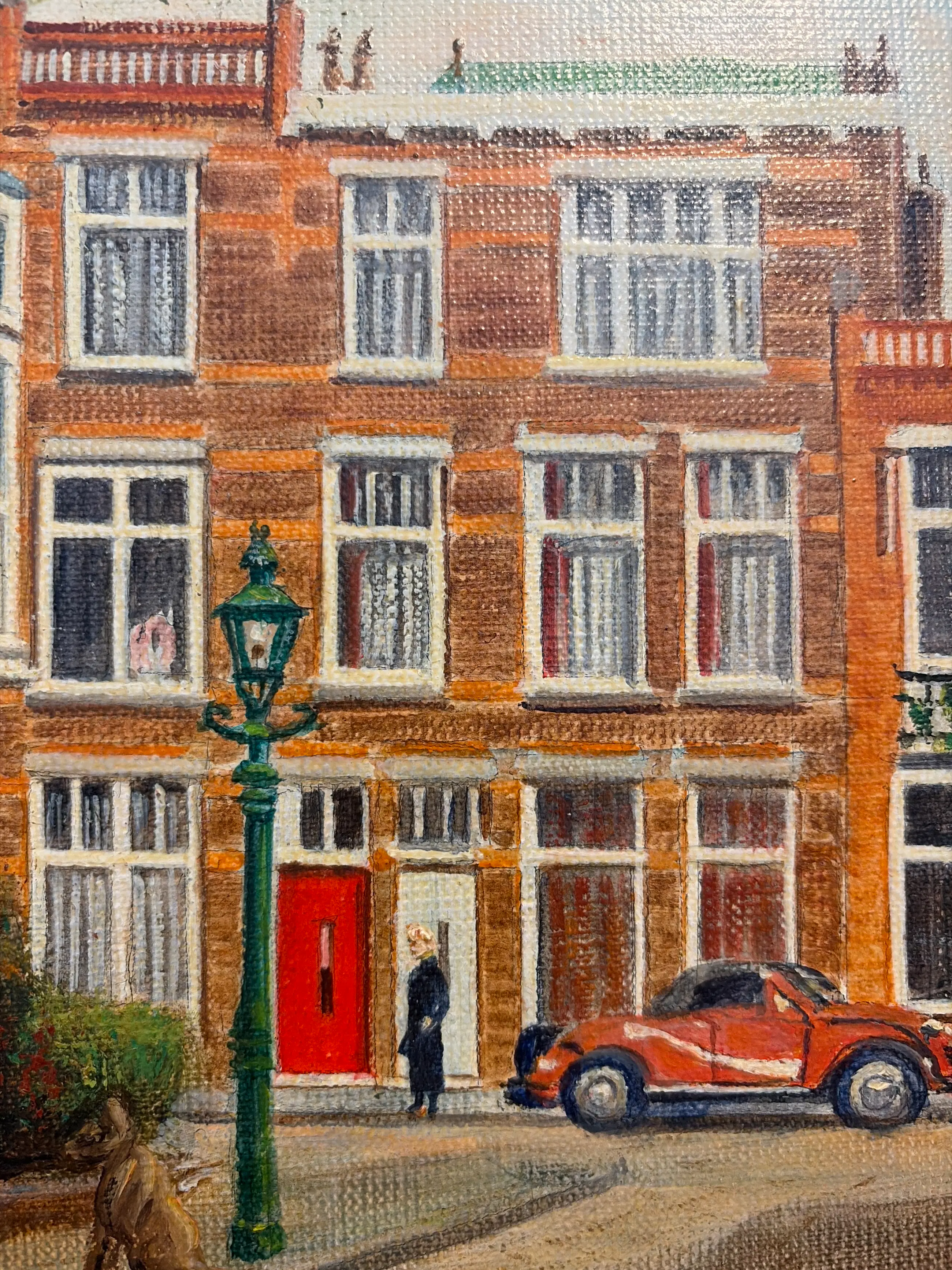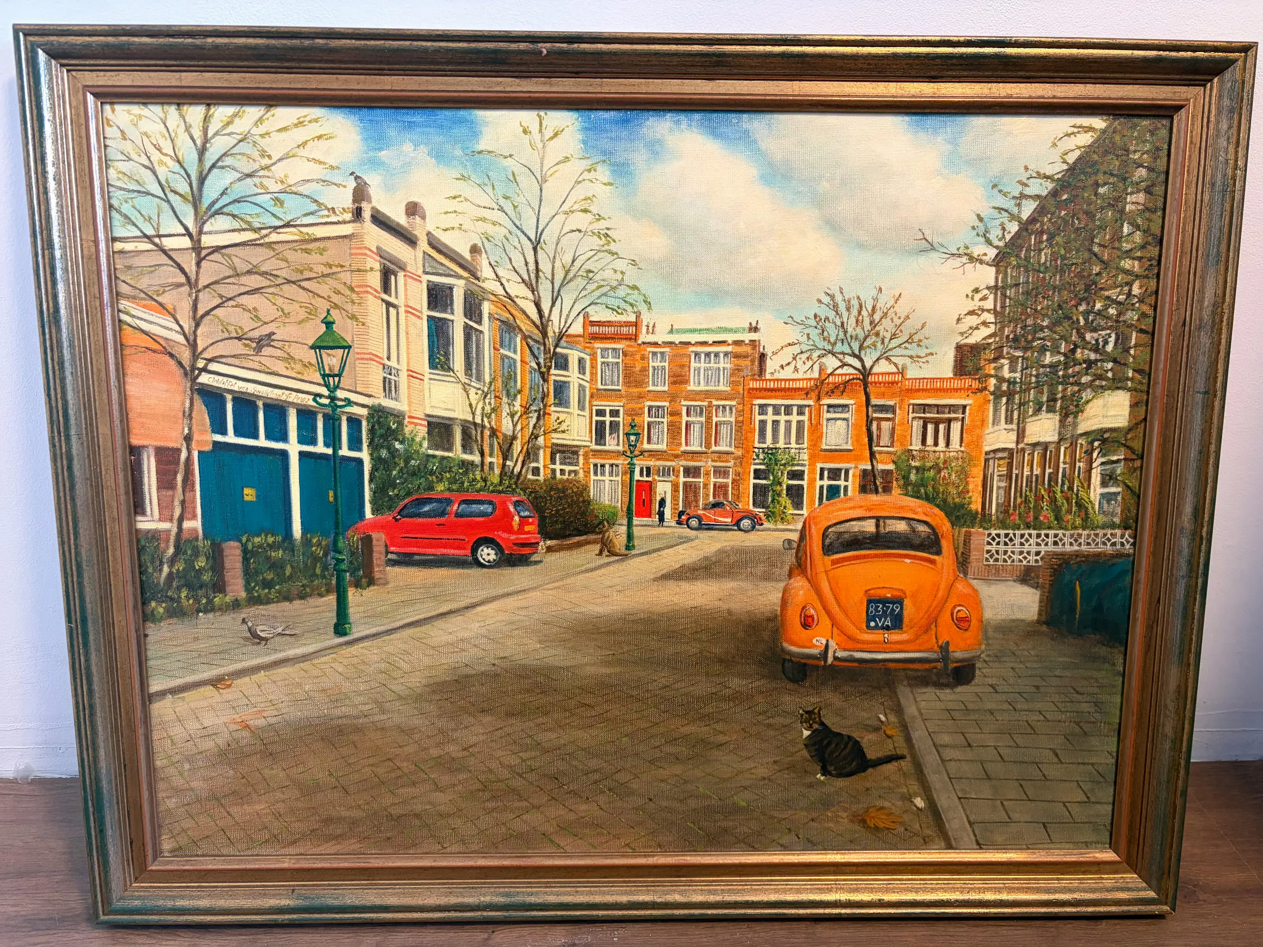 Prachtig olieverf schilderij van een karakteristieke straat in Den Haag (Christoffel van Swollstraat en Johannes Camphuysstraat) Het werk is geschilderd door Francisco Pérez Anguita die daar ook z’n atelier had. Het toont een sfeervol straatbeeld met klassieke architectuur en een vintage auto, uitgevoerd in warme kleuren. Origineel schilderij (geen print) Olieverf op doek Formaat: ca. 60 x 80 cm In nette staat Inclusief lijst Mooi voor liefhebbers van Den Haag, stadsgezichten of realistische kunst.