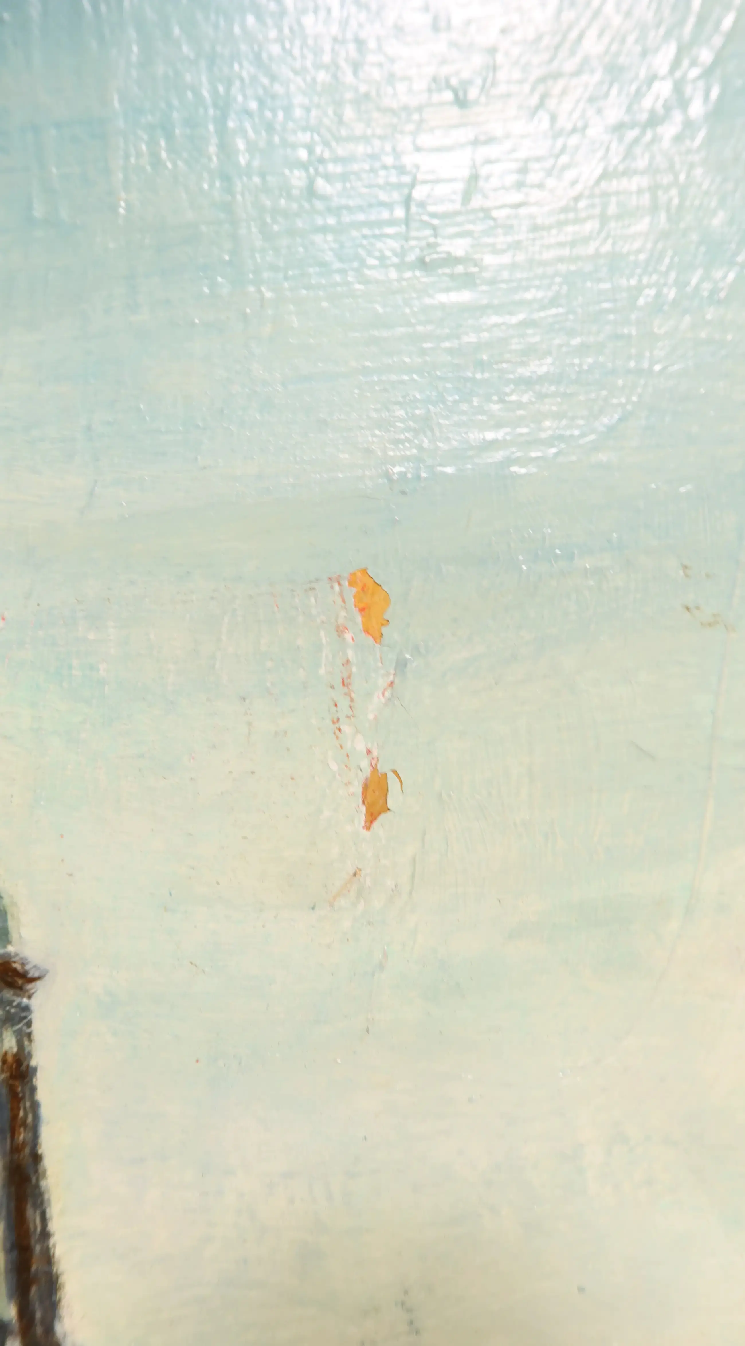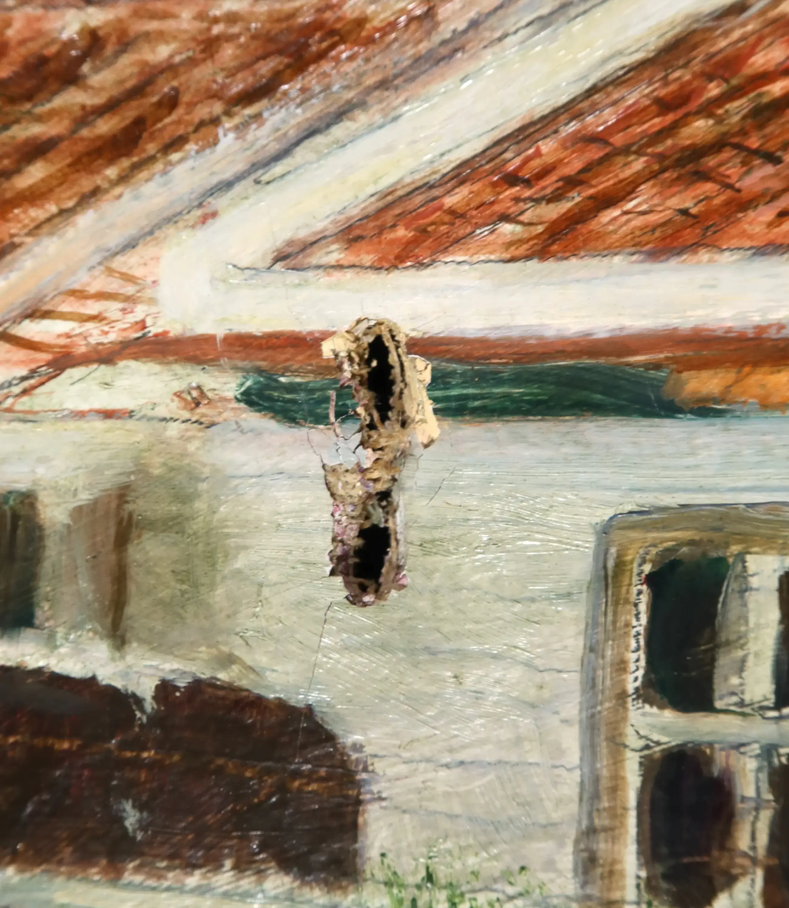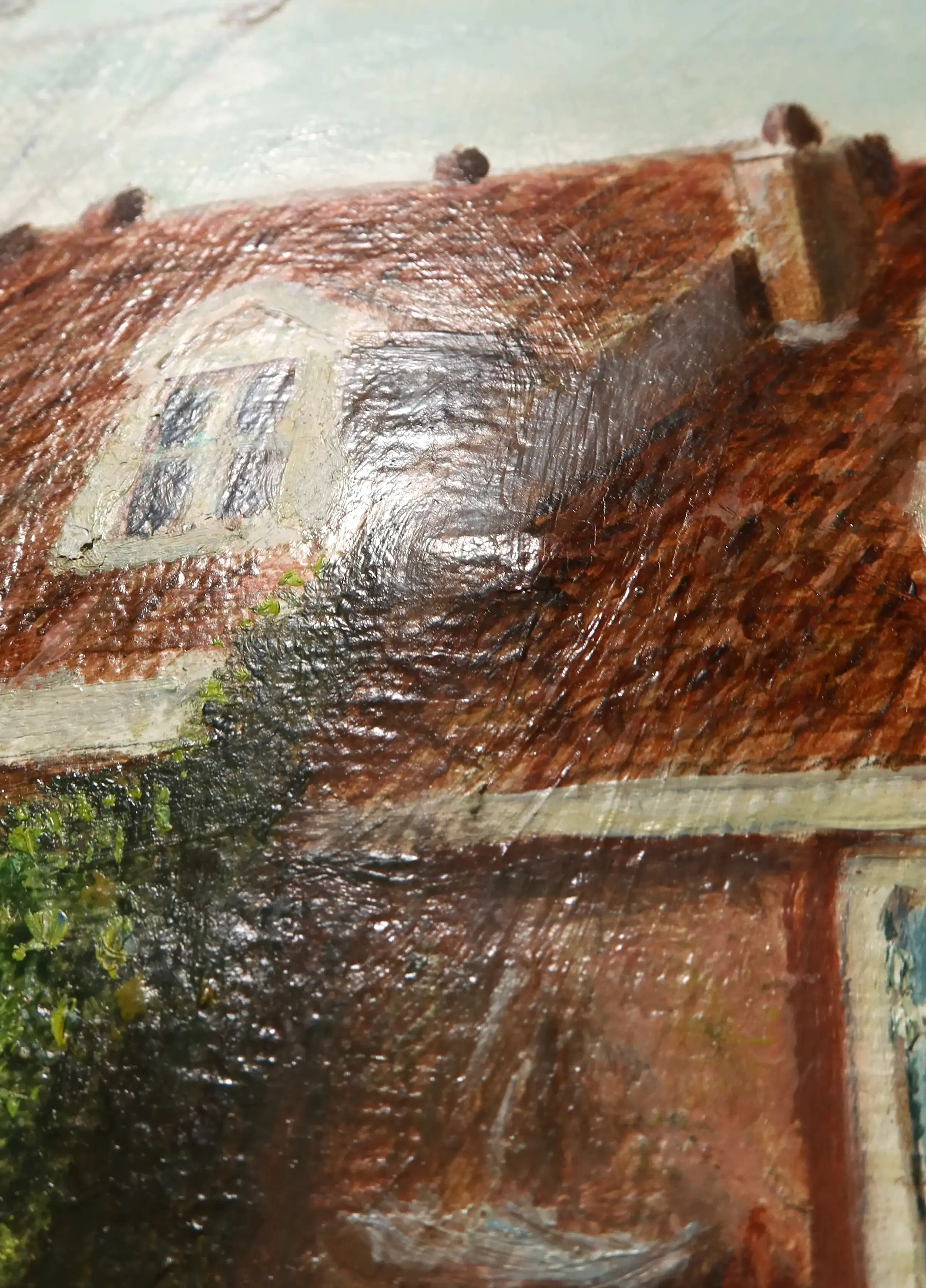| Bij de huizen aan de rechterkant van de voorstelling zit een gat en een grote buts. Verder bevat het werk enkele oppervlakkige plekjes vuil en verfschade. | |