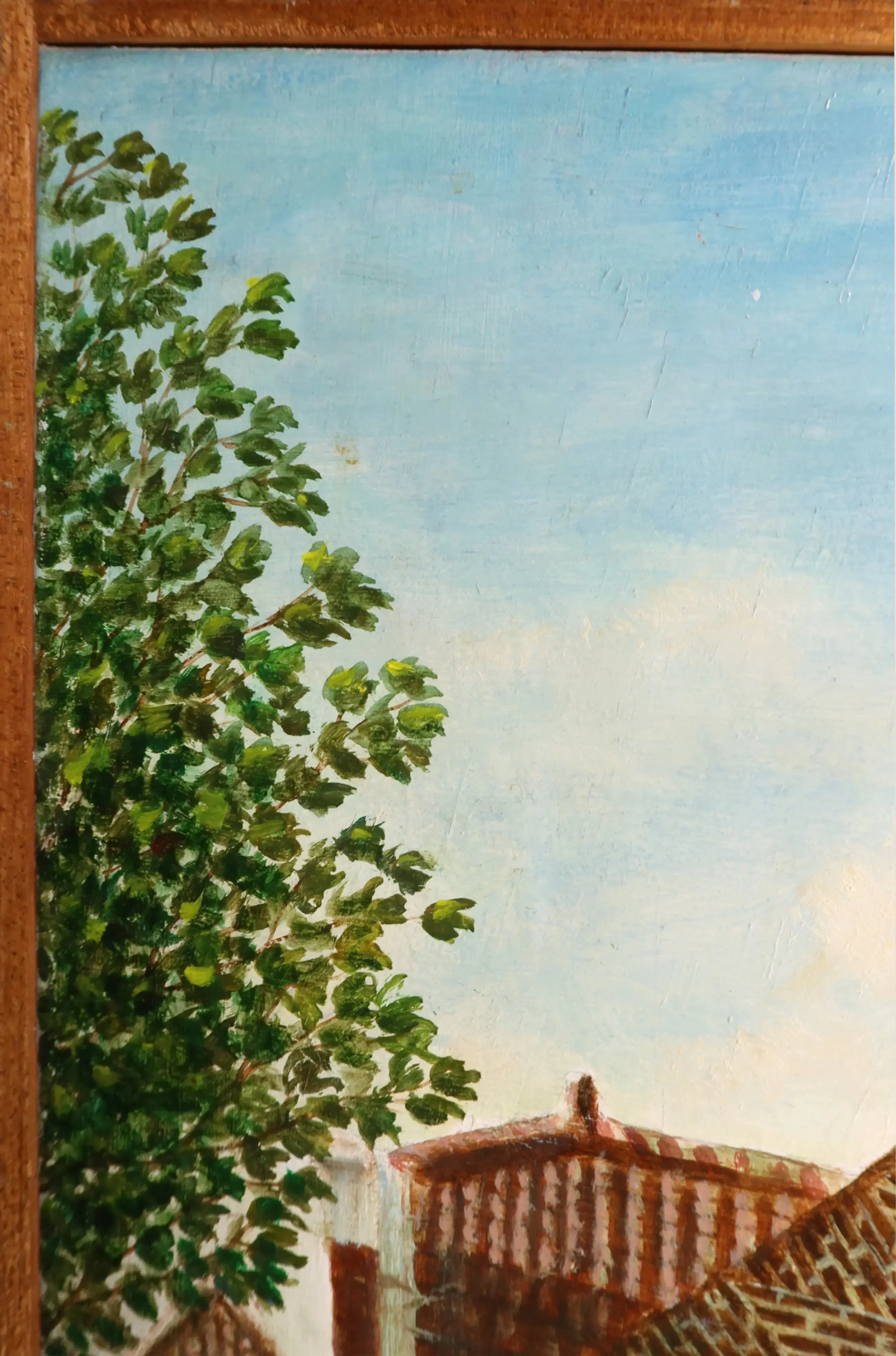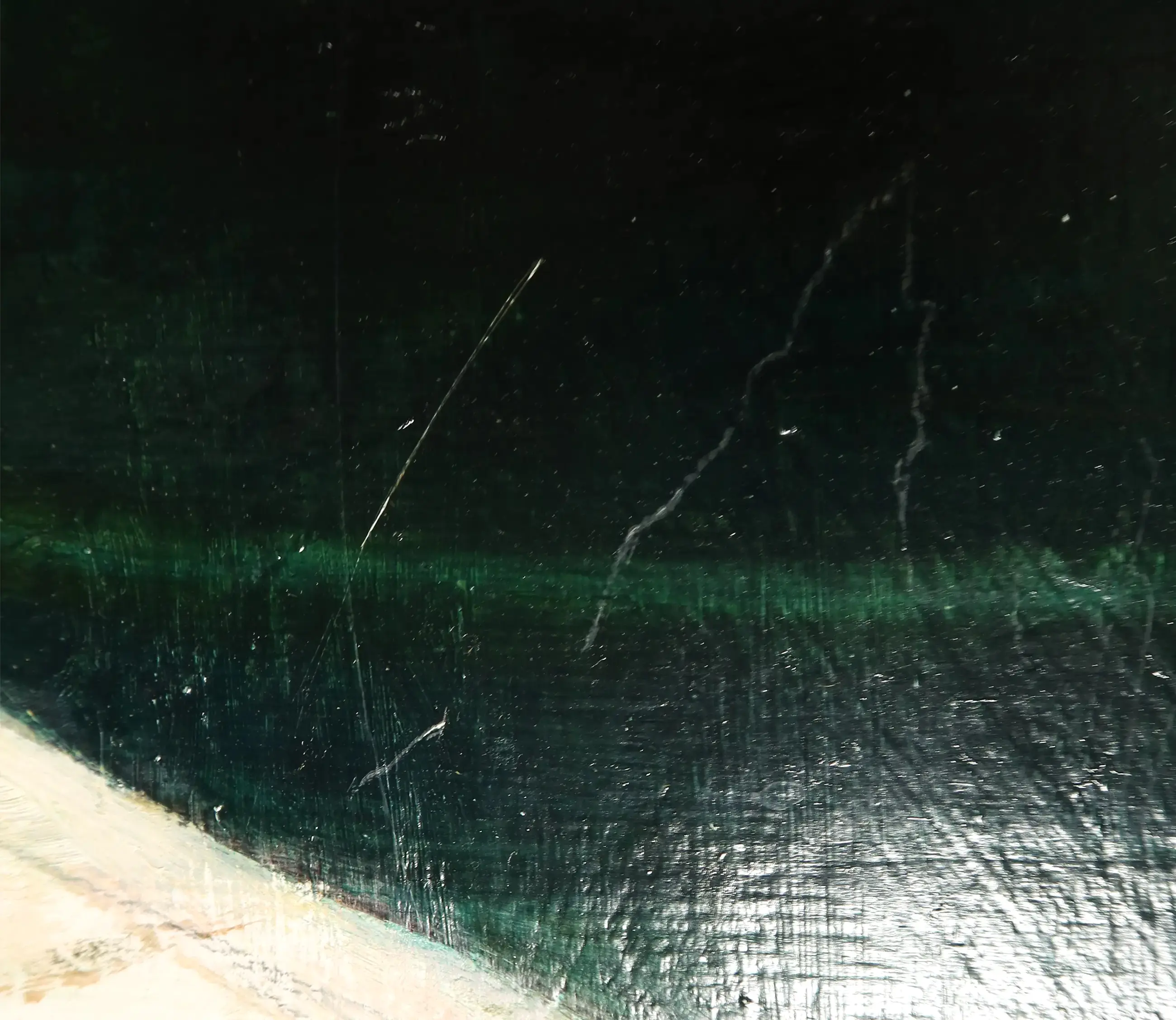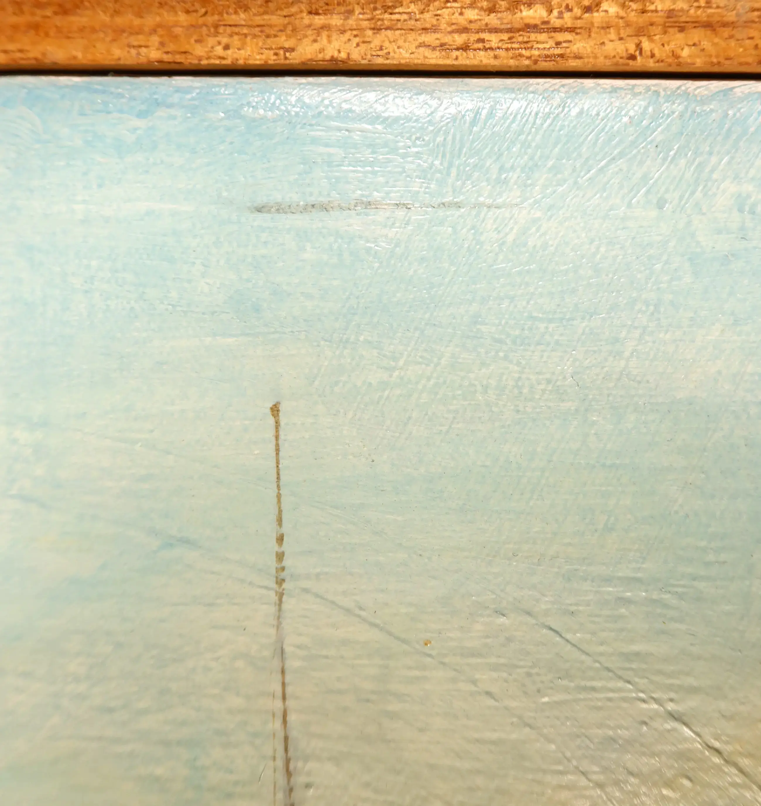 | Bij de huizen aan de rechterkant van de voorstelling zit een gat en een grote buts. Verder bevat het werk enkele oppervlakkige plekjes vuil en verfschade. | |