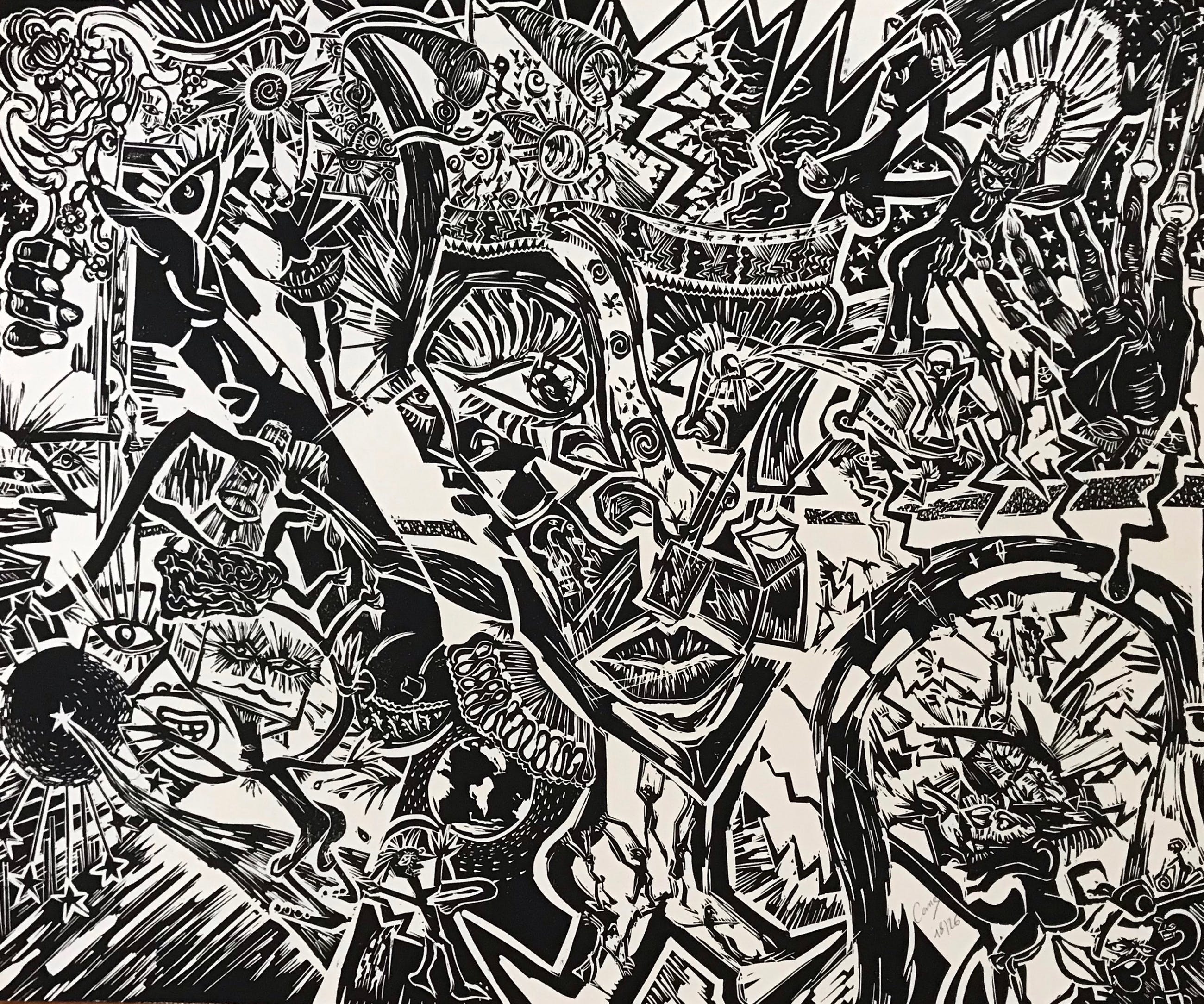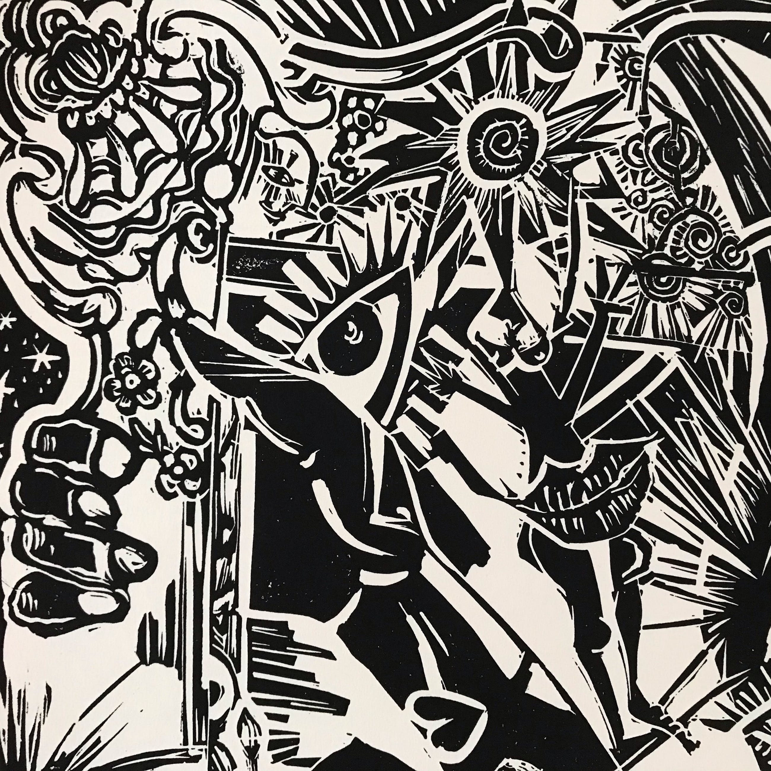 Kenmerkend voor het werk van Francky Cane is het formaat waarop hij met hout en linosnede werkt.