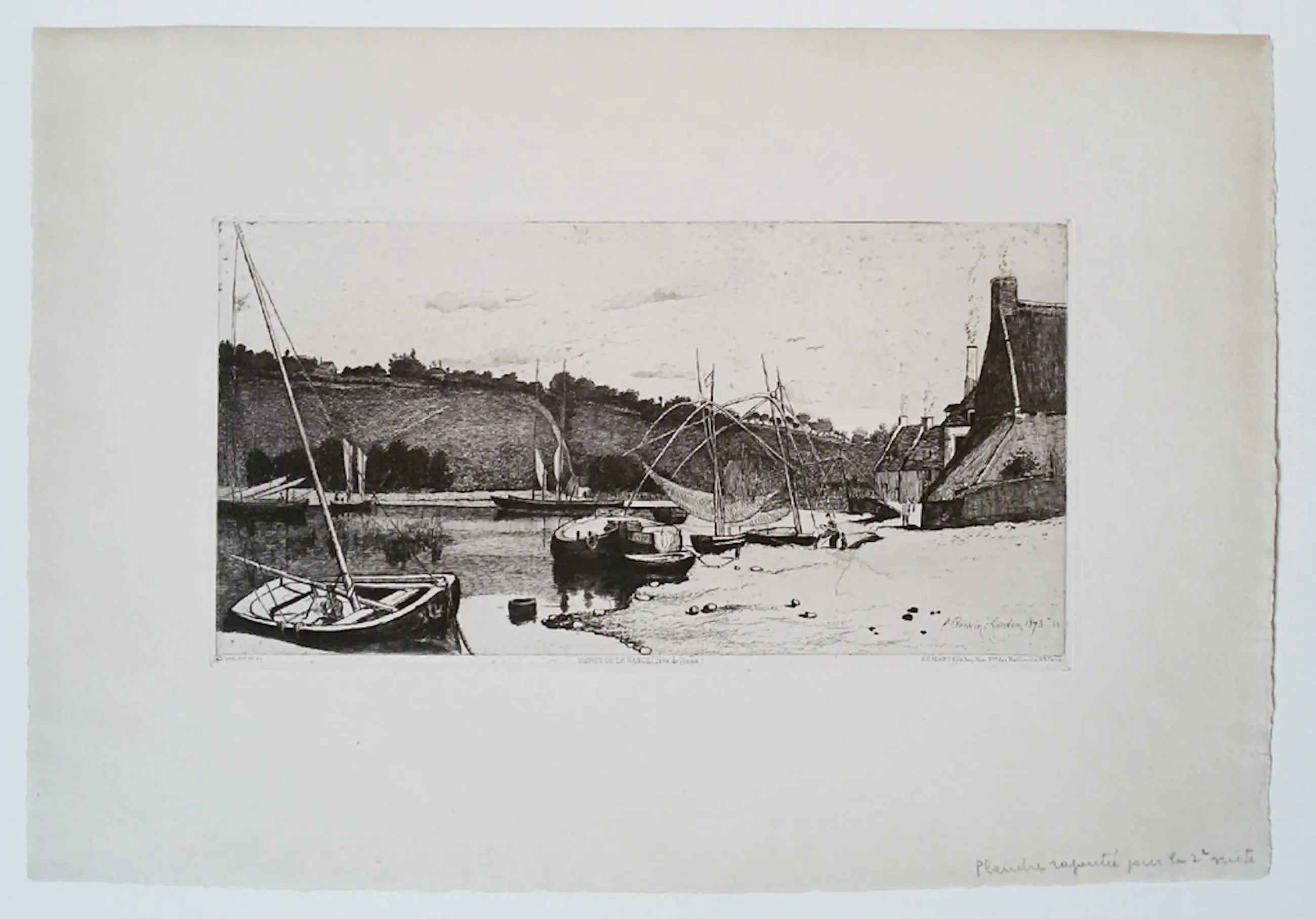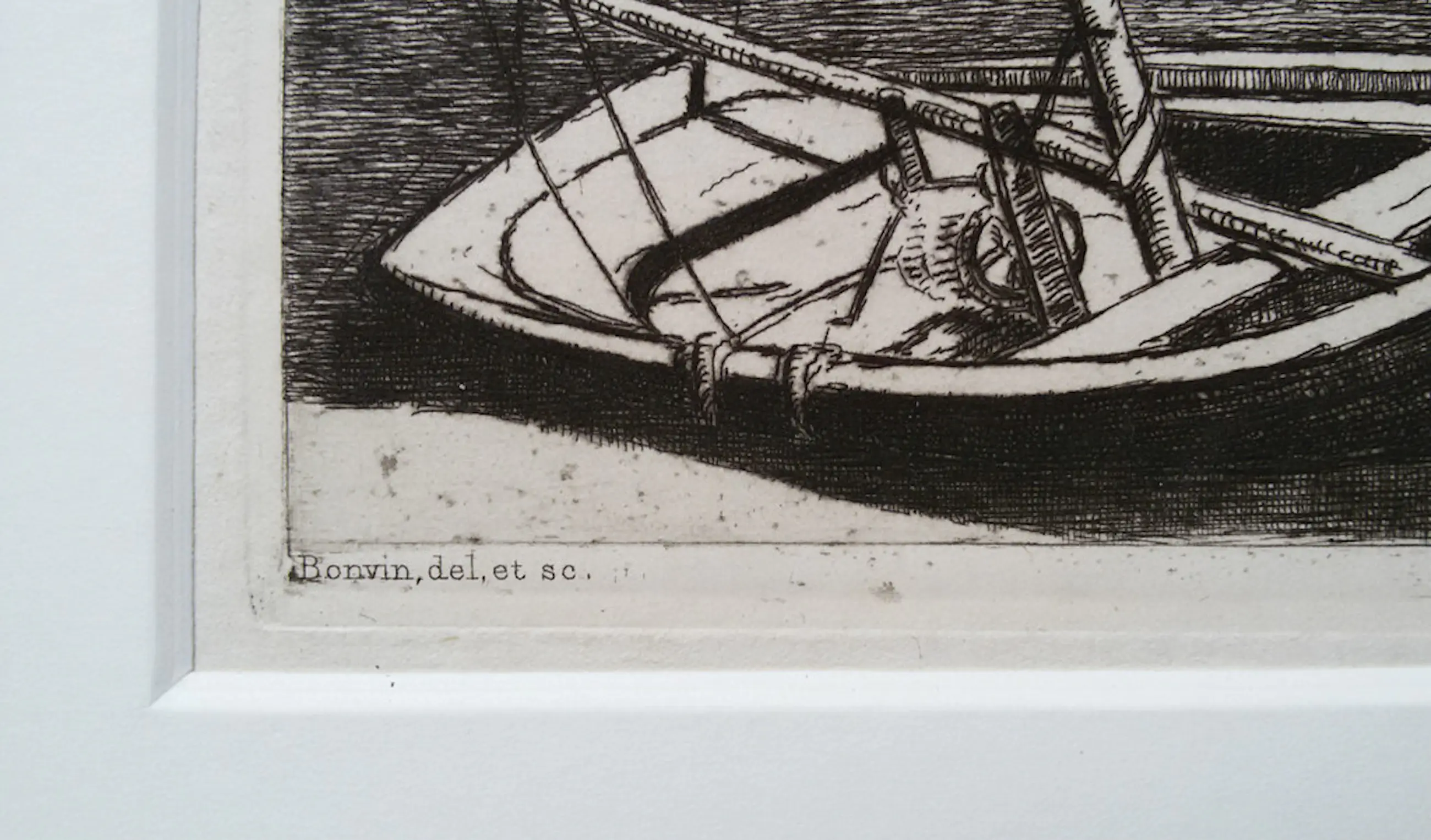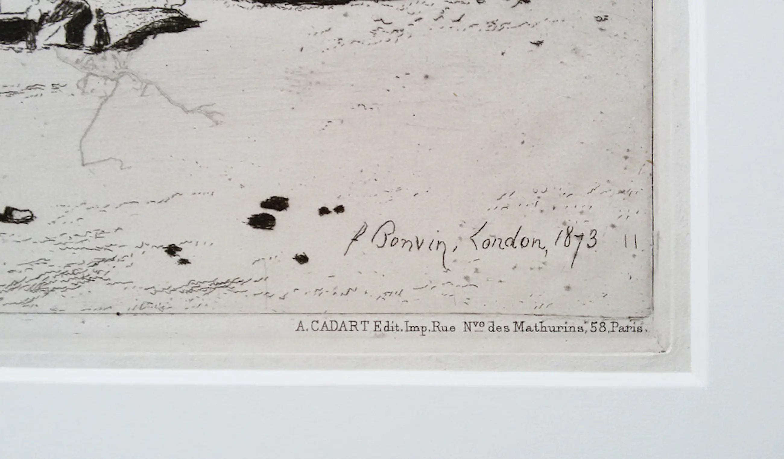 Bekend werk van de Franse kunstenaar Francois Bonvin. Ets op geschept papier, in de plaat gesigneerd en gedateerd (1873). Rechtsonder op het blad een aantekening in het Frans, maar niet door de kunstenaar zelf. In openklapbaar, zuurvrij passe-partout, alles in zeer goede conditie.
