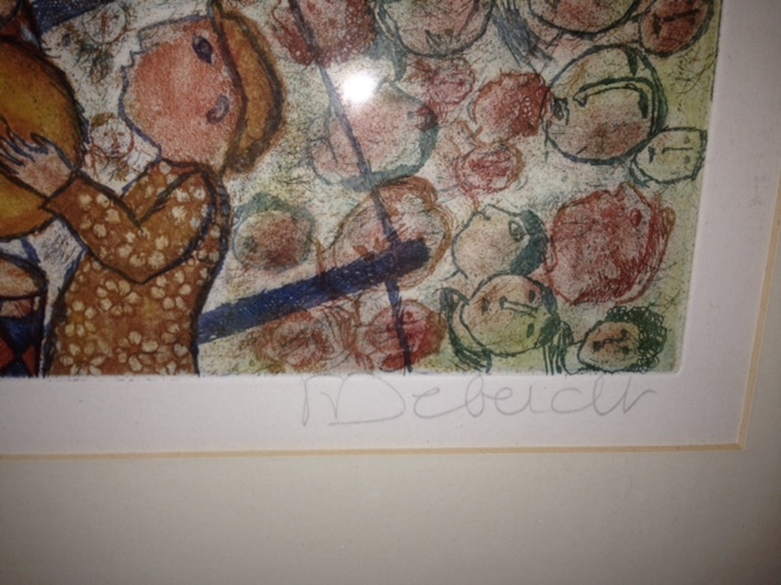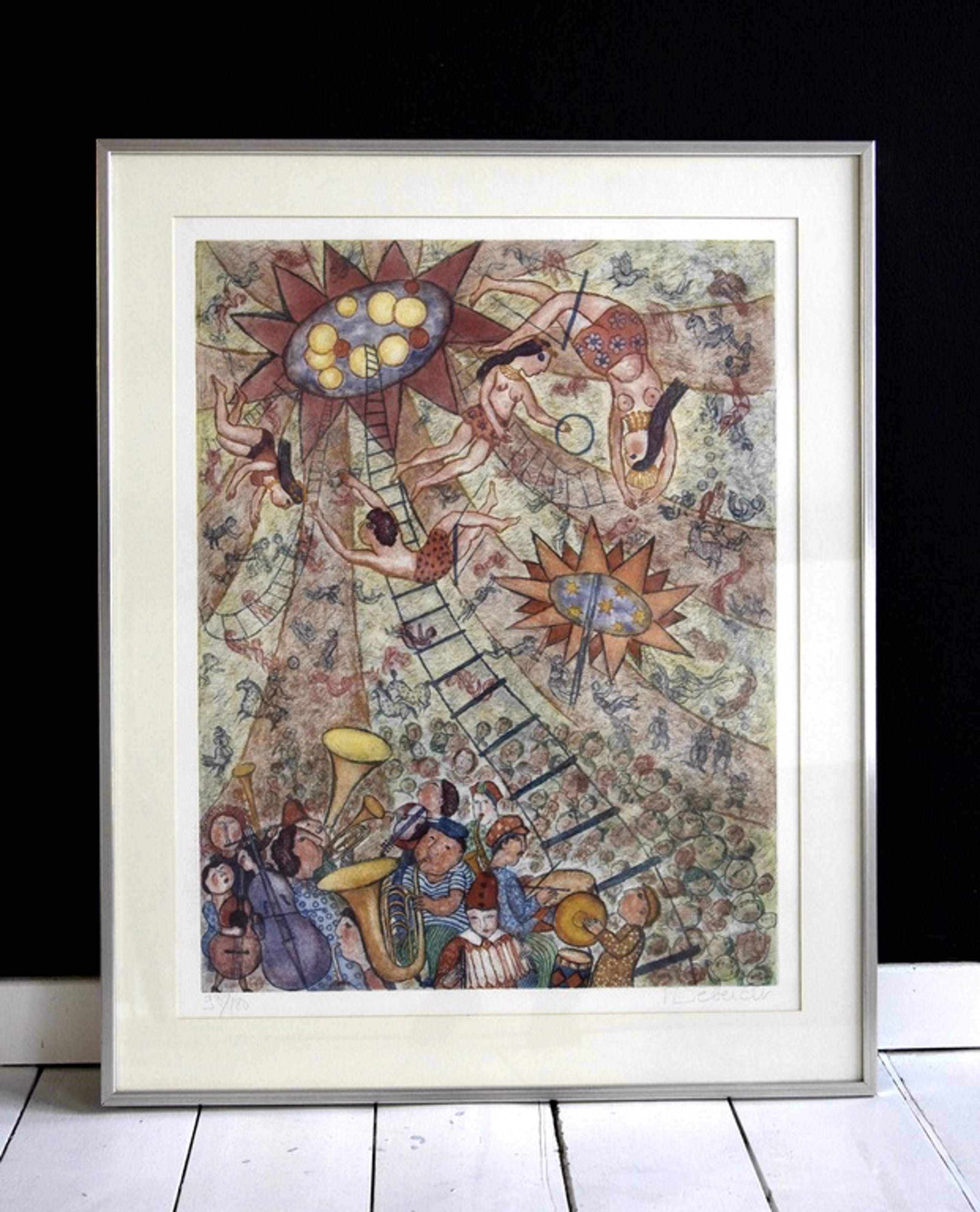 Dit is een ets gemaakt door Francoise Deberdt (1934 (mons-en-donnemarie). het werk is een circus voorstelling en is nummer 93 in een oplage van 180.