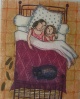 2 Mädchen und eine Katze im Bett liegend, Farbradierung von 1983, Plattengröße 15 x 12cm, die Radierung ist auf die Rechte Seite eines größeren Blattes gedruckt. Auf der Linken ist ein Gedicht von Charles Peguy abgedruckt. Das Blatt ist in der Mitte gefaltet, so dass zwei Hälften enstanden sind. Davon ist jede 28 x 22,5cm groß.