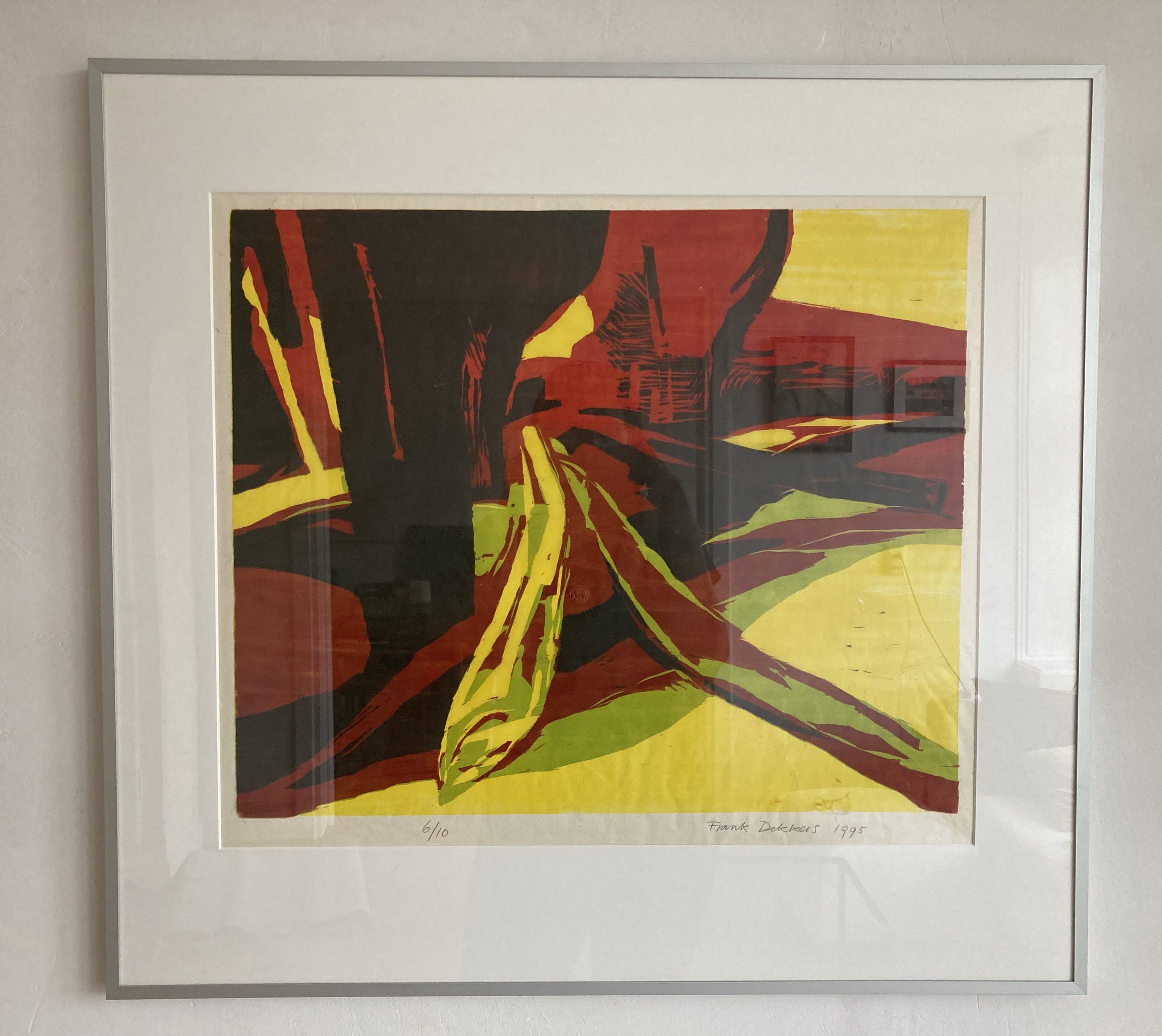 Stoer abstract van Frank Dekkers met fel geel en groen, zwart en donkerrood. Het werk is gedrukt op teer papier.