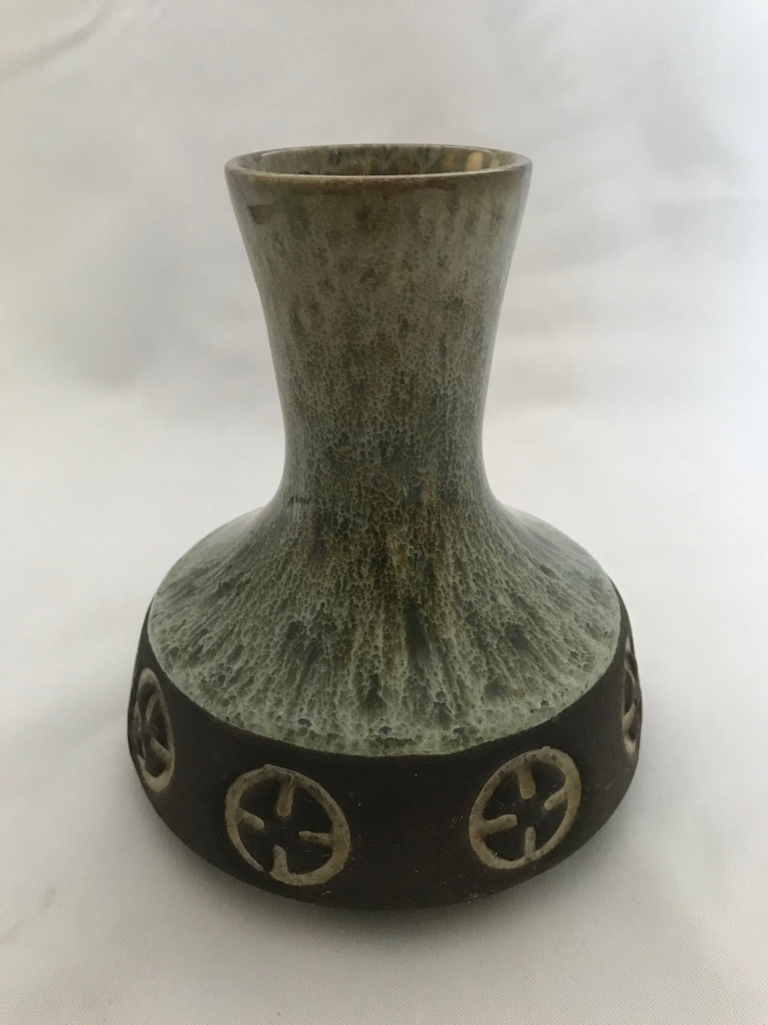 Twee mooie vaasje met bijzonder glazuur en geometrisch patroon gemaakt door Studio Frank Keramik Danmark (de eigenaar was Frank Rasmussen). De studio bestond van 1960 tot 1975. De grotere vaas heeft nog de originele studio sticker en is 15 cm hoog. De kleinere vaas is 12 cm hoog.