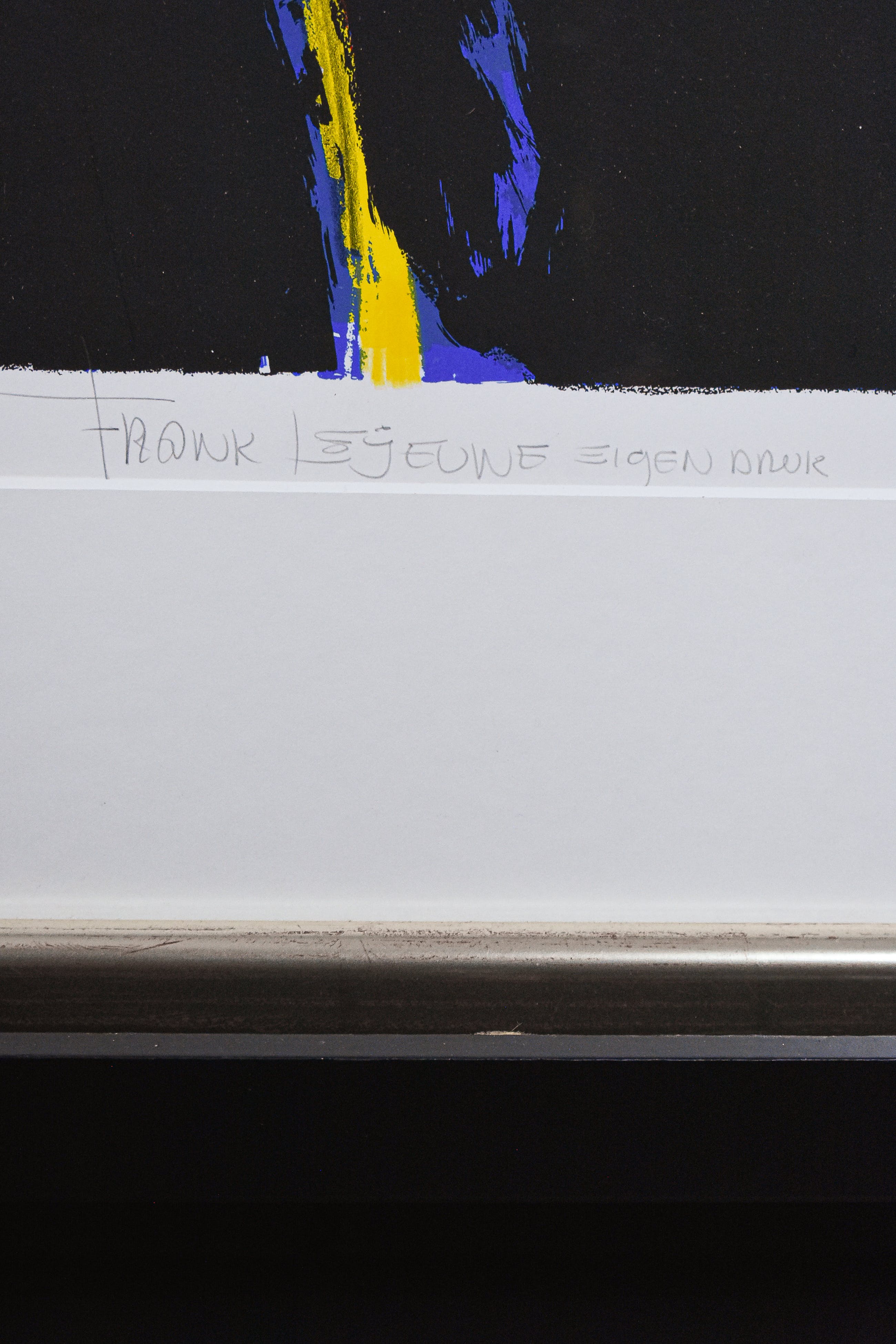 Frank Lejeune, Northampton (Eng. 1952) is autodidact en sinds zijn 30ste werkzaam als zelfstandig kunstenaar. Zijn werk is explosief te noemen. “Het gebeurt allemaal heel snel. Daarom werk ik ook het liefst met acrylverf. Met olieverf kan ik niet doorwerken, omdat het drogingproces zo langzaam gaat. .