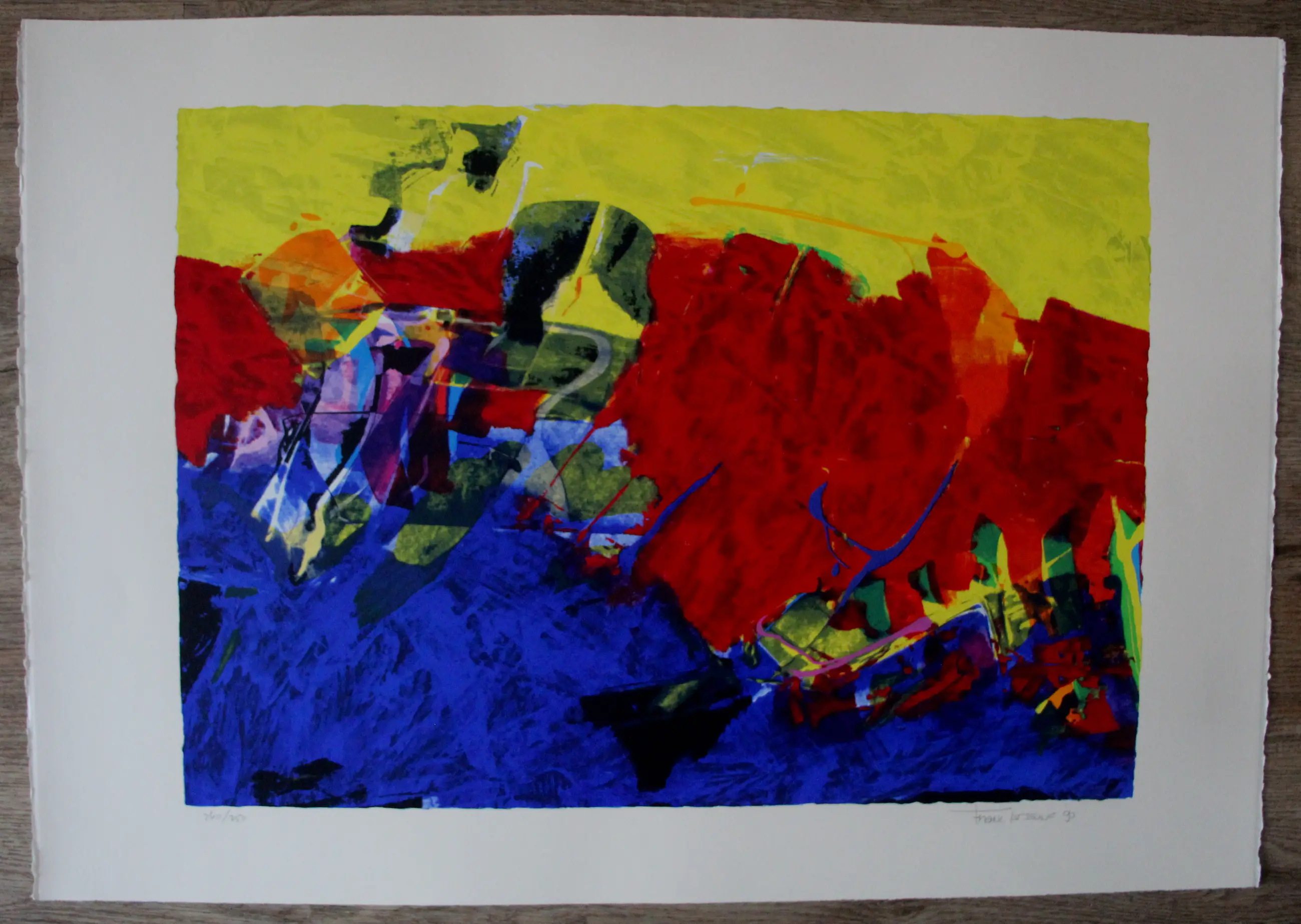 In 1987 heeft hij zijn eerste zeefdruk uitgebracht! Ik heb altijd alles zelf gedrukt en elke zeefdruk is verschillend omdat ik na het drukken het werk met verf en pastelpotlood afwerk." Het 'ambachtelijke' aspect van het drukken schept hem veel genoegen. Kenmerkend zijn verder de voornamelijk primaire kleuren geel, rood en blauw. "In mijn werk ben ik altijd met deze kleuren aan het stoeien geweest. "Ik ben zelden tevreden over mijn werk en het gevoel dat ik mijn beste werk nog moet maken keert telkens terug."