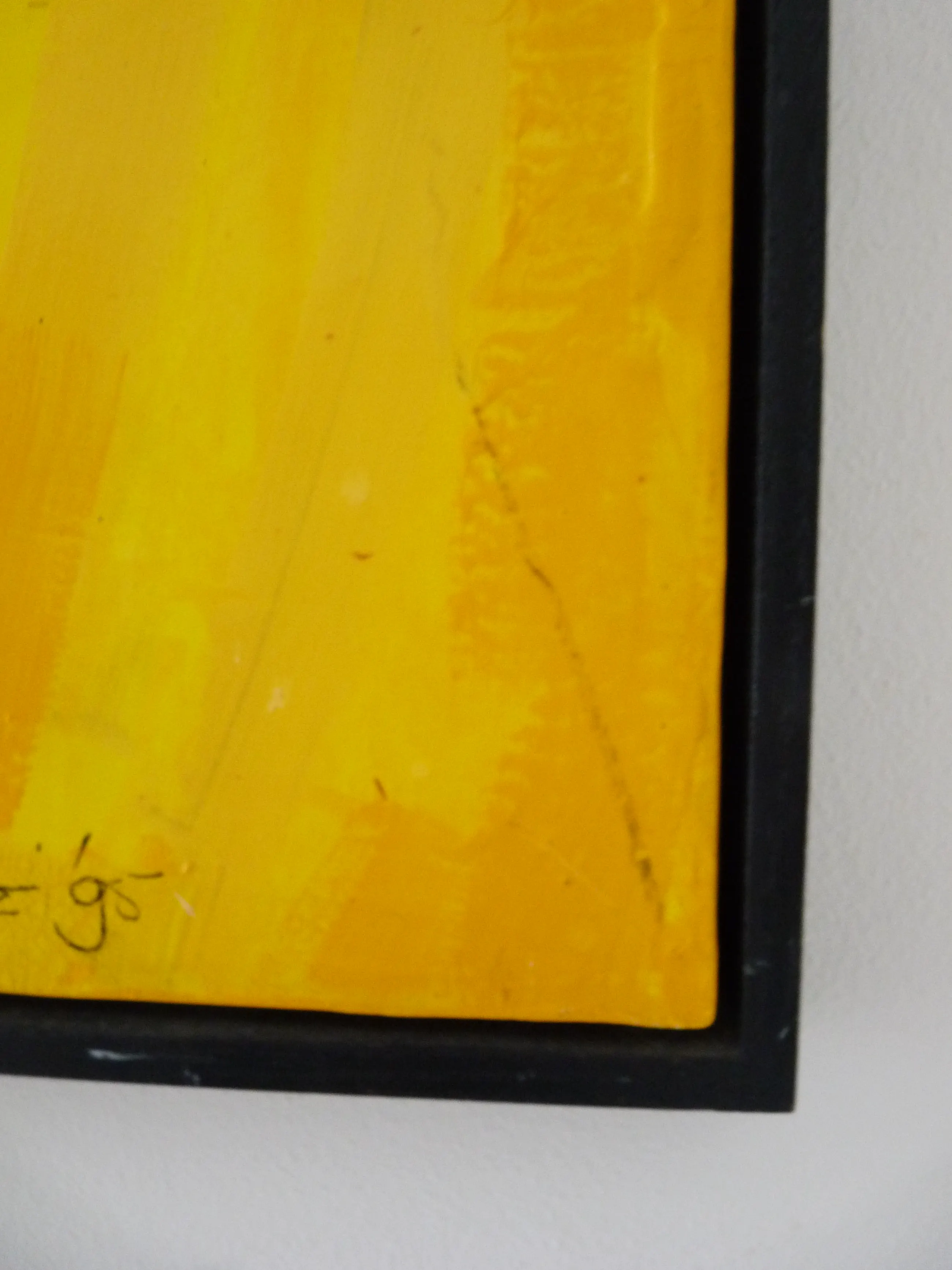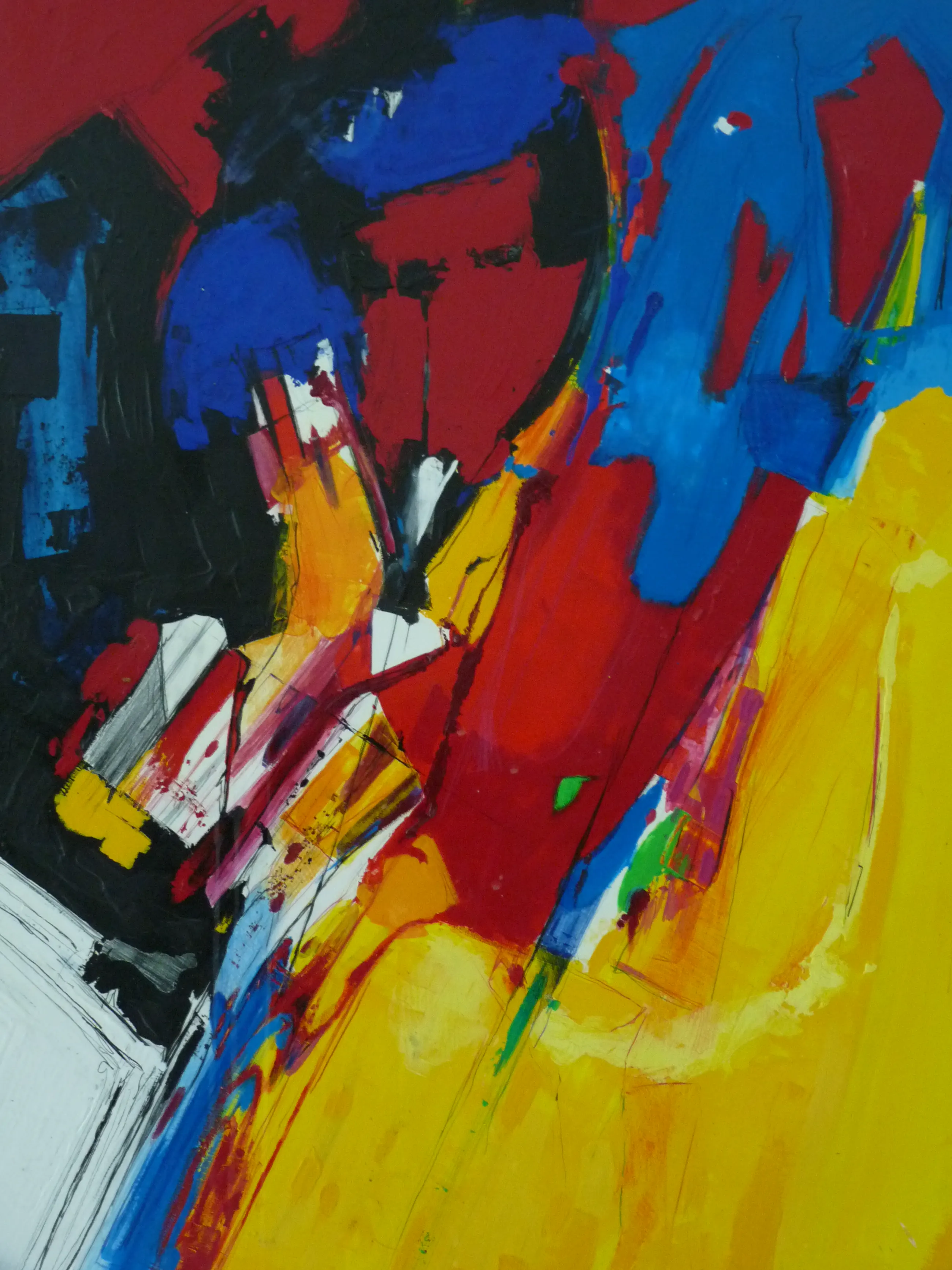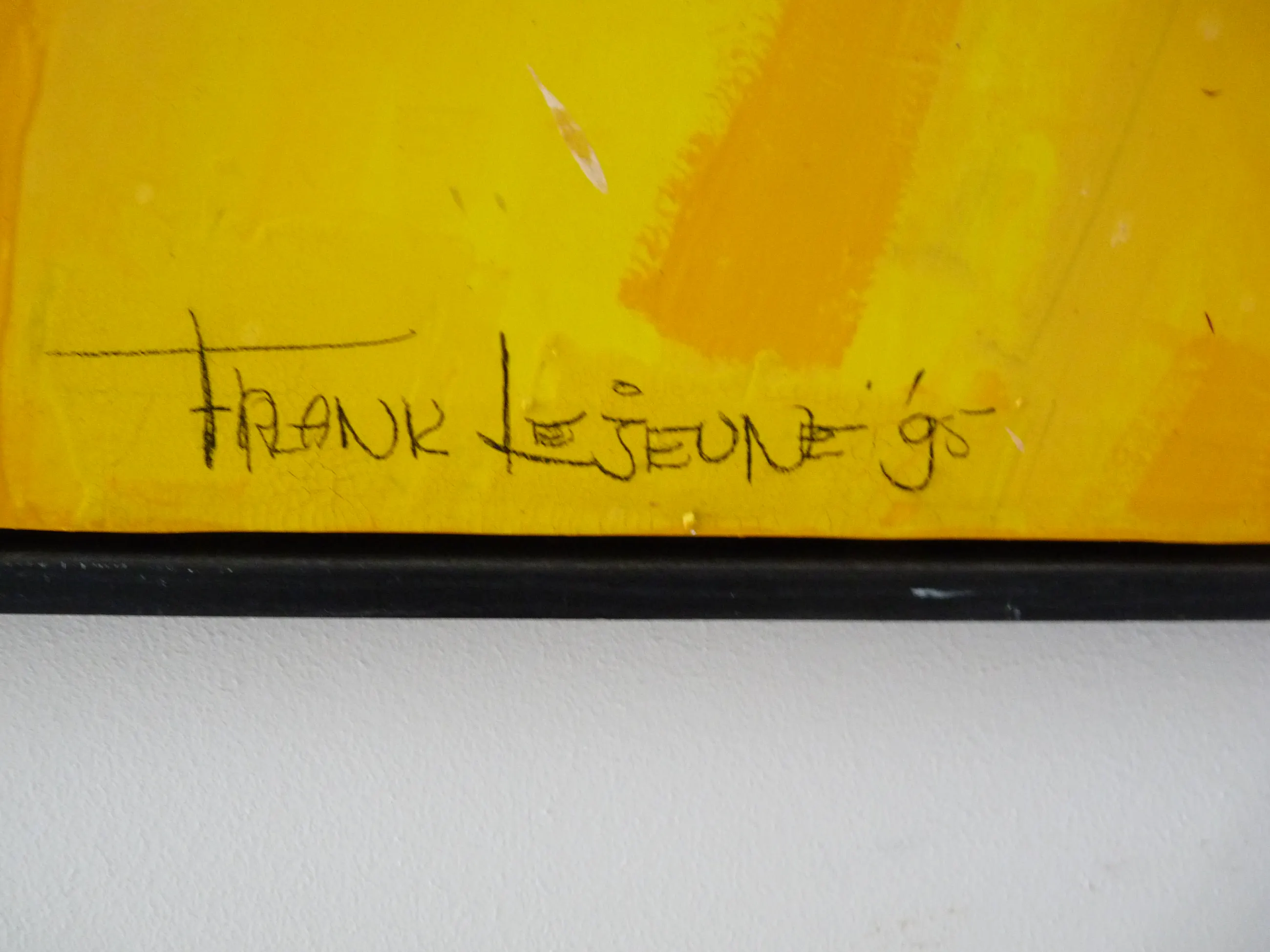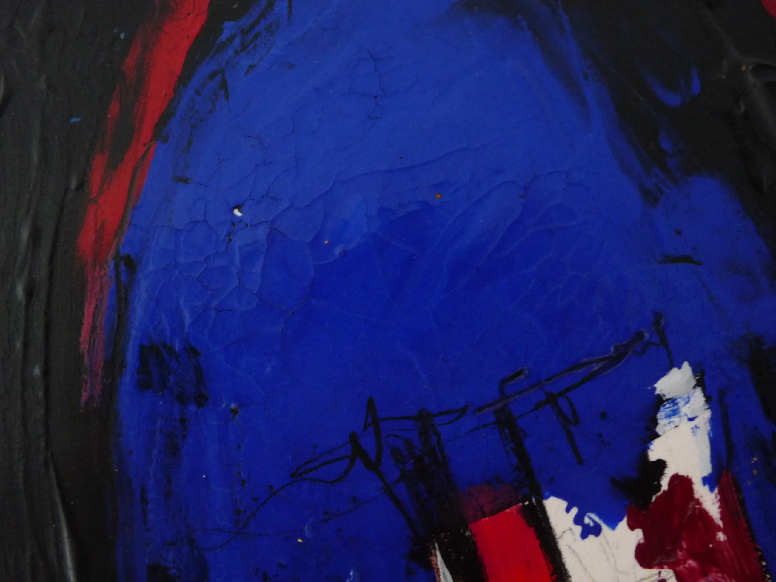 Fraai karakteristiek schilderij op paneel. Spannend werk in schitterende primaire kleuren. Verf in de donkerblauwe vlakken vertoont craquelé. (detailfoto) Afmeting schilderij 115 x 100 cm. Inclusief zwarte houten baklijst 119 x 104 cm.