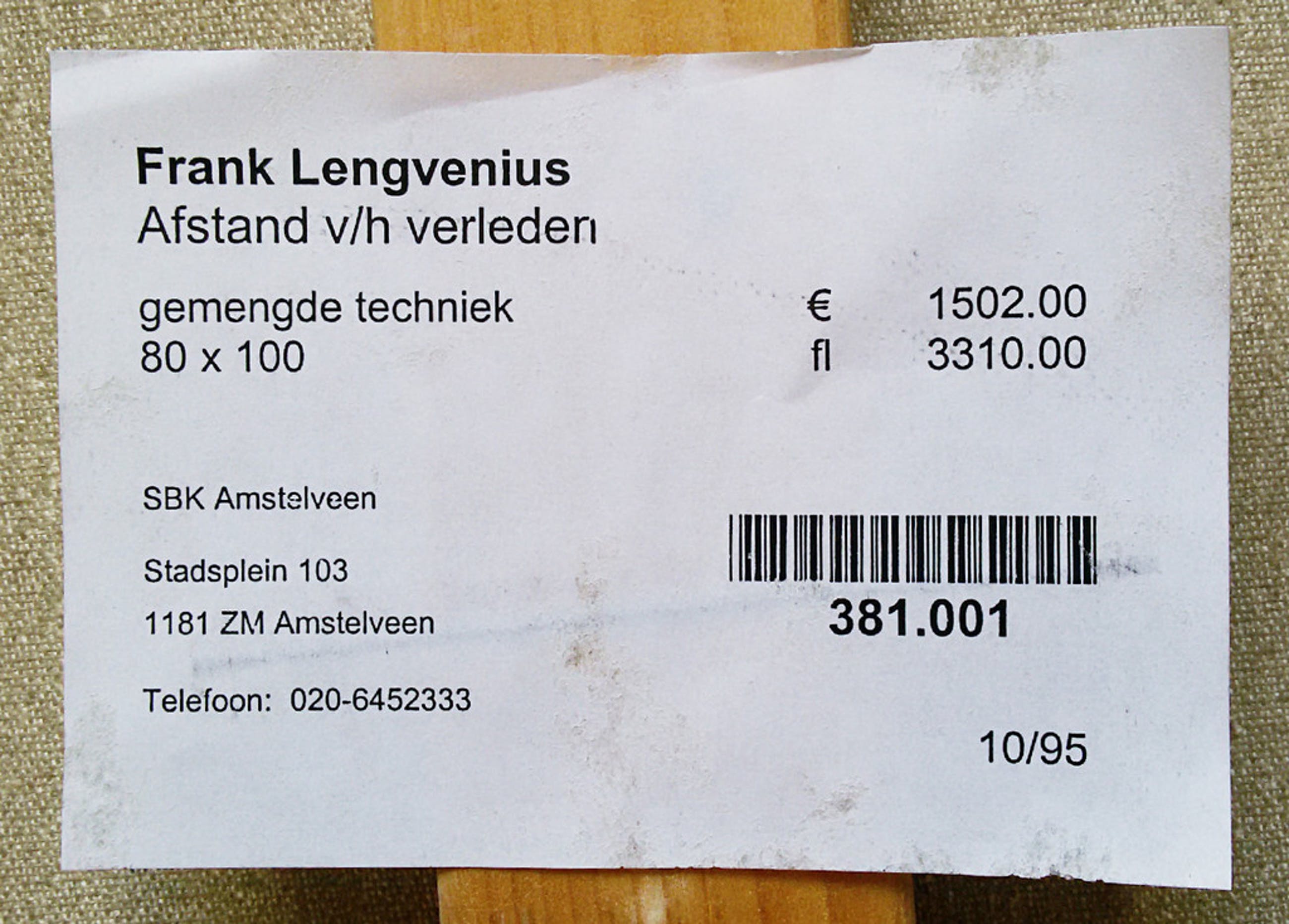Bij aankoop moet het werk opgehaald worden in Diemen (vlakbij het kantoor van Kunstveiling in Amsterdam Z-O). De termijn voor ophalen is zeer ruim, m.a.w. de koper kan het werk eventueel weken of zelfs maanden later ophalen en het zo mogelijk combineren met een bezoek aan Amsterdam voor andere zaken.