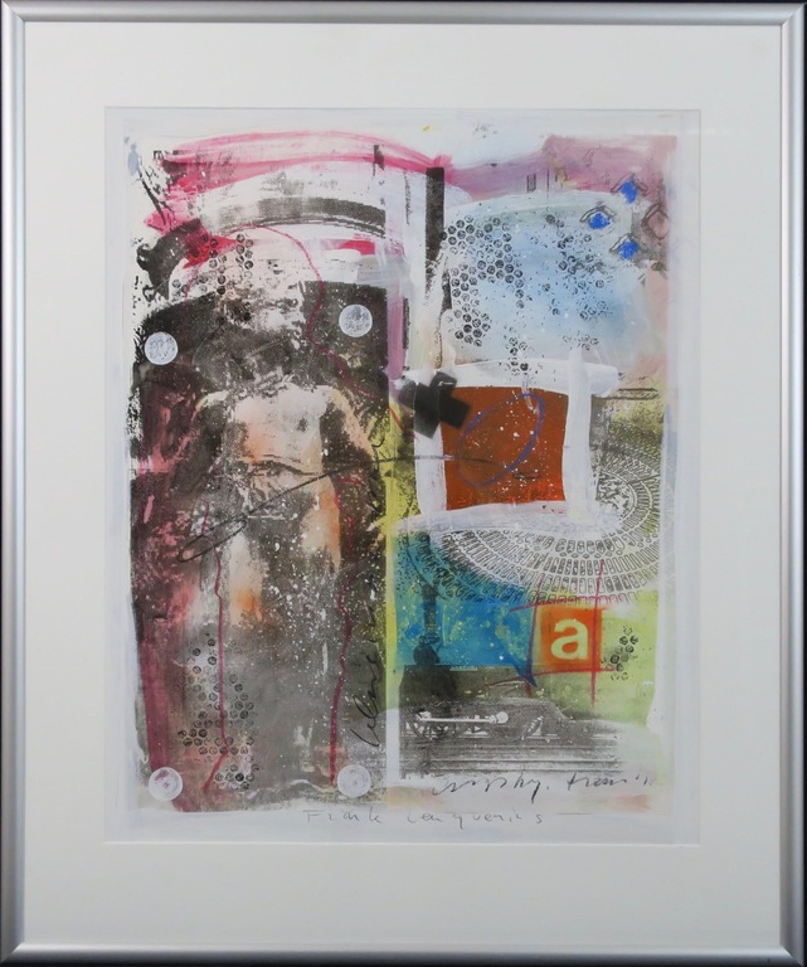 Materiaal: Gemengde techniek, o.a. Acryl, aquarel en krijt op zeefdruk op papier