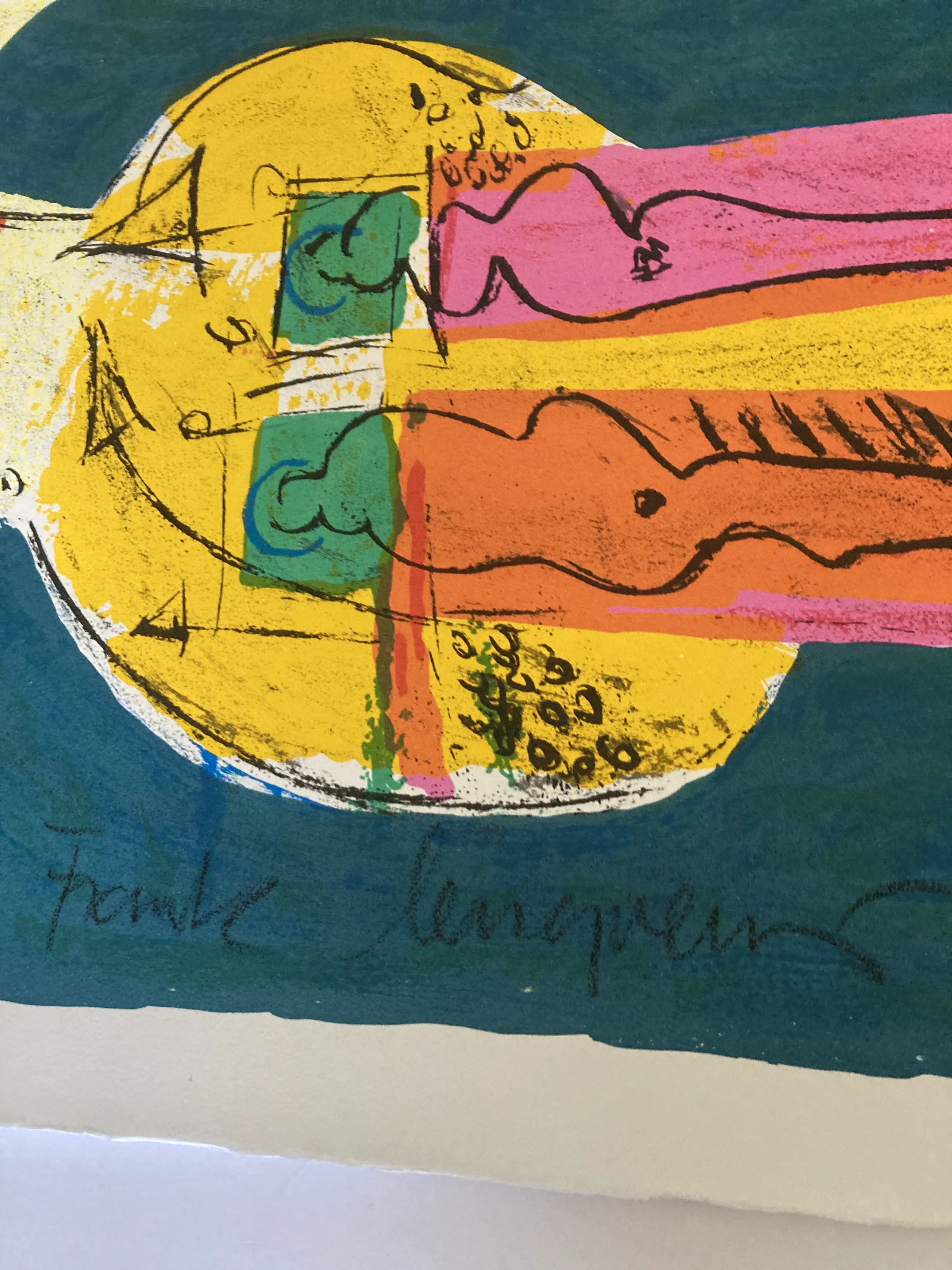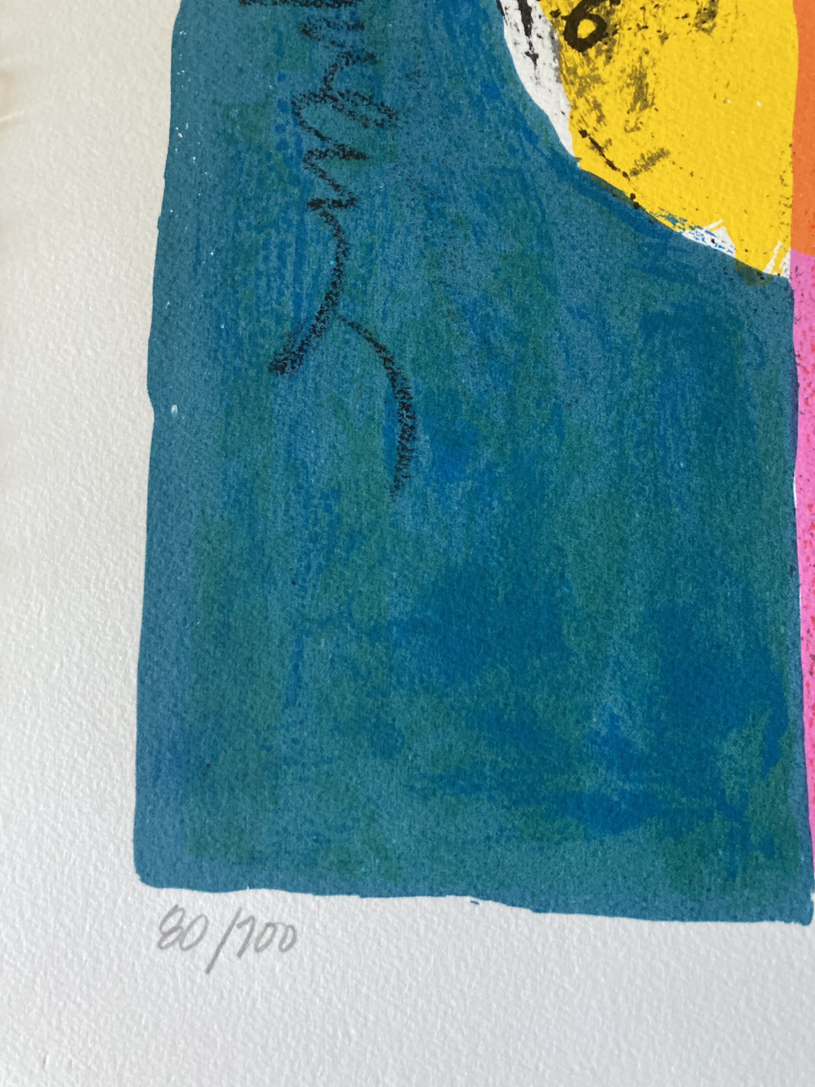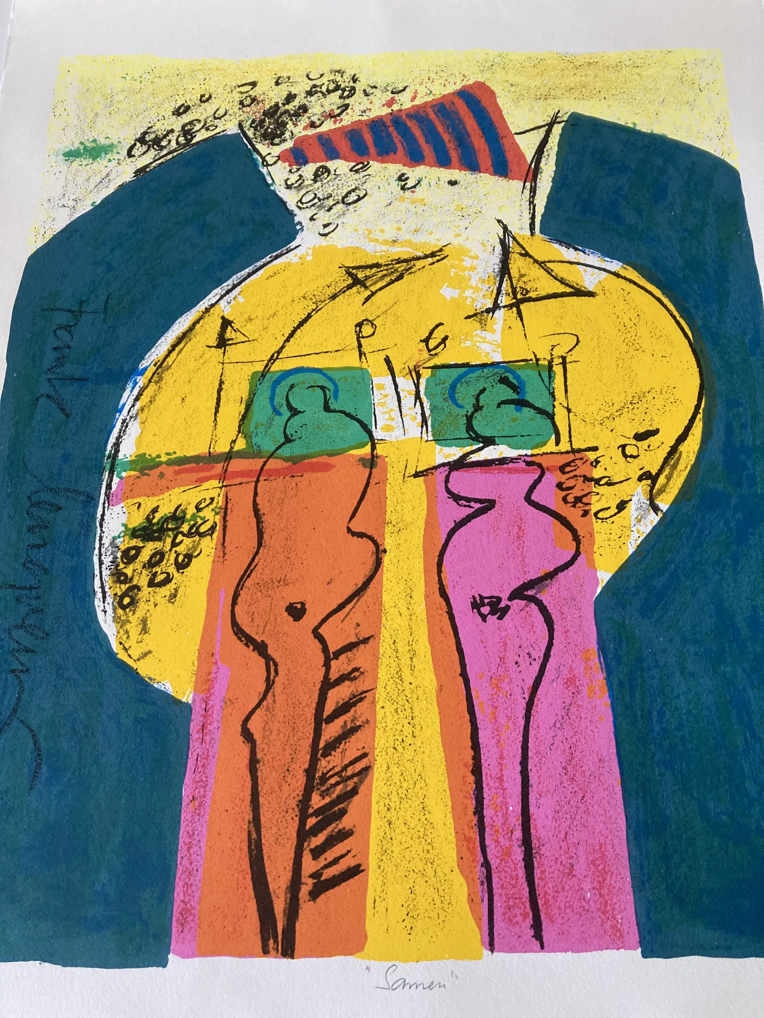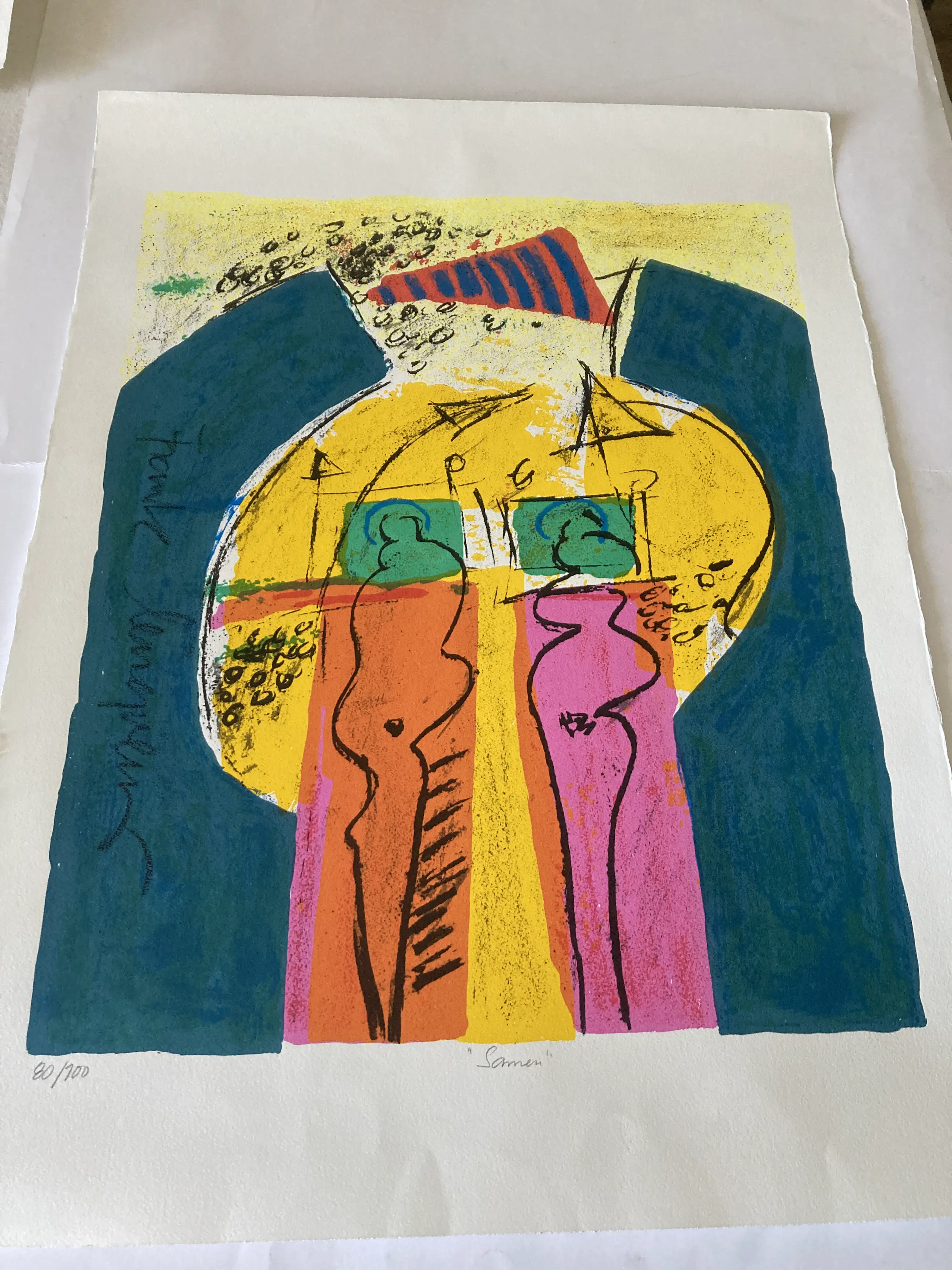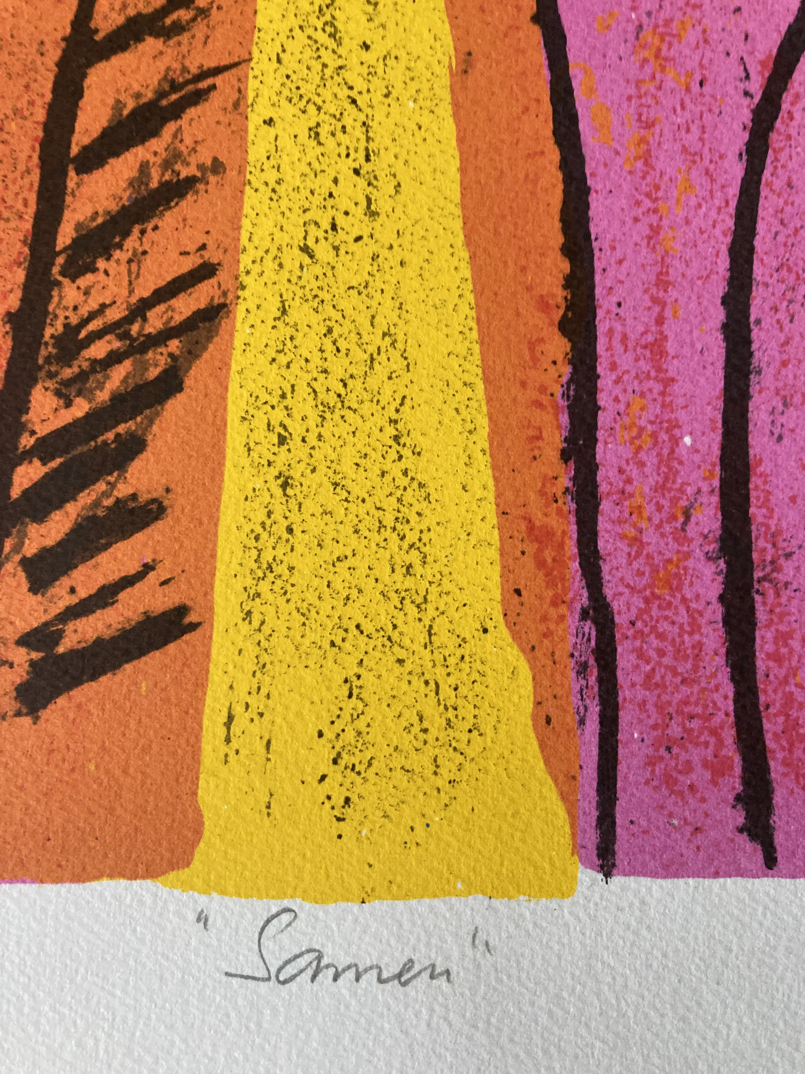 Kleurrijke zeefdruk. De kunstenaar heeft met zwart krijt/potlood in de voorstelling gesigneerd. Met l.o. 80/100 met potlood en in het midden “ Samen “met potlood.