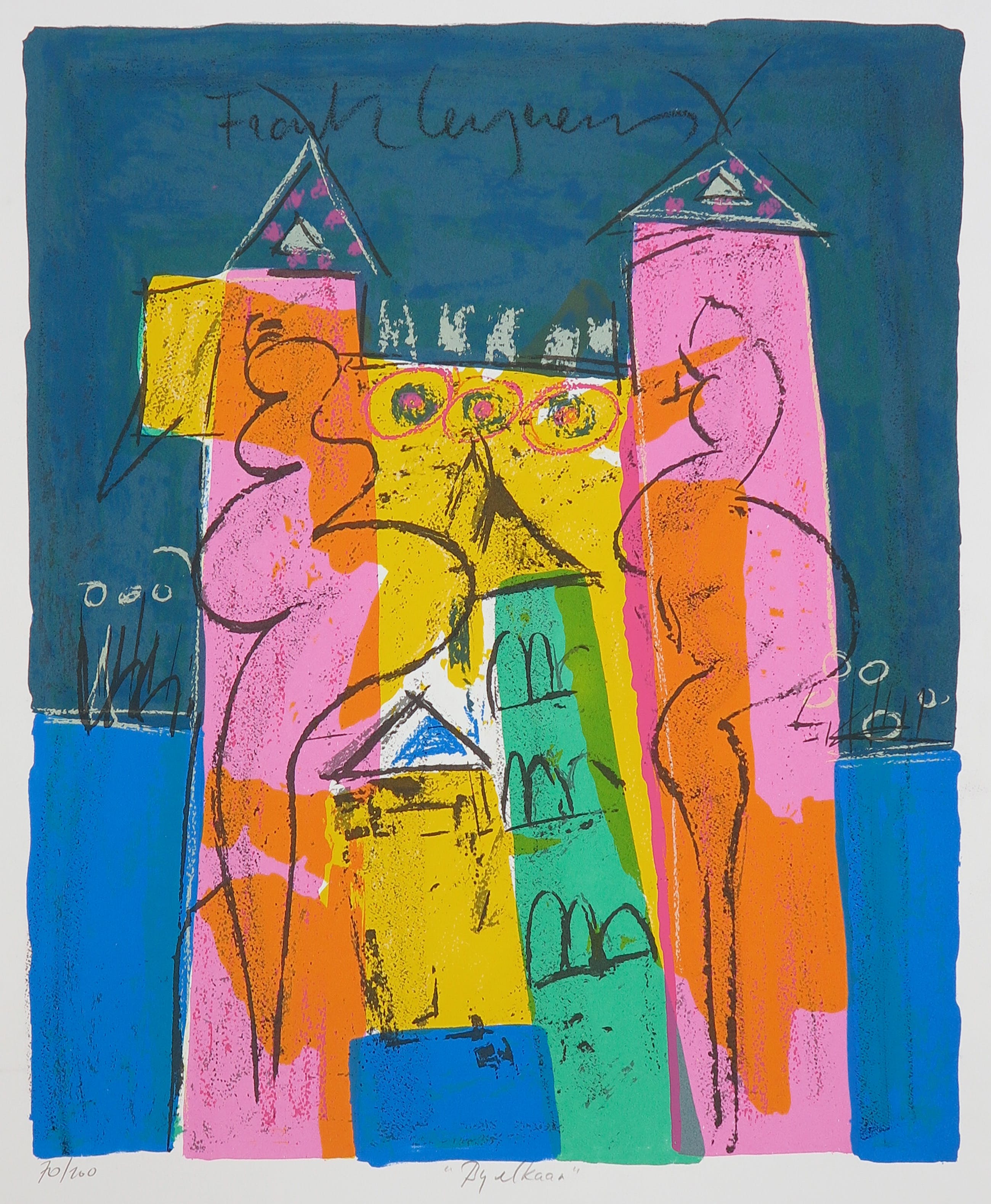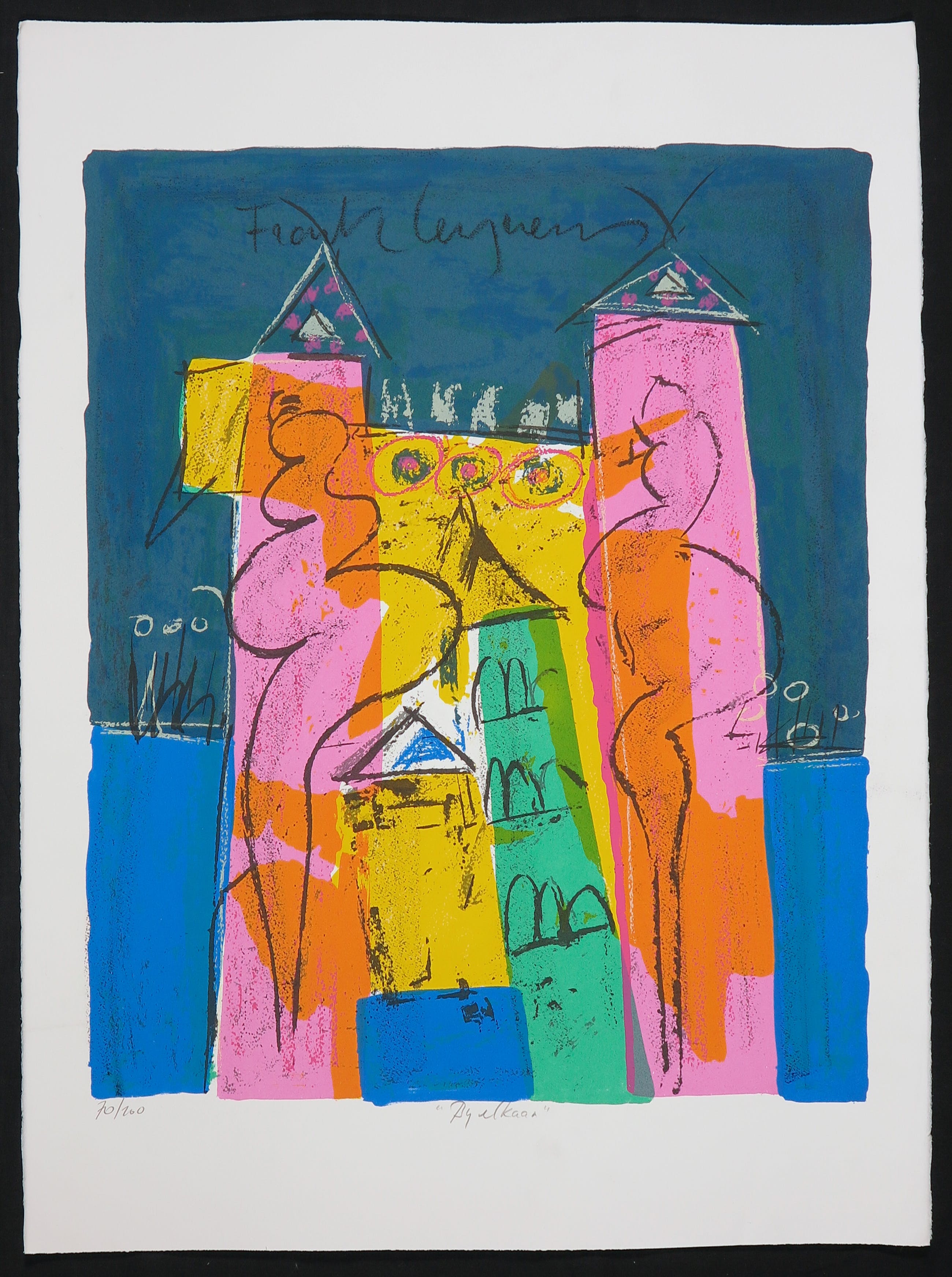 Kleurrijke zeefdruk door Frank Lengvenius. De kunstenaar heeft met zwart krijt/potlood in de voorstelling gesigneerd.
