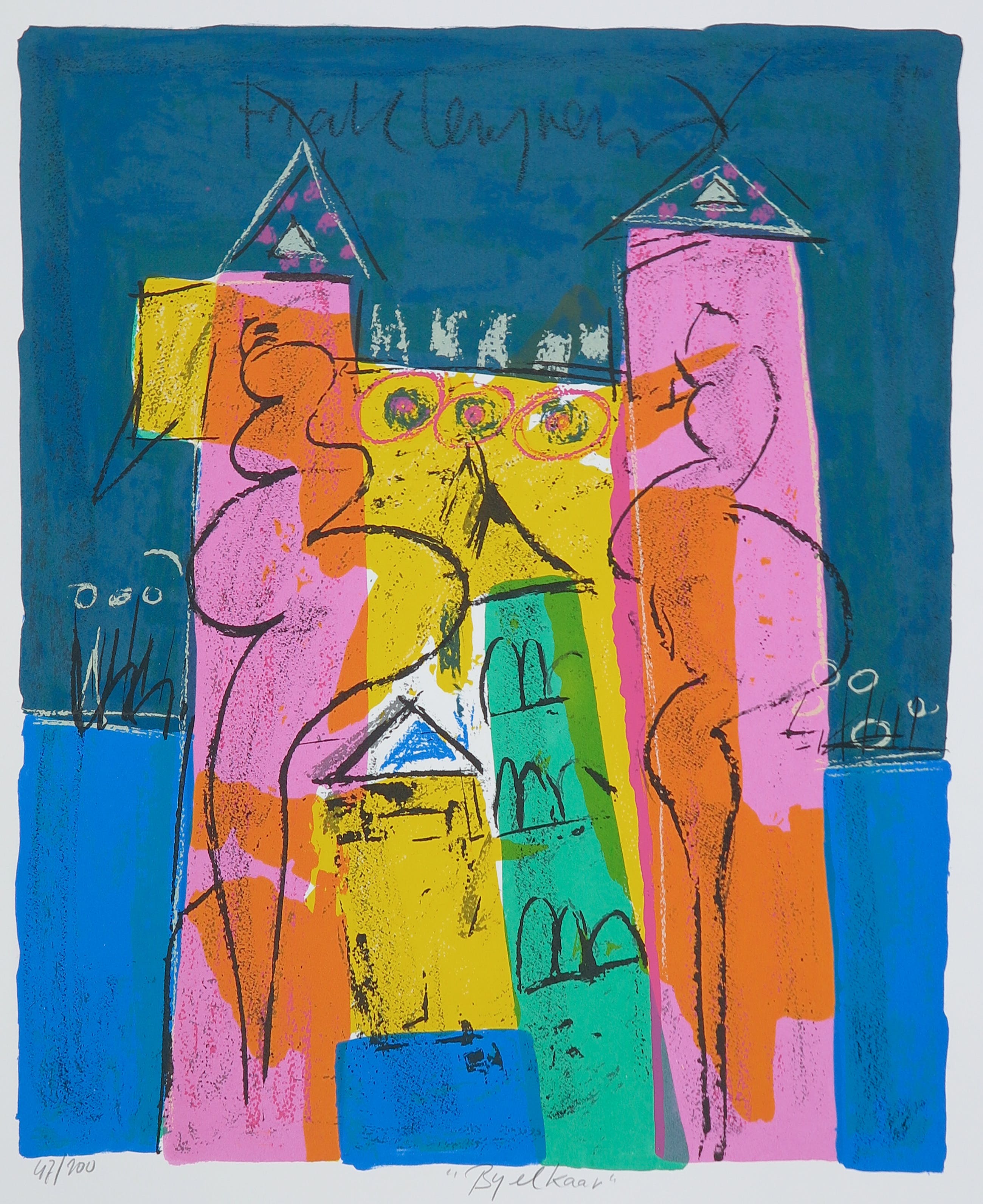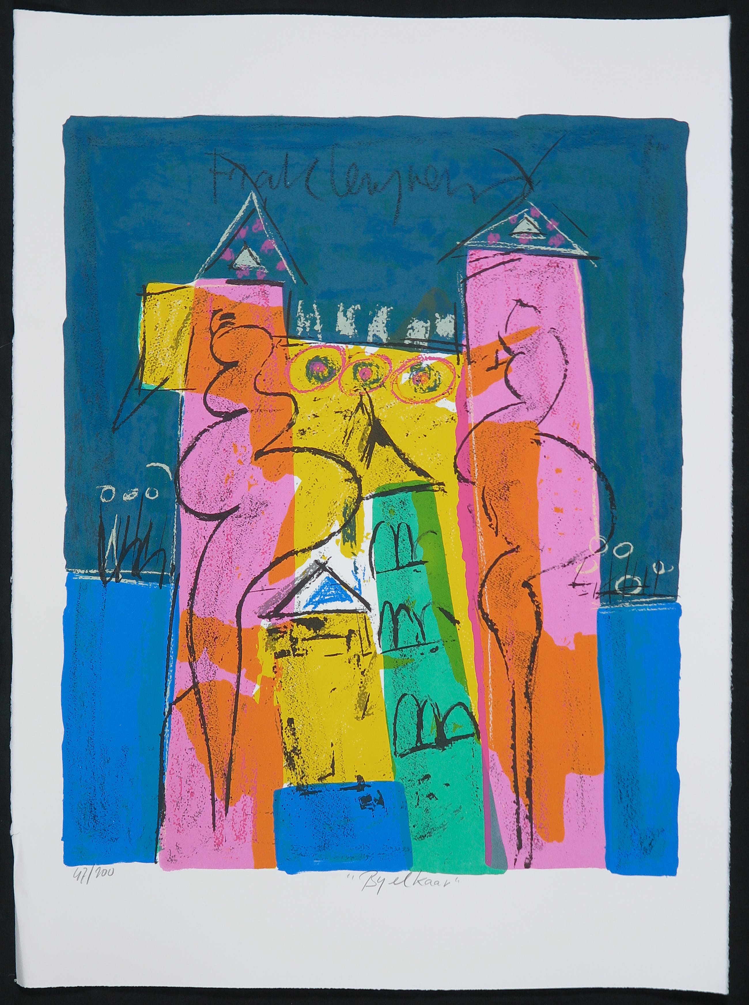 Kleurrijke zeefdruk door Frank Lengvenius. De kunstenaar heeft met zwart krijt/potlood in de voorstelling gesigneerd.