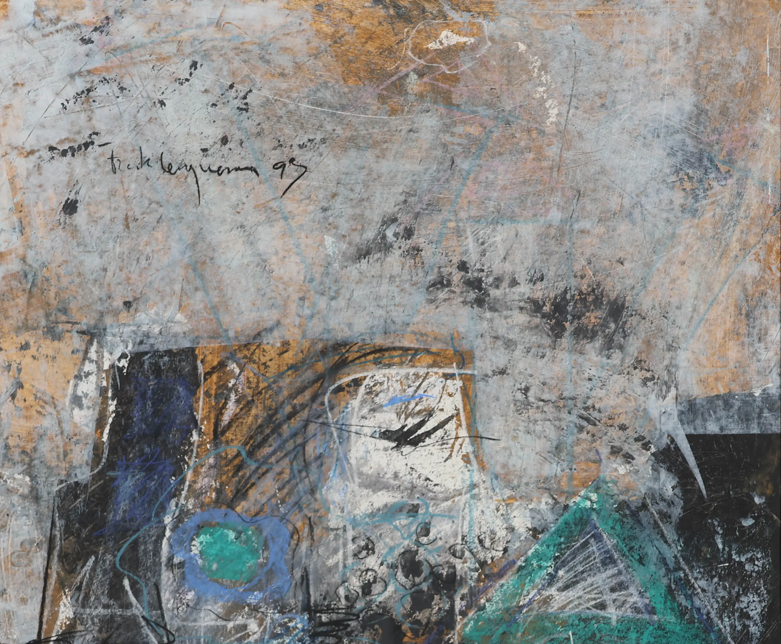 Frank Lengvenius (Brunssum, 1952) maakt abstracte, soms figuratieve werken die opvallen door hun zware, steenachtige uitstraling, ondanks dat ze op licht doek zijn geschilderd. Met warme aardtinten en subtiele combinaties van bruin, grijs en roodbruin verwijst hij naar het verleden, zoals prehistorische grottekeningen. Door pigmenten te mengen met zand en in het oppervlak te krassen, ontstaan gelaagde structuren en symbolische tekens die zijn werk een expressieve maar tegelijk rustige uitstraling geven. Zijn schilderijen, vaak opgebouwd als collages met levendige lijnvoering, verbeelden thema’s als het stedelijk leven, herinneringen en emoties, en variëren van donker en dramatisch tot licht en feestelijk. Zijn werk is internationaal tentoongesteld, onder andere in Frankfurt, Gent en AmsterdamFrank Lengvenius (Brunssum, 1952) maakt abstracte, soms figuratieve werken die opvallen door hun zware, steenachtige uitstraling, ondanks dat ze op licht doek zijn geschilderd. Met warme aardtinten en subtiele combinaties van bruin, grijs en roodbruin verwijst hij naar het verleden, zoals prehistorische grottekeningen. Door pigmenten te mengen met zand en in het oppervlak te krassen, ontstaan gelaagde structuren en symbolische tekens die zijn werk een expressieve maar tegelijk rustige uitstraling geven. Zijn schilderijen, vaak opgebouwd als collages met levendige lijnvoering, verbeelden thema’s als het stedelijk leven, herinneringen en emoties, en variëren van donker en dramatisch tot licht en feestelijk. Zijn werk is internationaal tentoongesteld, onder andere in Frankfurt, Gent en Amsterdam