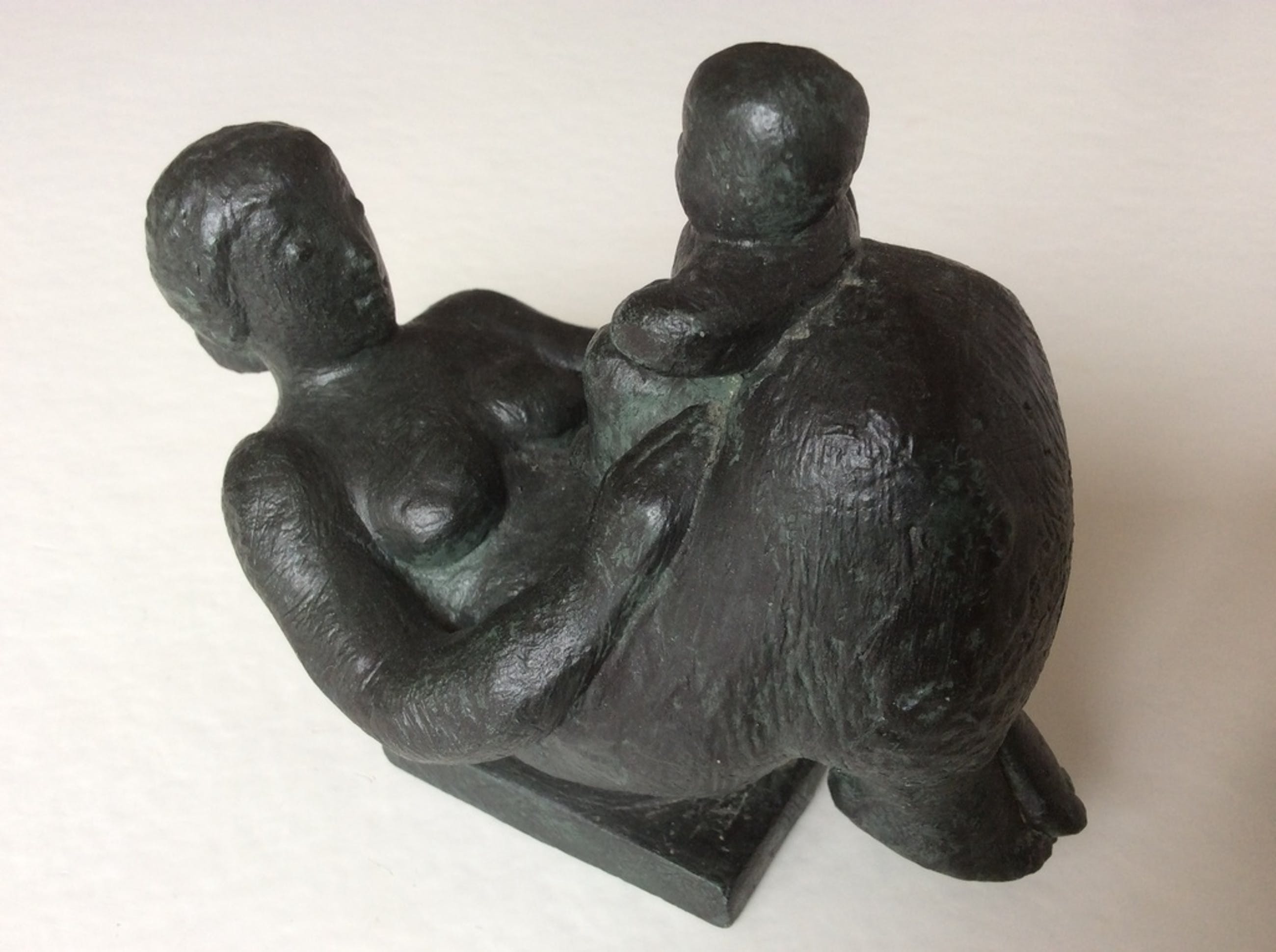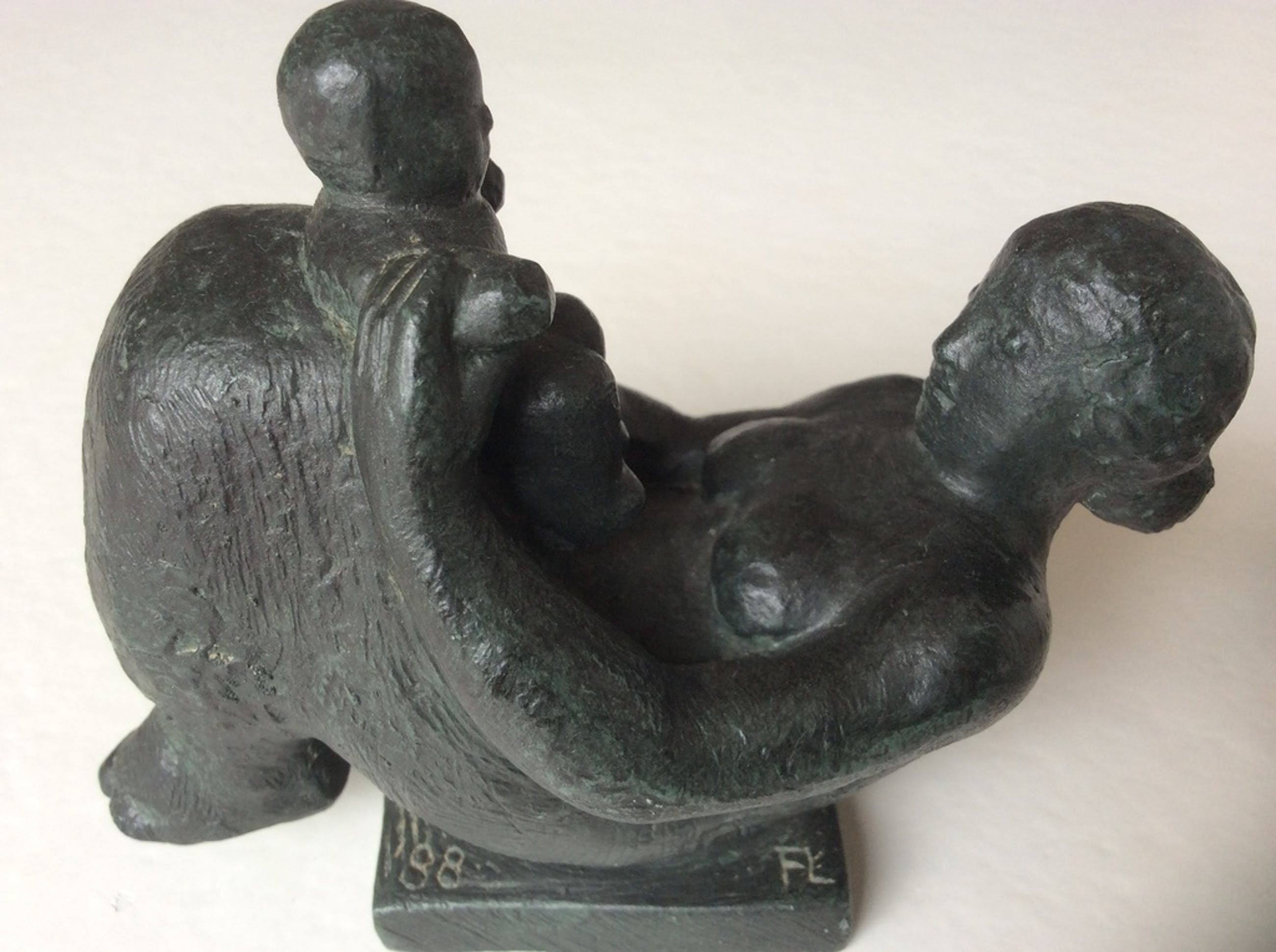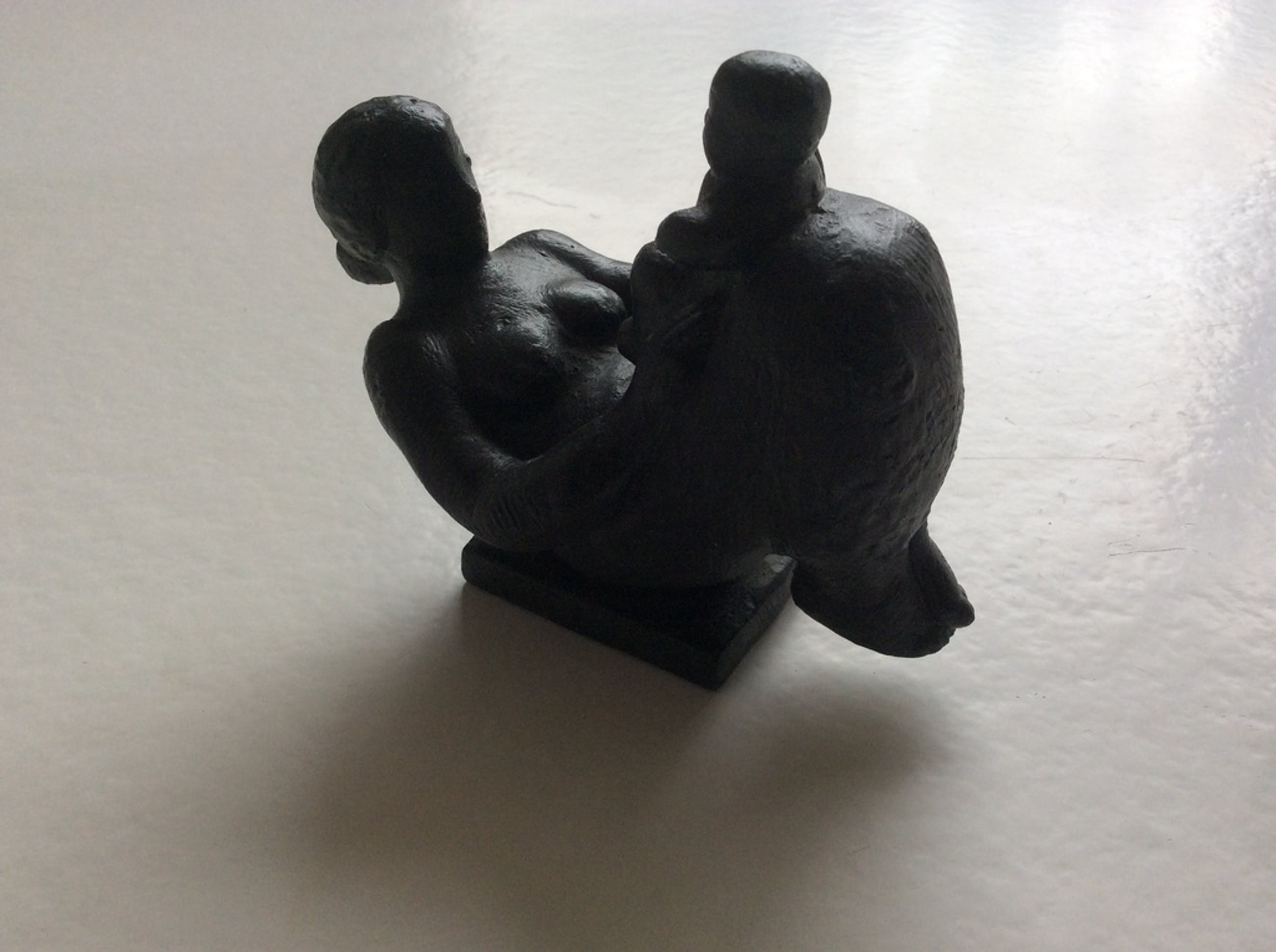 van beeldhouwer Frank Letterie: Geborgen Begin. Kunststenen beeld uit 1988, naar een groot beeldhouwwerk met soortgelijk thema: Het Gezin. Lengte 12 cm, hoogte 10 cm. Gesigneerd FL en gedateerd '88 in de steen. In prima staat.