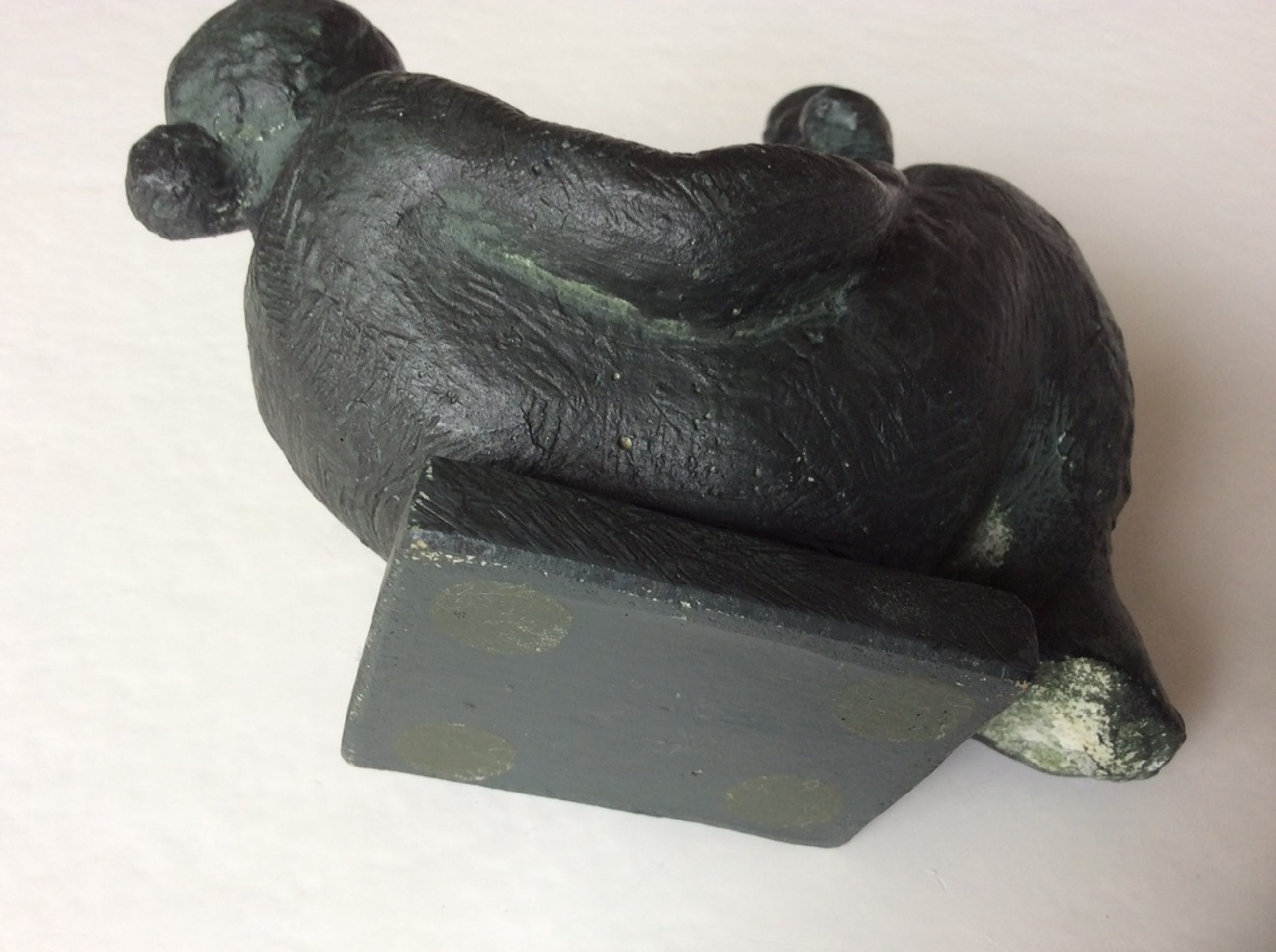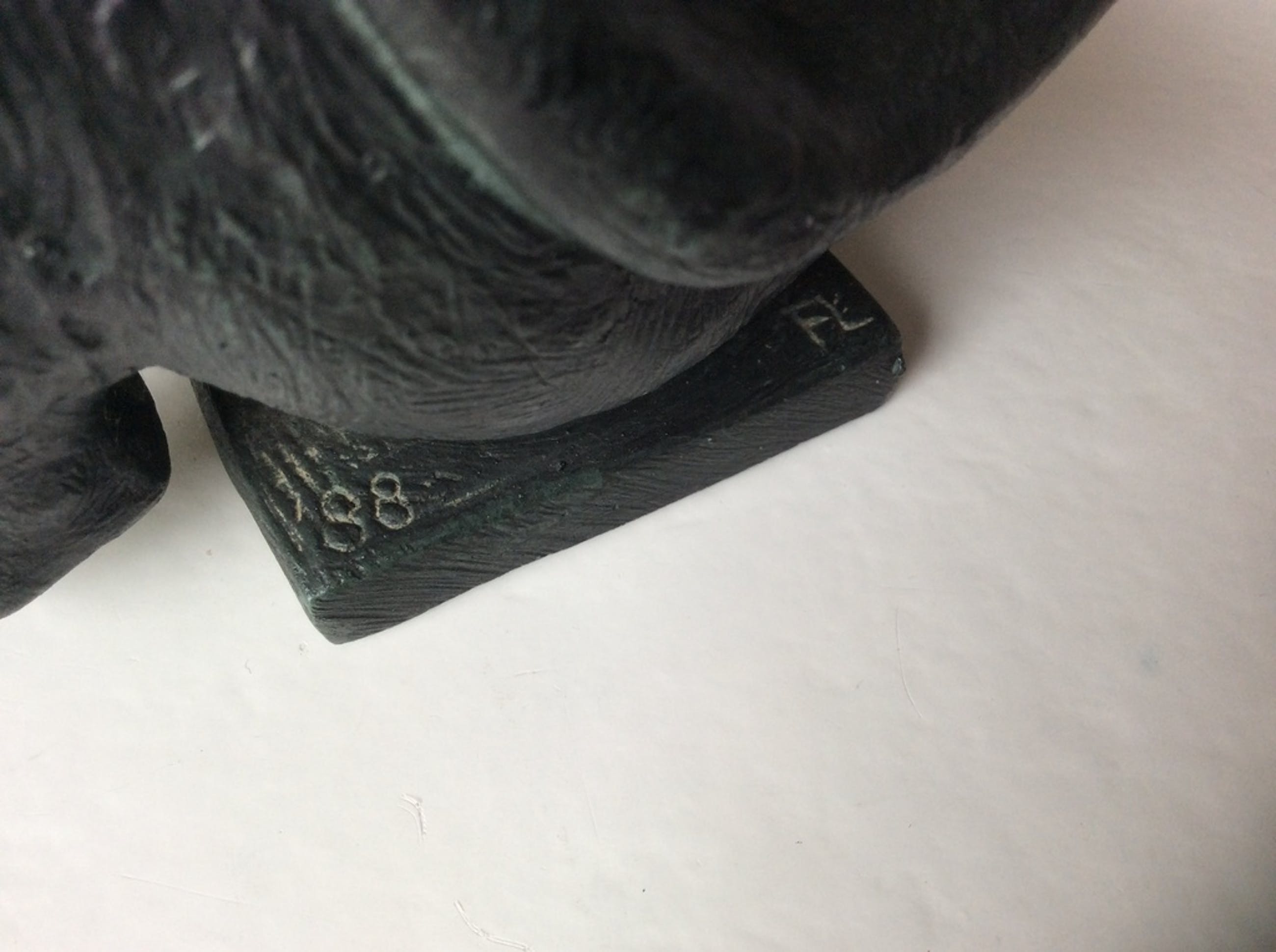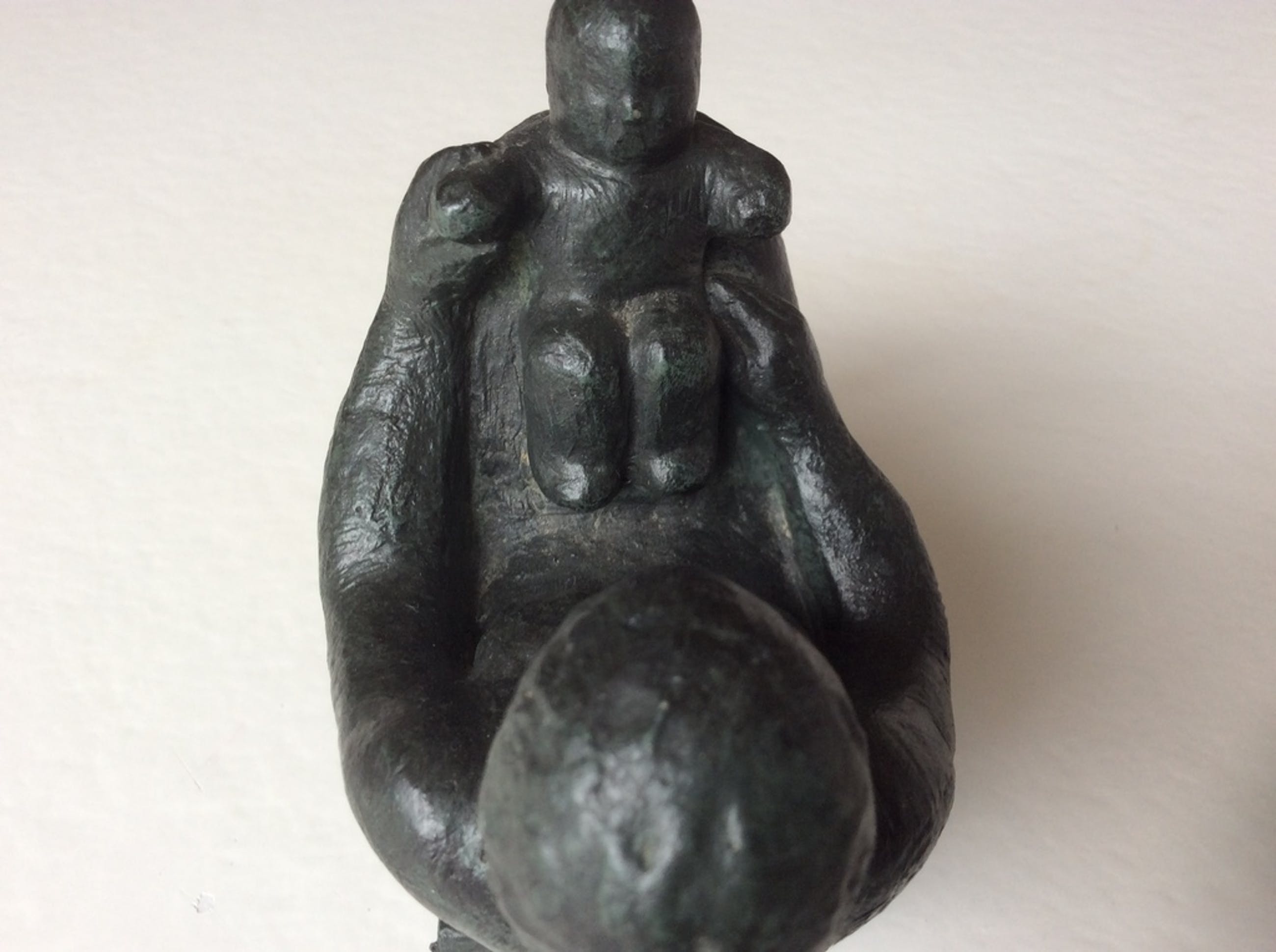 van beeldhouwer Frank Letterie: Geborgen Begin. Kunststenen beeld uit 1988, naar een groot beeldhouwwerk met soortgelijk thema: Het Gezin. Lengte 12 cm, hoogte 10 cm. Gesigneerd FL en gedateerd '88 in de steen. In prima staat.