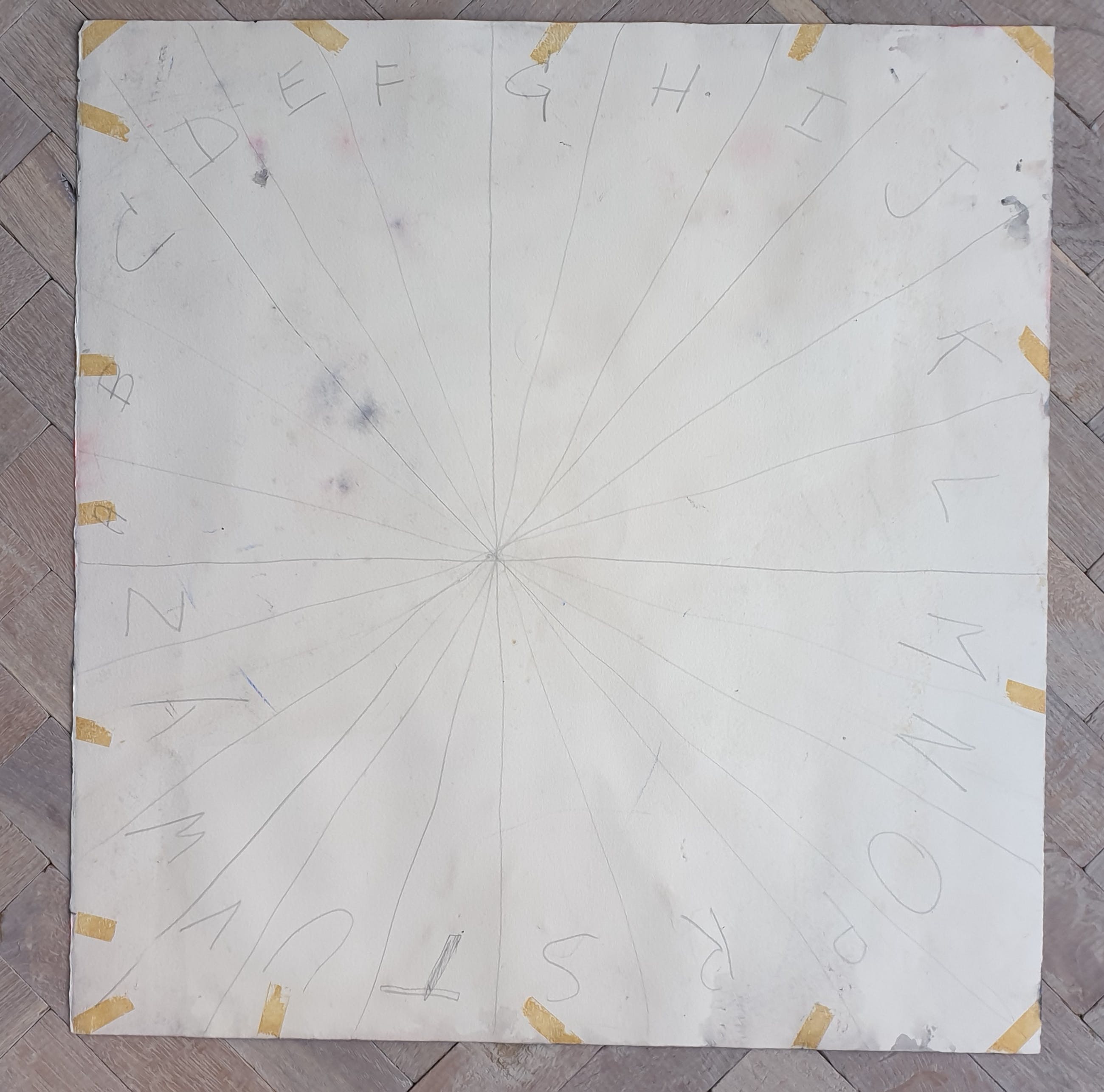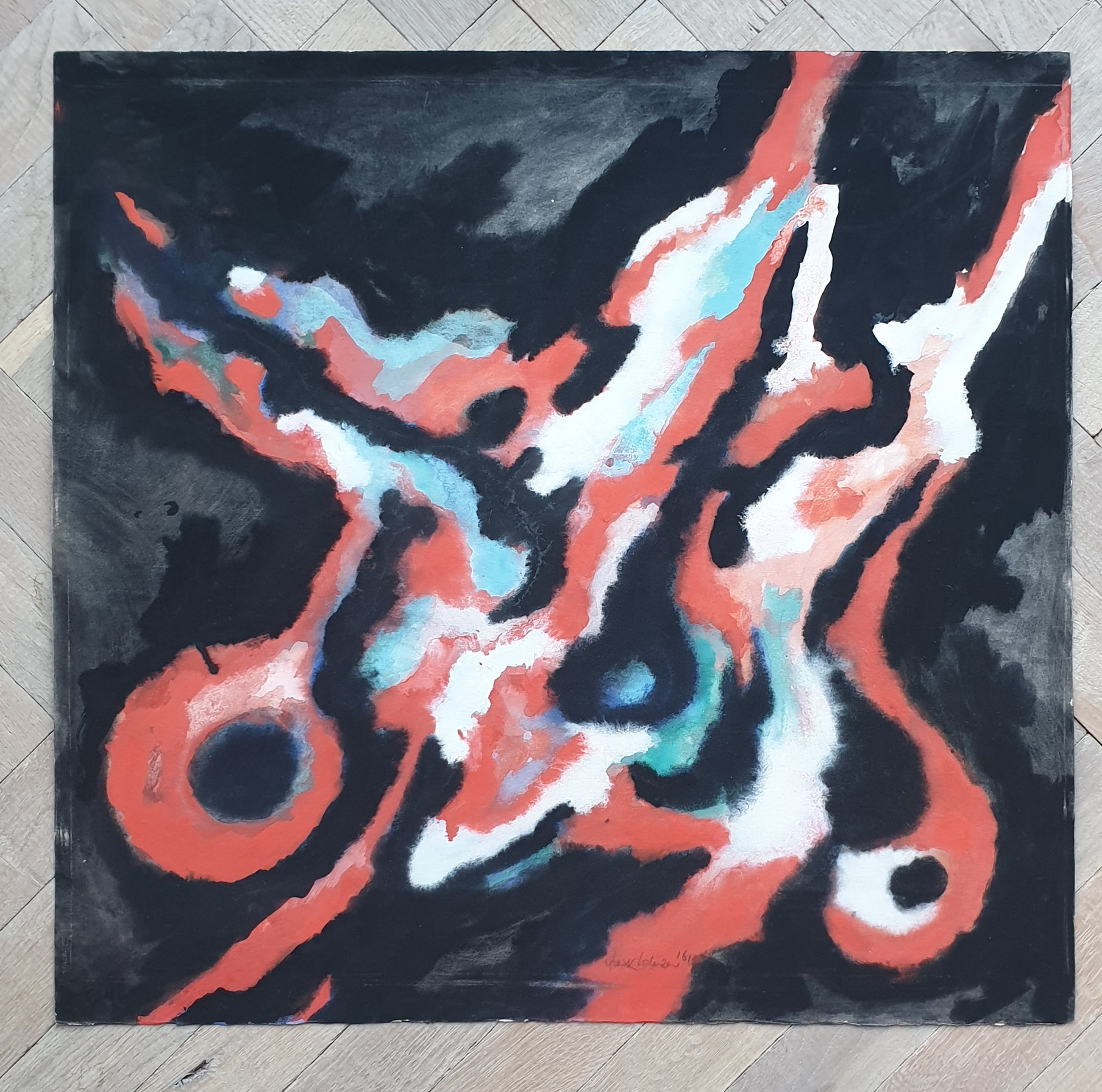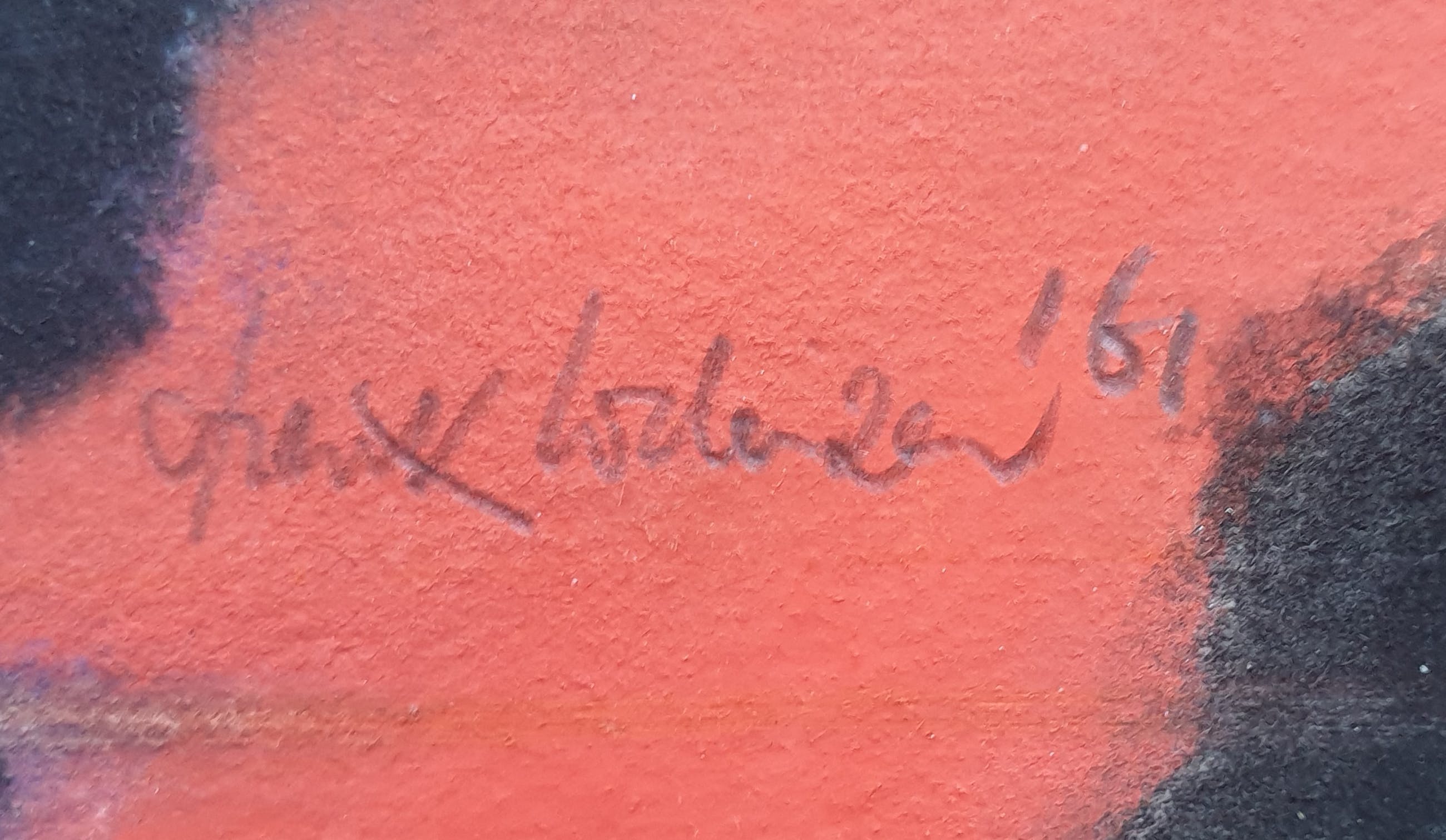 Gouache op dik papier van Frank Lodeizen uit 1961. Het werk met als titel verkeert in goede conditie en is fris van kleur. Er zijn wat sporen te zien van een eerdere inlijsting/passe partout. Op de achterzijde zijn wat oude lijmsporen van tape te zien. Wordt aangetekend verstuurd.