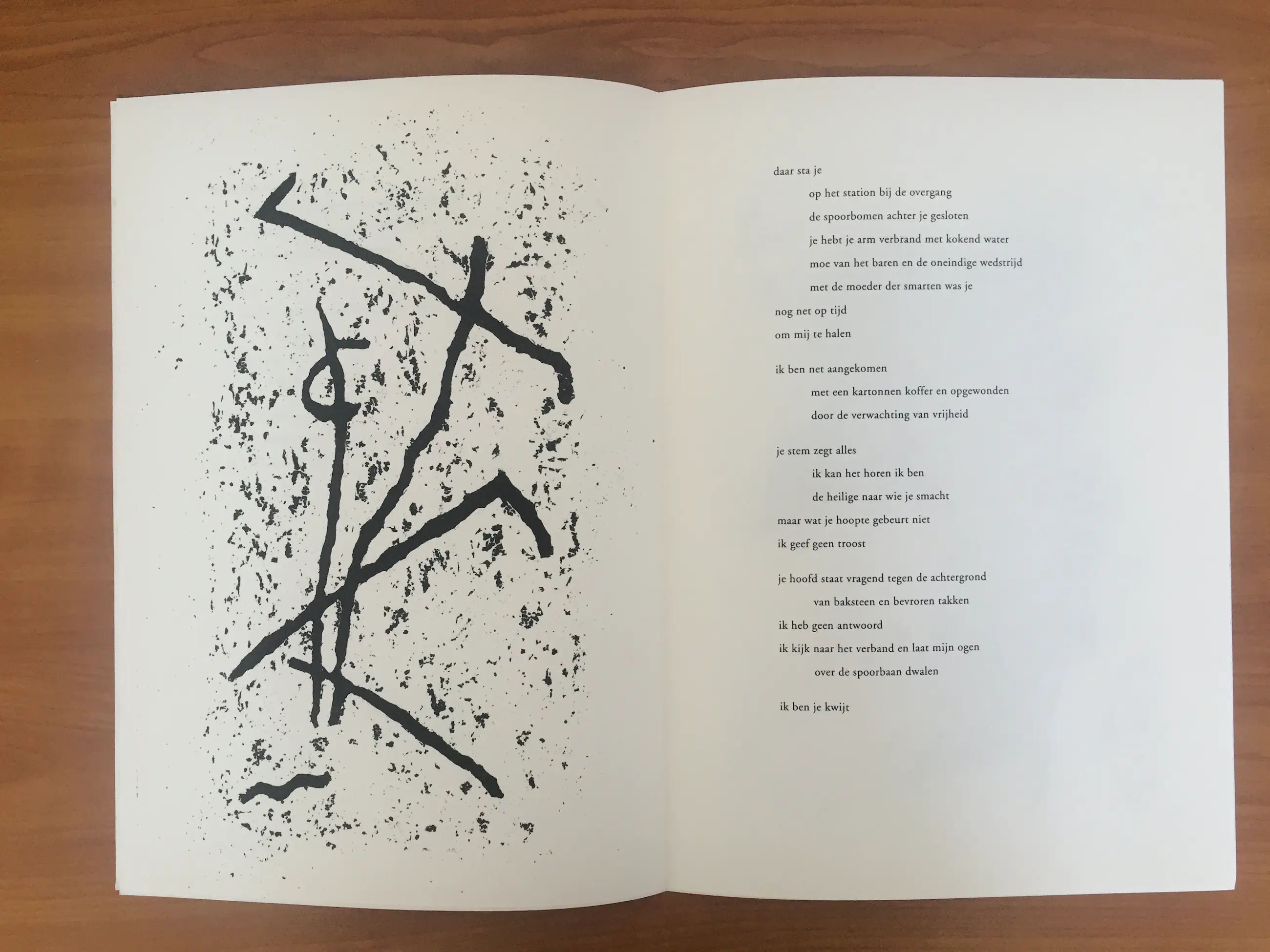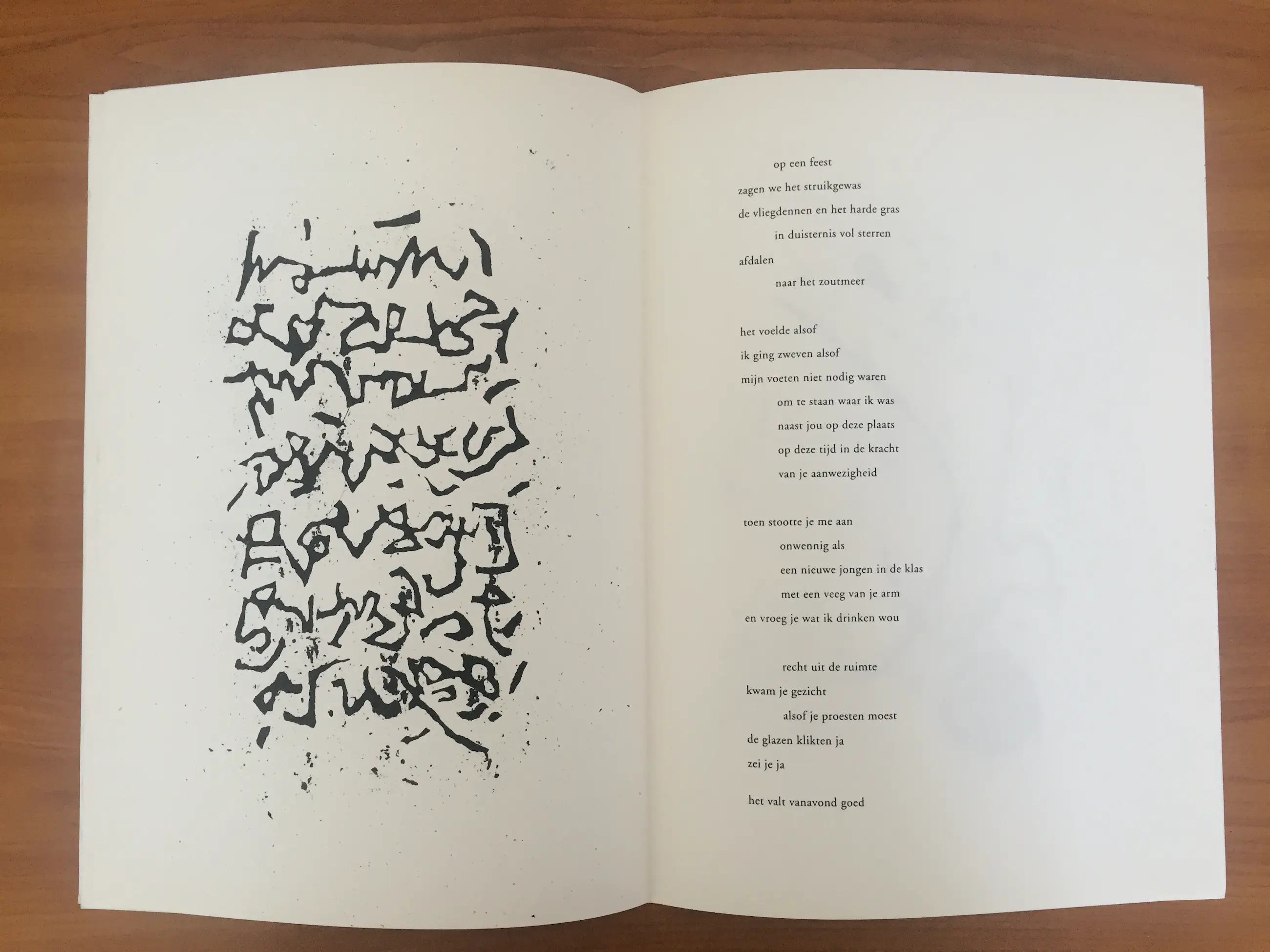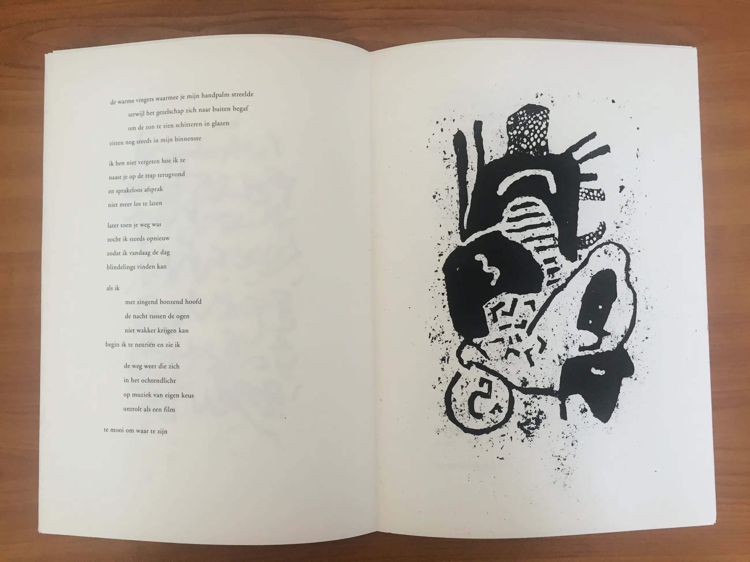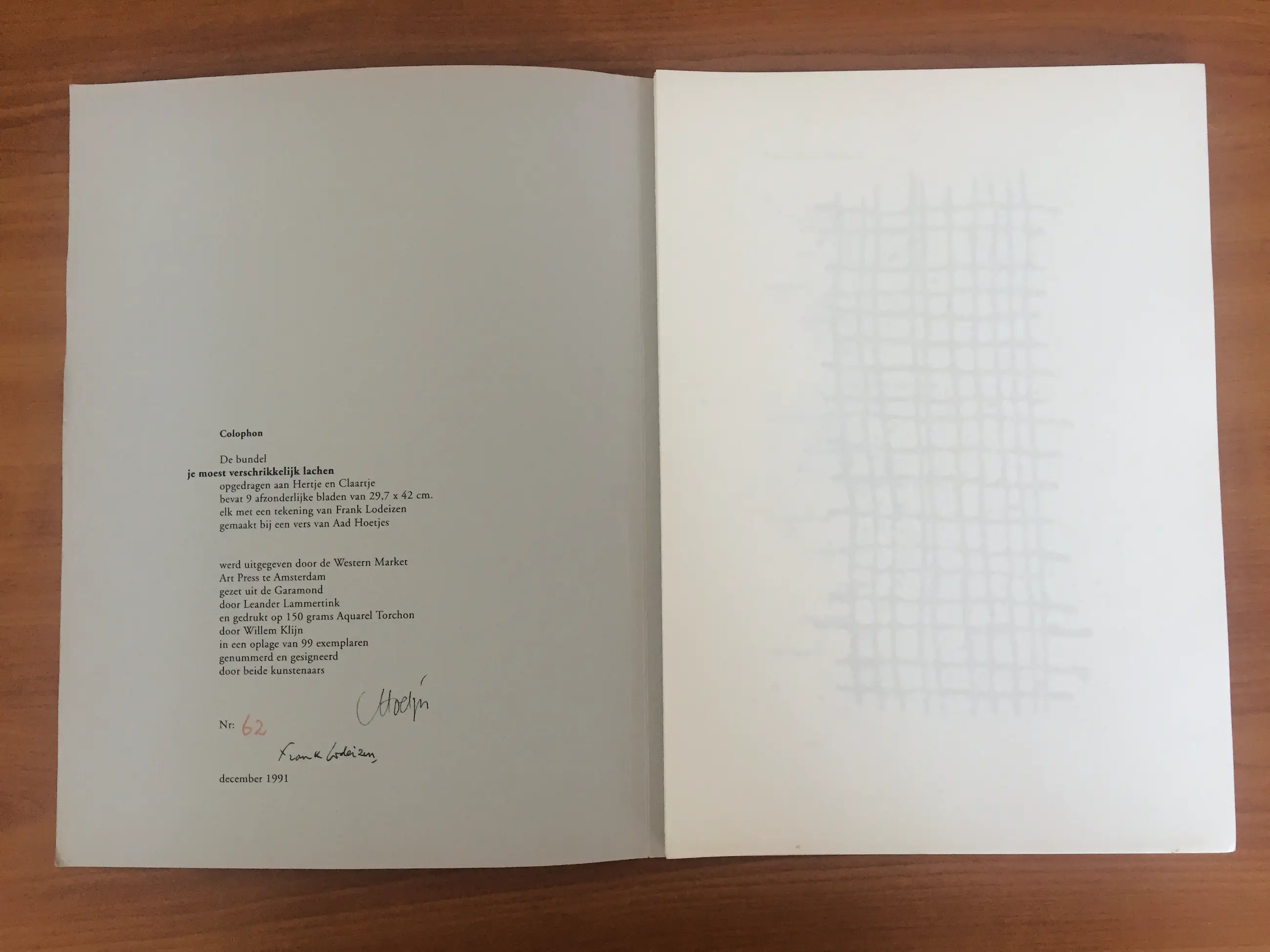 De bundel 'je moest verschrikkelijk lachen' bevat 9 afzonderlijke bladen van 29,7 x 42 cm elk met een tekening van Frank Lodeizen (1931 - 2013) gemaakt bij een vers van dichter Aad Hoetjes (1941). ) Oplage 99 exemplaren. Gesigneerd door beide kunstenaars.