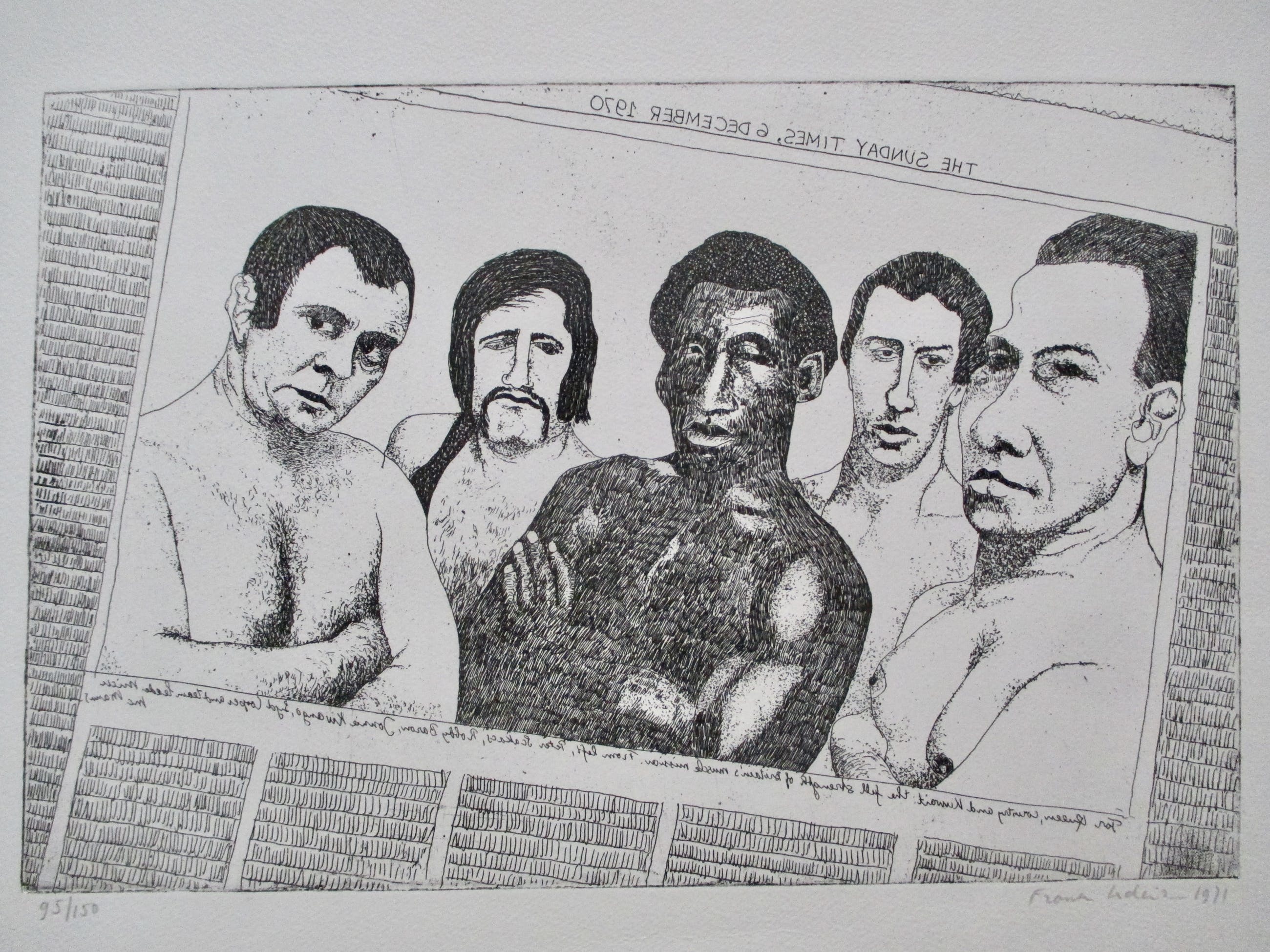 Ets van Frank Lodeizen, gesigneerd, genummerd en gedateerd in potlood. Verzending tussen twee platen, 8 euro, aangetekend 9,64