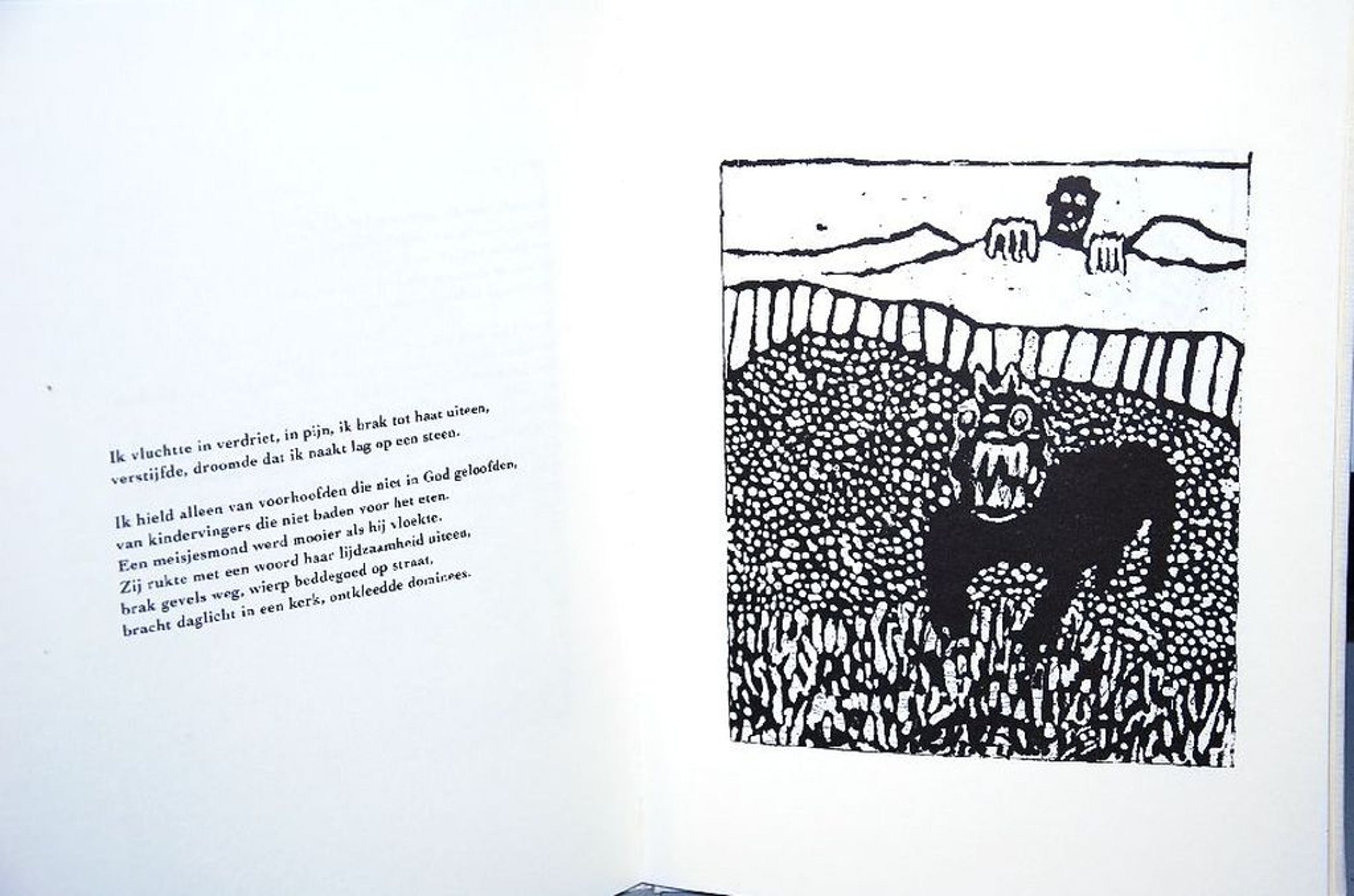 Materiaal: 18 prenten (incl. kaft) van Lodeizen. Houtsnedes of Linosnedes in boek.