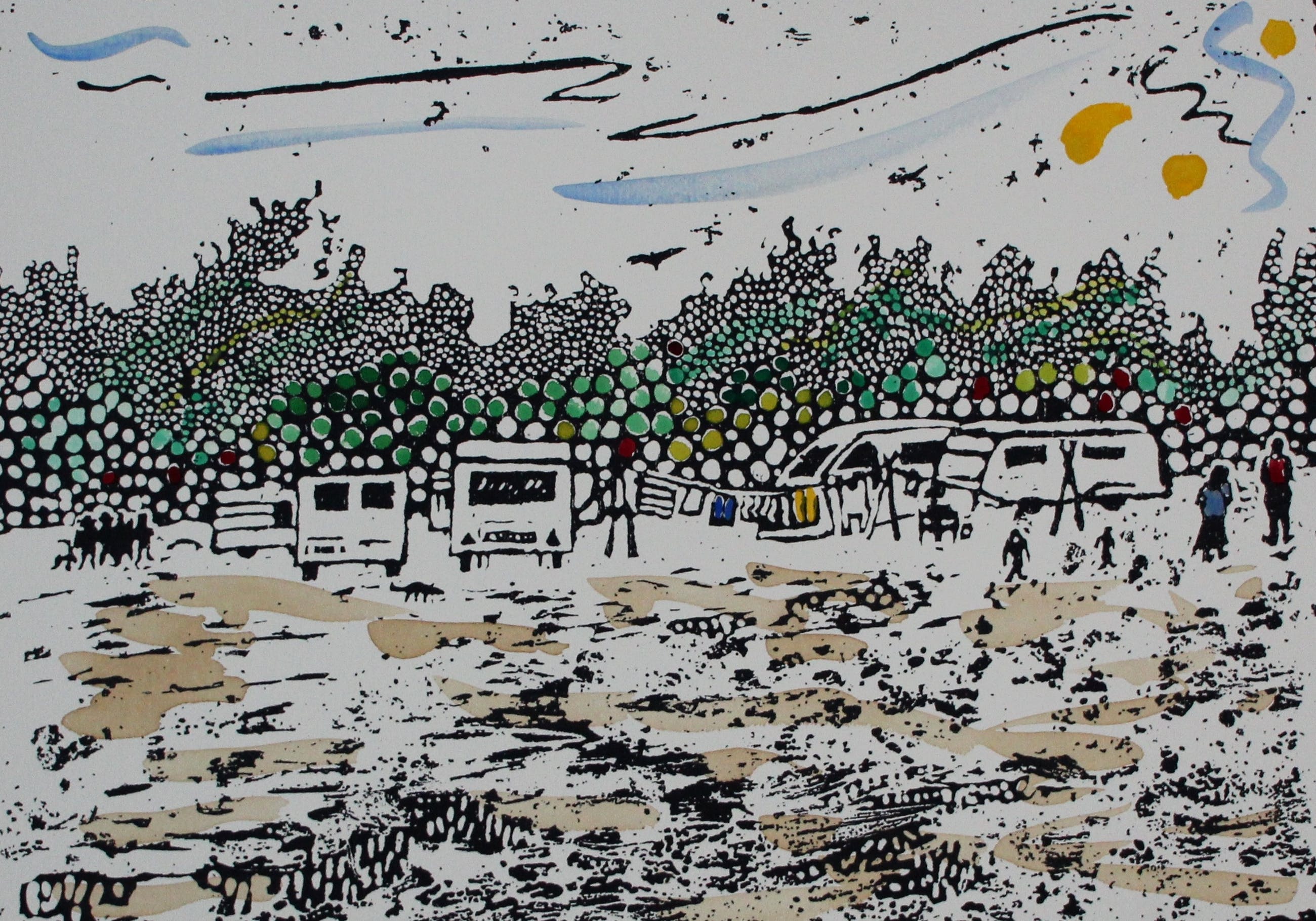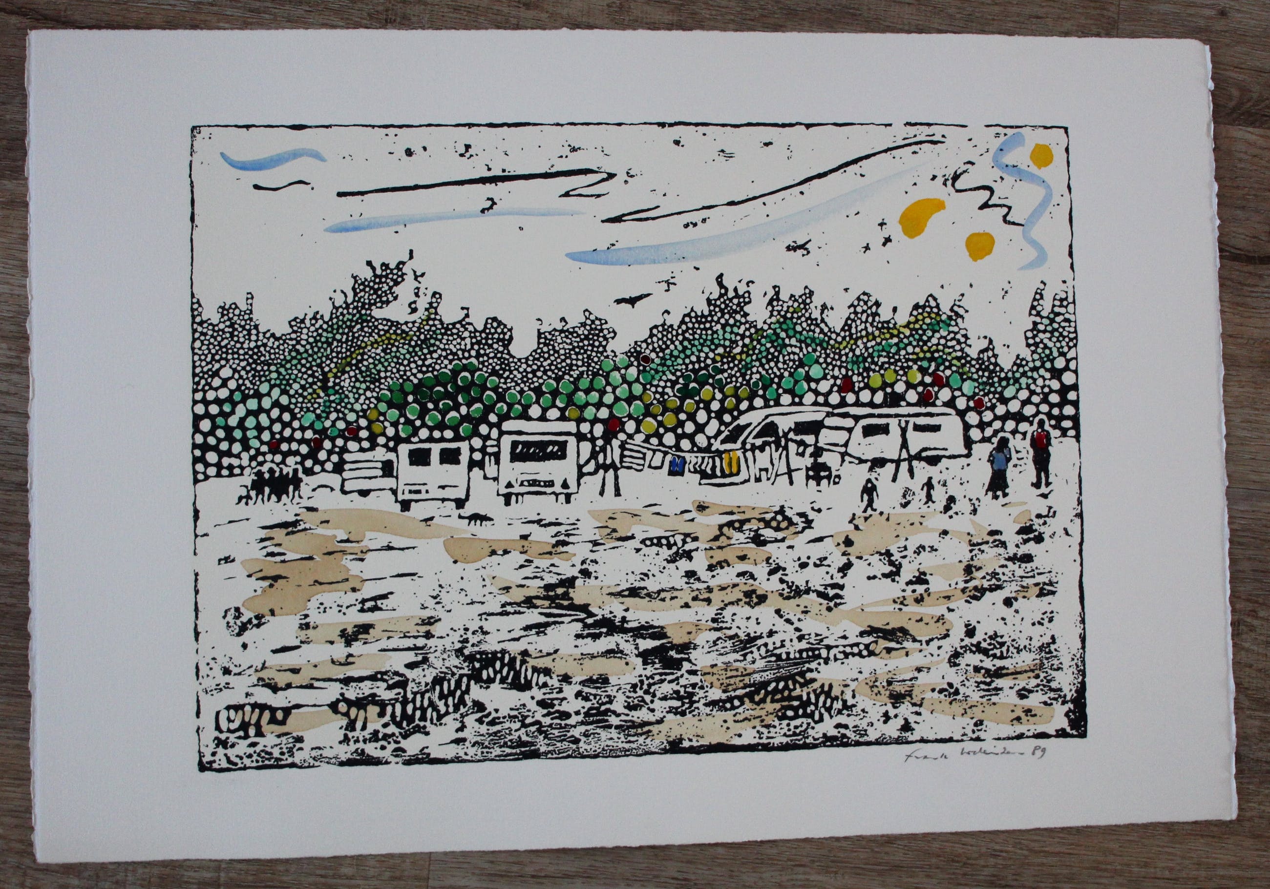 Zeefdruk met de hand ingekleurd van Frank Lodeizen. Uit de portfolio: "Zigeuners uit Amsterdam". Jaartal: 1989. Uitgegeven door Jaski Art Gallery in 1989. Oplage van 200. Dit exemplaar stamt uit een van de slechts 50 deluxe portfolio’s waarvan de zeefdrukken met de hand zijn gekleurd. Materiaal: Vélin Arches 250gr. (ongesneden) Afmetingen blad: H38 x b56.5cm. Afmetingen voorstelling: H29.5 x b41.5cm. Het werk is rechts onderaan gesigneerd door de kunstenaar. De authenticiteit van het aangeboden werk wordt volledig gegarandeerd. Een certificaat van echtheid kan, op aanvraag, worden gemaild.