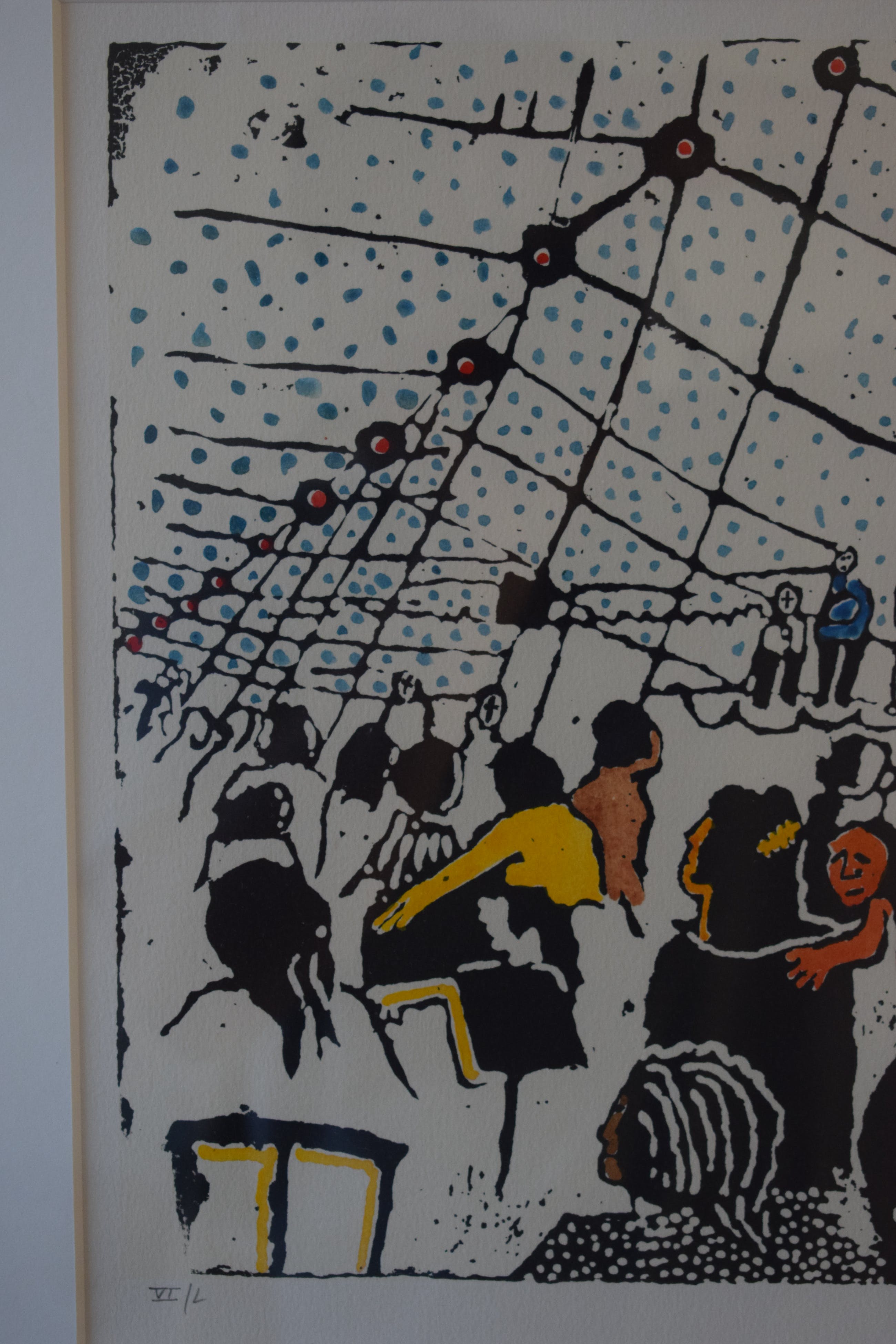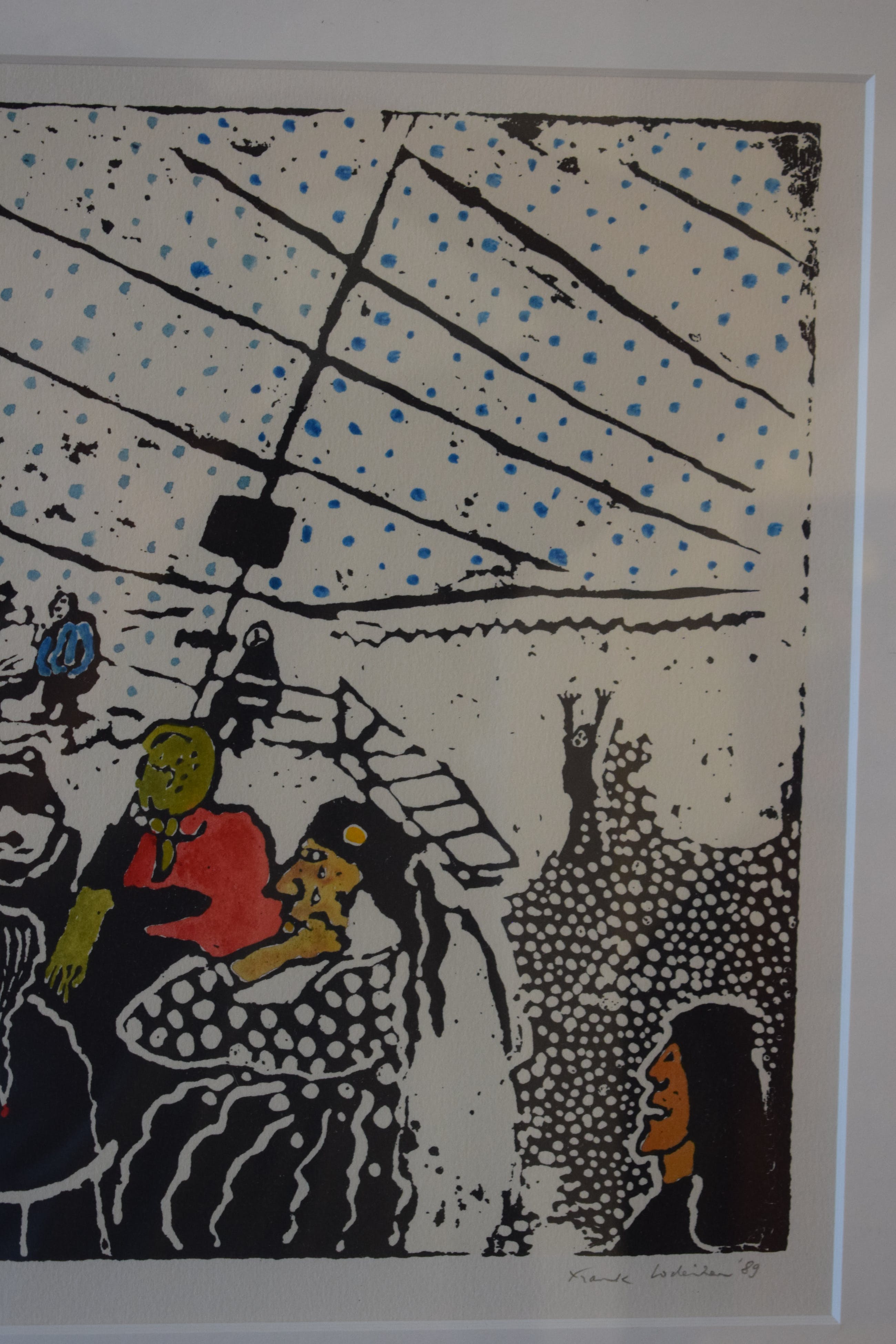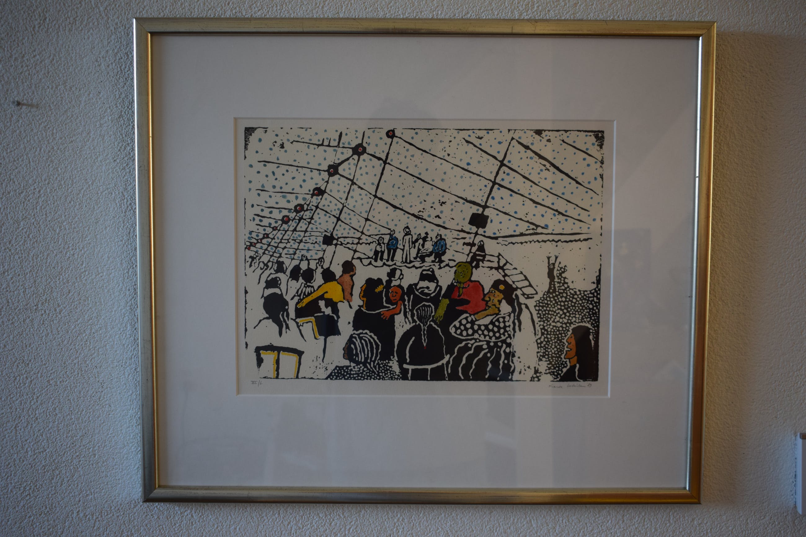 Zeefdruk met de hand ingekleurd van Frank Lodeizen. Uit de portfolio: "Zigeuners uit Amsterdam". Jaartal: 1989. Uitgegeven door Jaski Art Gallery in 1989. Oplage van 200. Dit exemplaar stamt uit een van de slechts 50 deluxe portfolio’s waarvan de zeefdrukken met de hand zijn gekleurd. Genummerd: VI / L Materiaal: Vélin Arches 250gr. (ongesneden) Afmetingen blad: H38 x b56.5cm. Afmetingen voorstelling: H29.5 x b41.5cm. Het werk is rechts onderaan gesigneerd door de kunstenaar. De lijst ziet er nog mooi uit, maar na 31 jaar heeft deze een paar hele kleine gebruikssporen her en der.