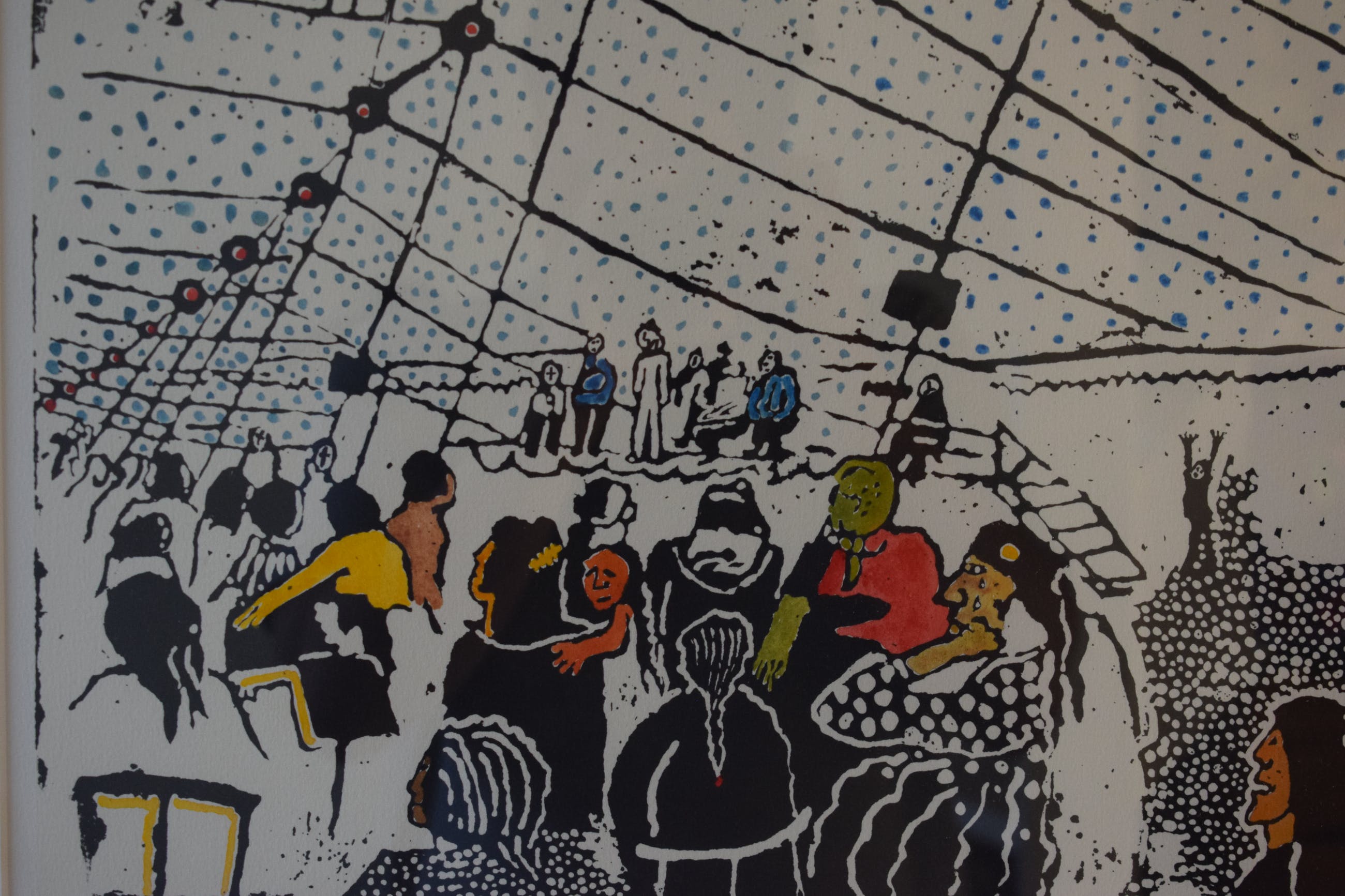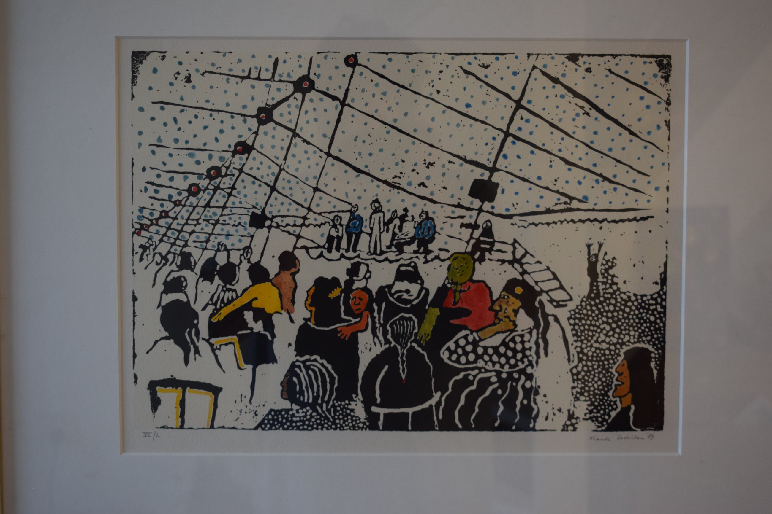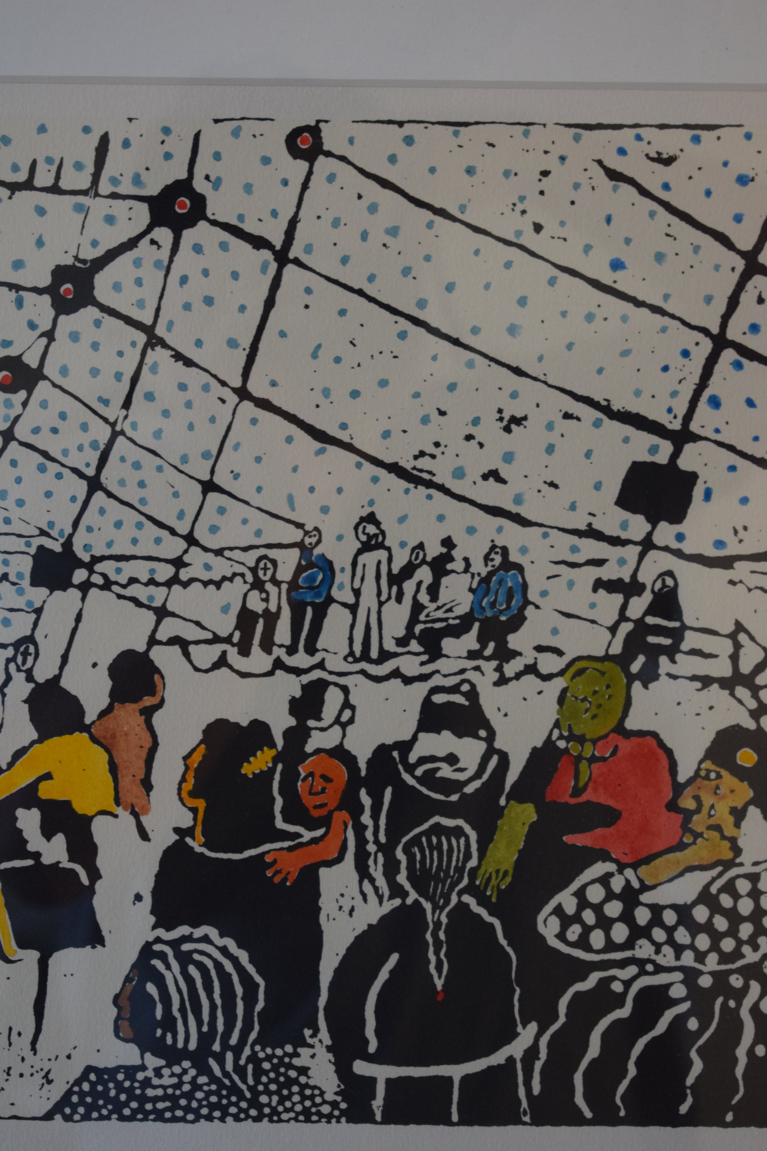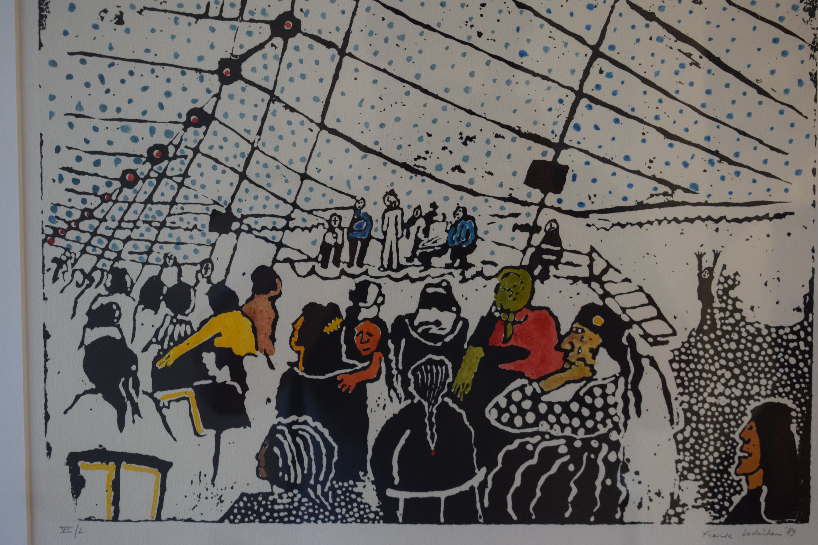 Zeefdruk met de hand ingekleurd van Frank Lodeizen. Uit de portfolio: "Zigeuners uit Amsterdam". Jaartal: 1989. Uitgegeven door Jaski Art Gallery in 1989. Oplage van 200. Dit exemplaar stamt uit een van de slechts 50 deluxe portfolio’s waarvan de zeefdrukken met de hand zijn gekleurd. Genummerd: VI / L Materiaal: Vélin Arches 250gr. (ongesneden) Afmetingen blad: H38 x b56.5cm. Afmetingen voorstelling: H29.5 x b41.5cm. Het werk is rechts onderaan gesigneerd door de kunstenaar. De lijst ziet er nog mooi uit, maar na 31 jaar heeft deze een paar hele kleine gebruikssporen her en der.