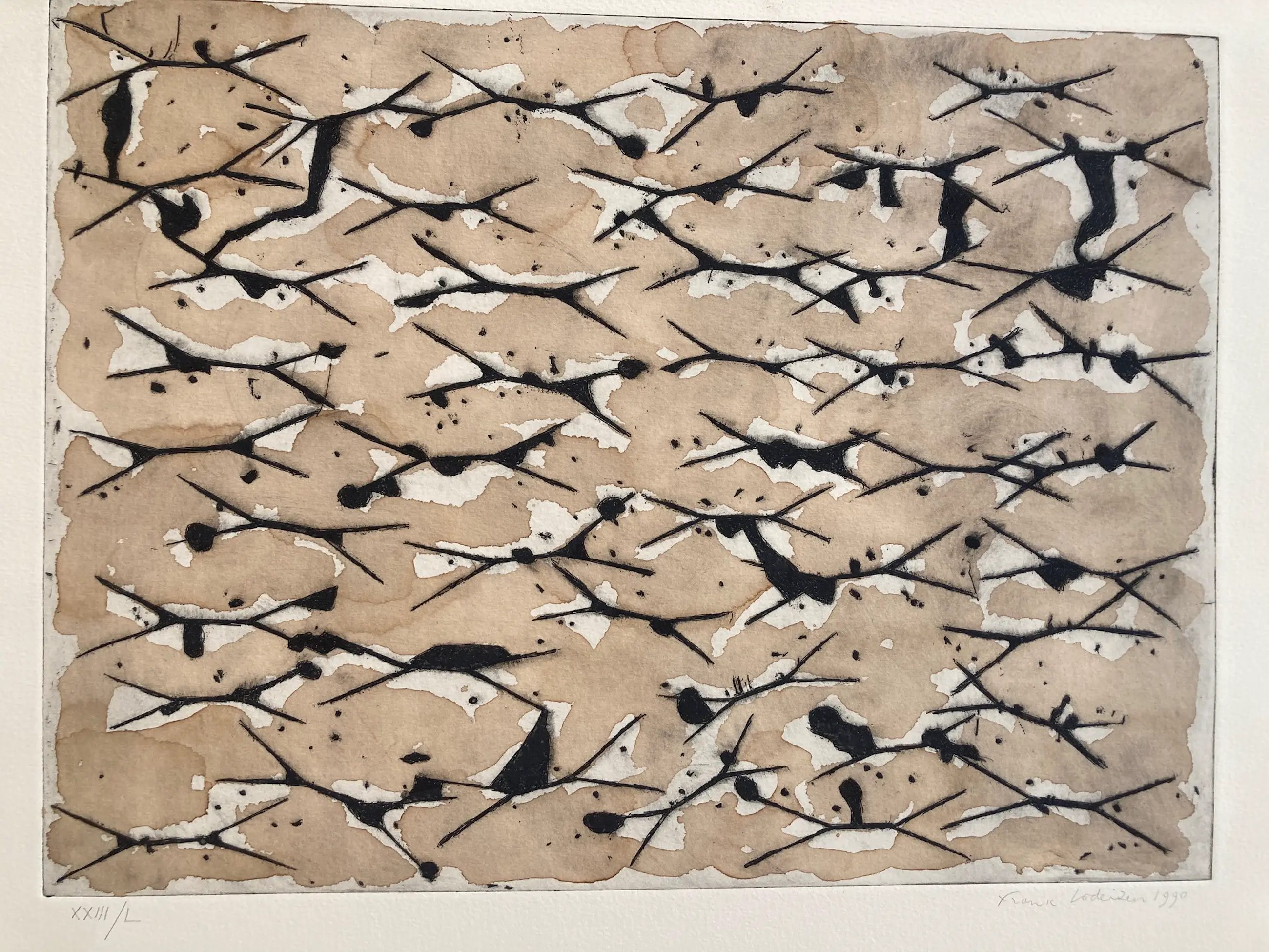 Mooie ets van de Amsterdamse kunstenaar Frank Lodeizen (1931-2013) die hij heeft ingekleurd met koffie. Gesigneerd met potlood. Romeins genummerd. De indruk en inleuring is in goede staat, op de randen om de ets heen zitten wat kleine vlekjes maar voor een deel lijkt dat ook koffie te zijn.