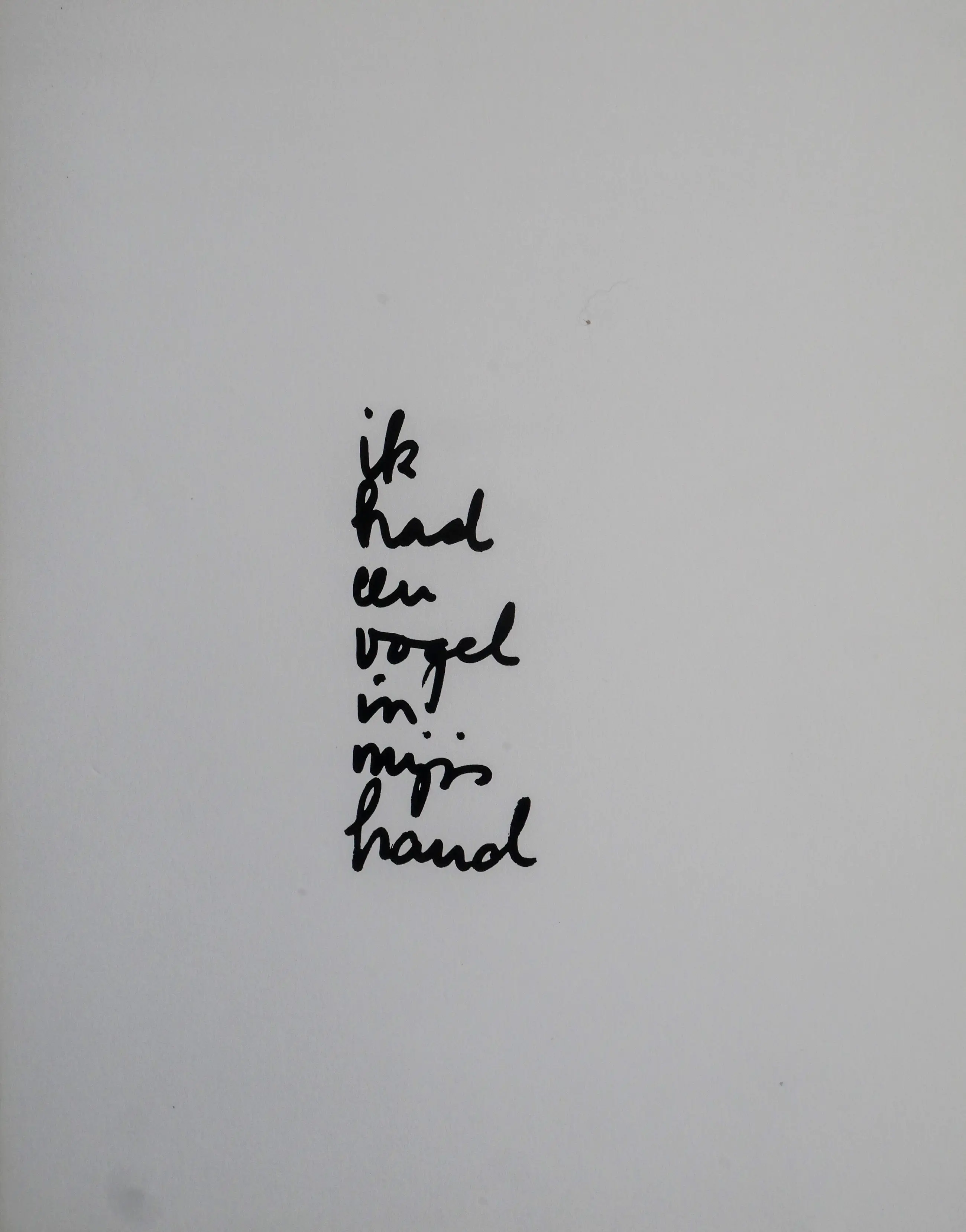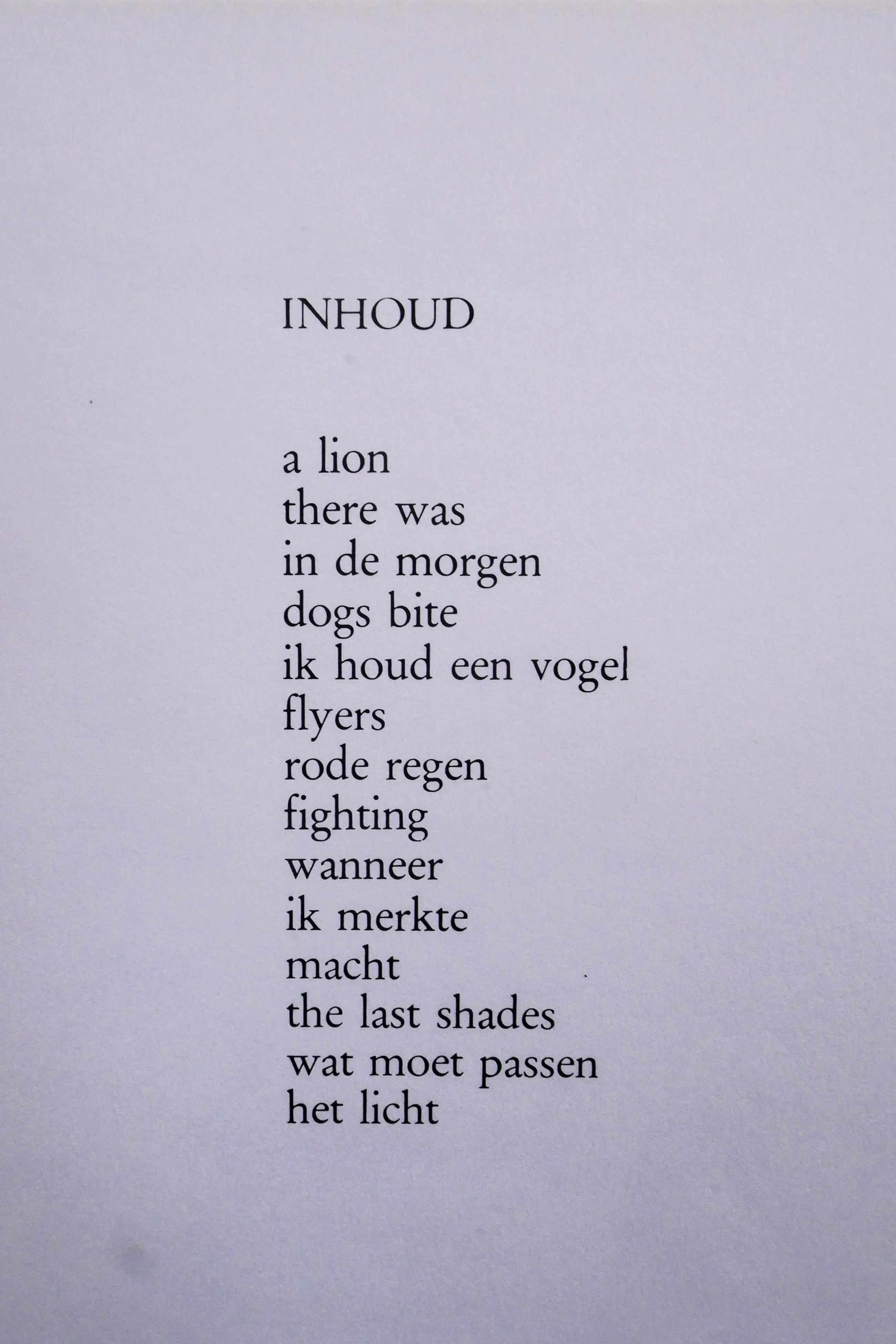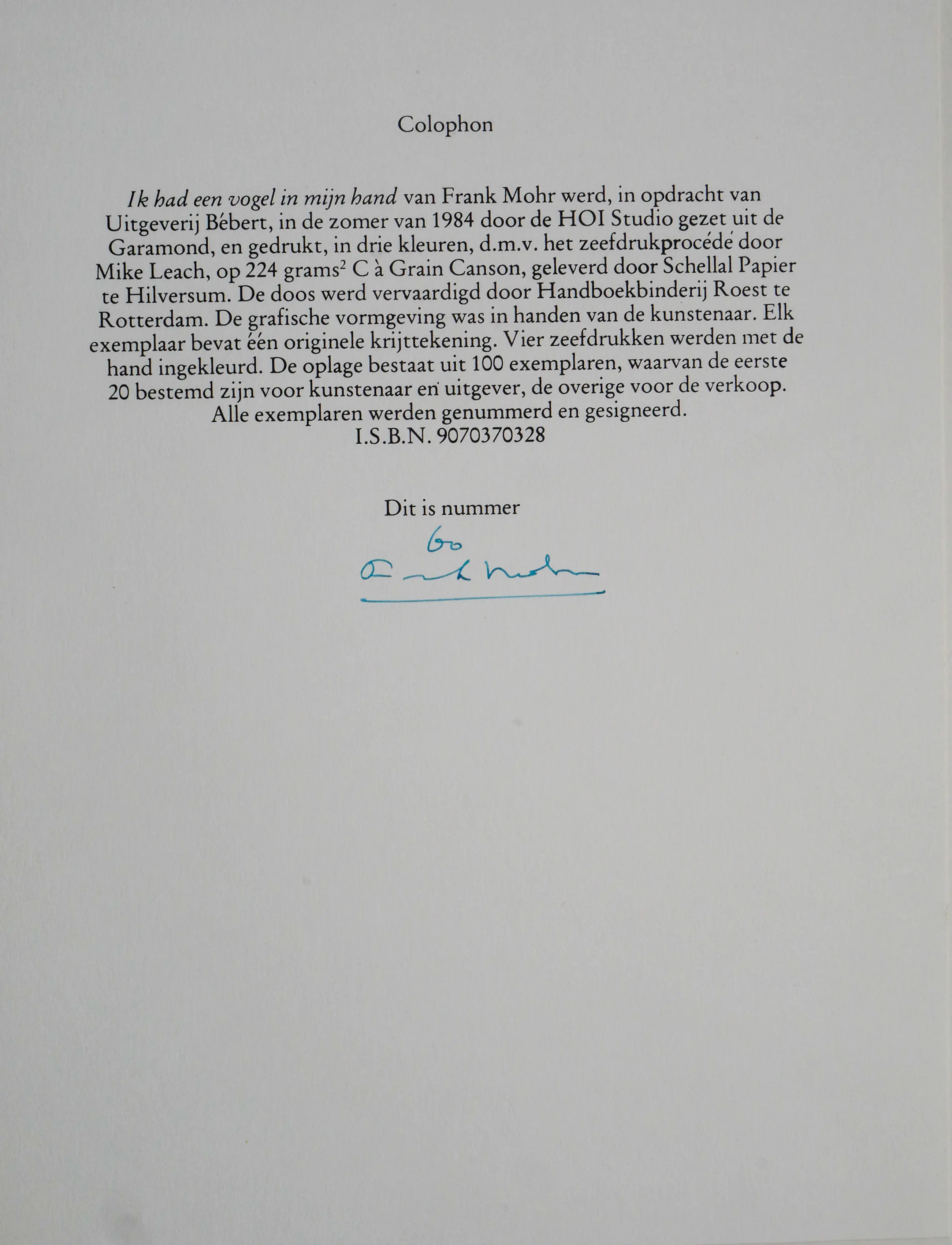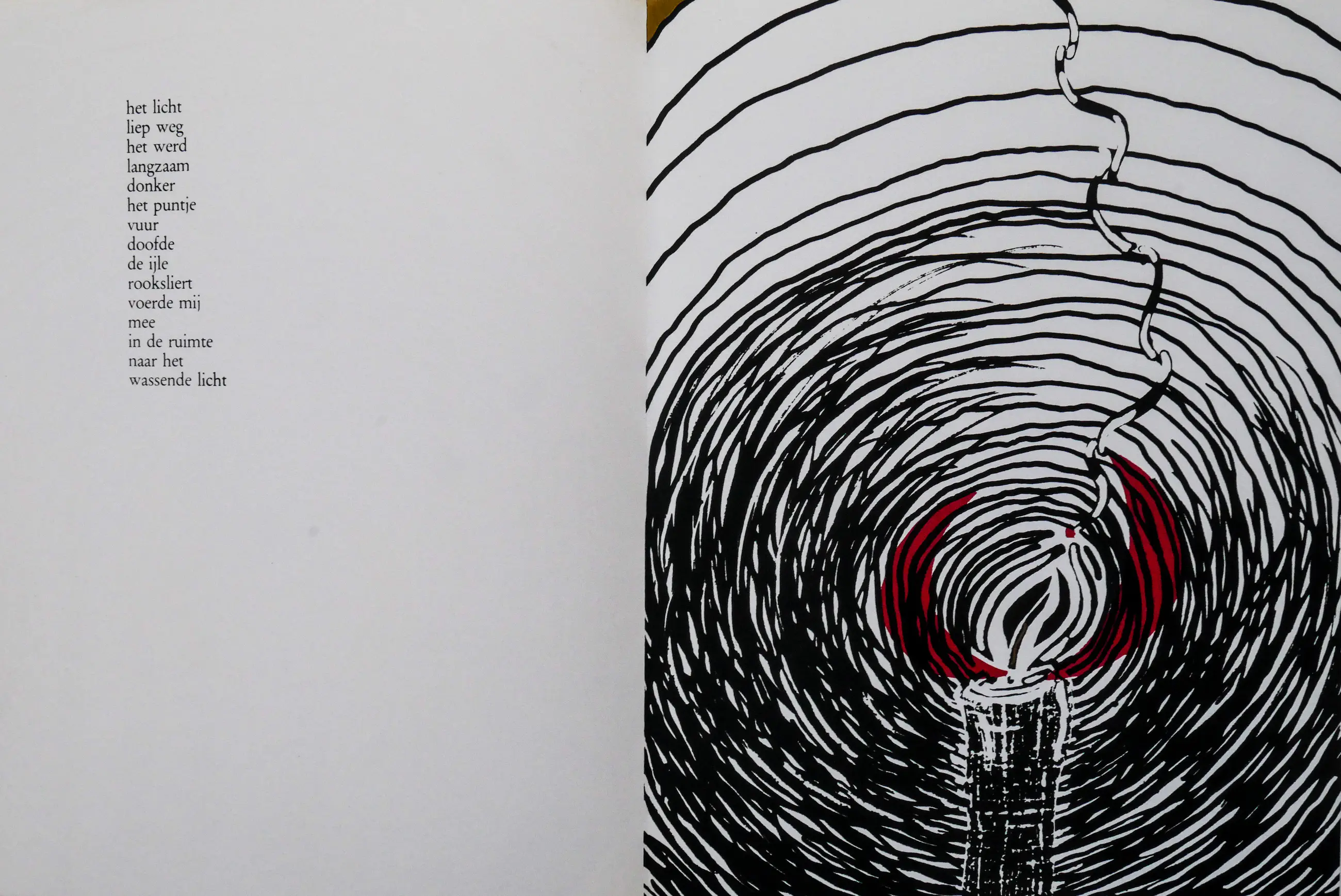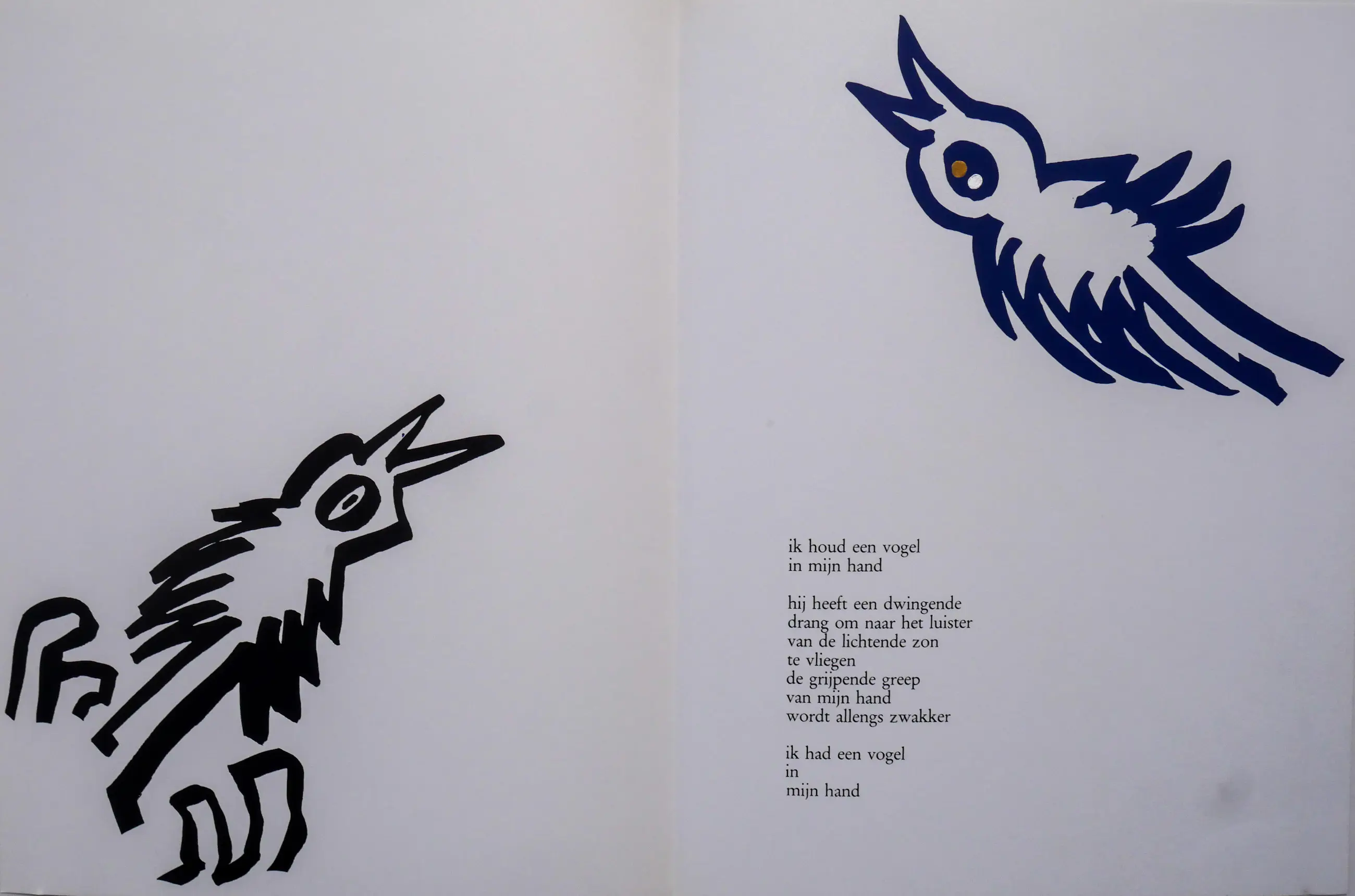 Rood linnen cassette.Inhoud; 1 originele krijttekening - gesigneerd met de hand op de achterkant14 gedichten en dertien zeefdrukken - vier zeefdrukken zijn met de hand ingekleurd.Elk dubbelvel bevat een gedicht en een zeefdruk.Oplage; 100 exemplaren.Gesigneerd op het colofon. Nummering kan afwijken.