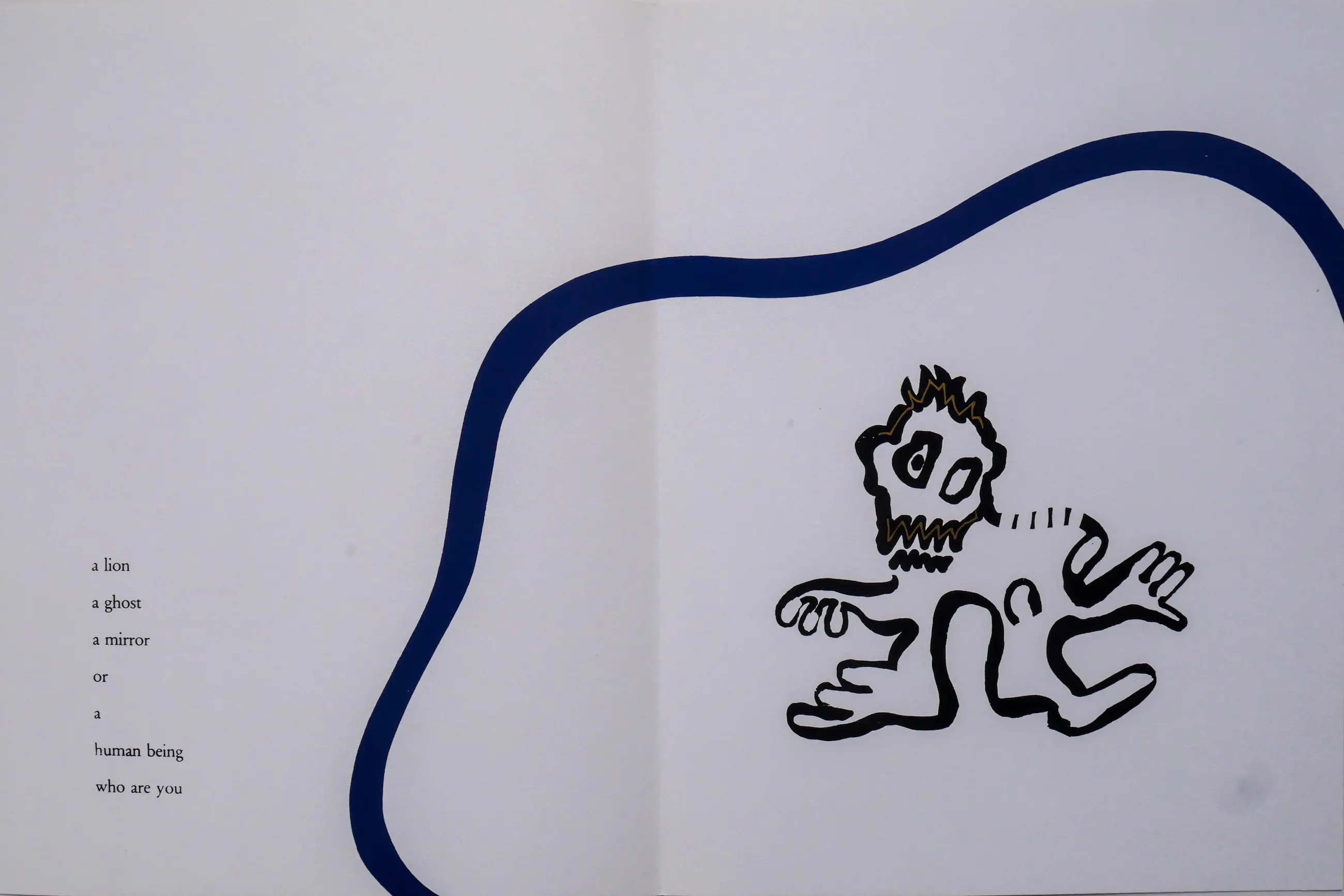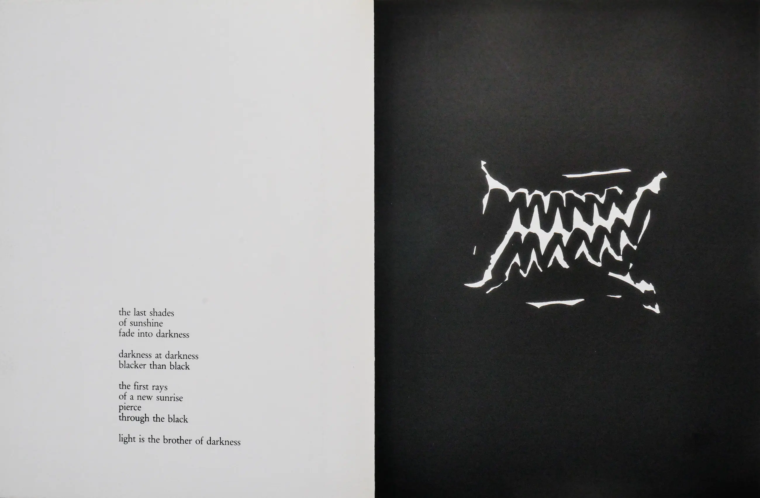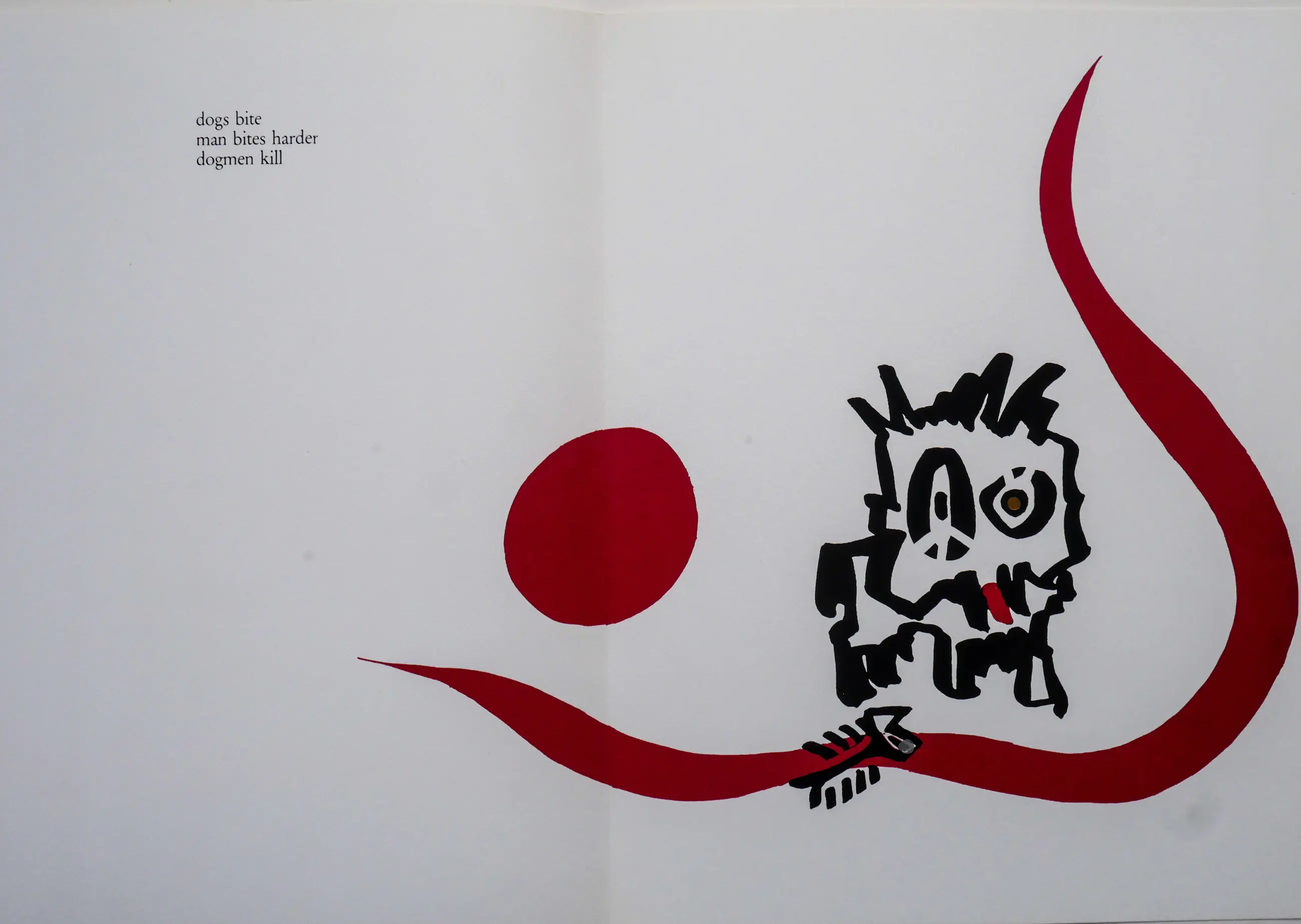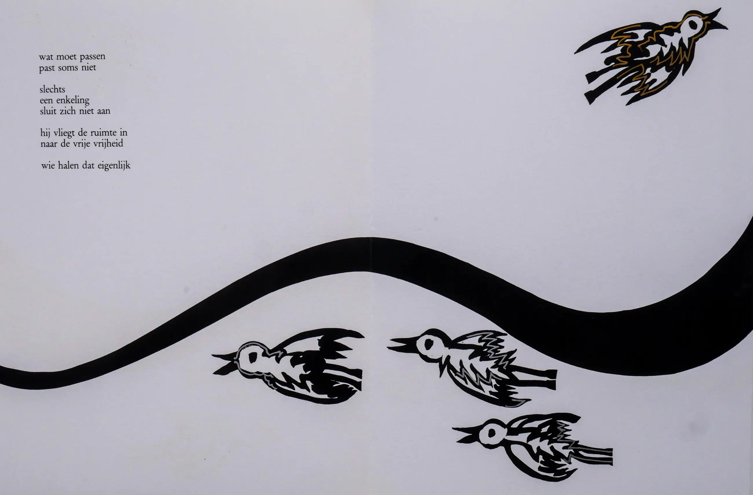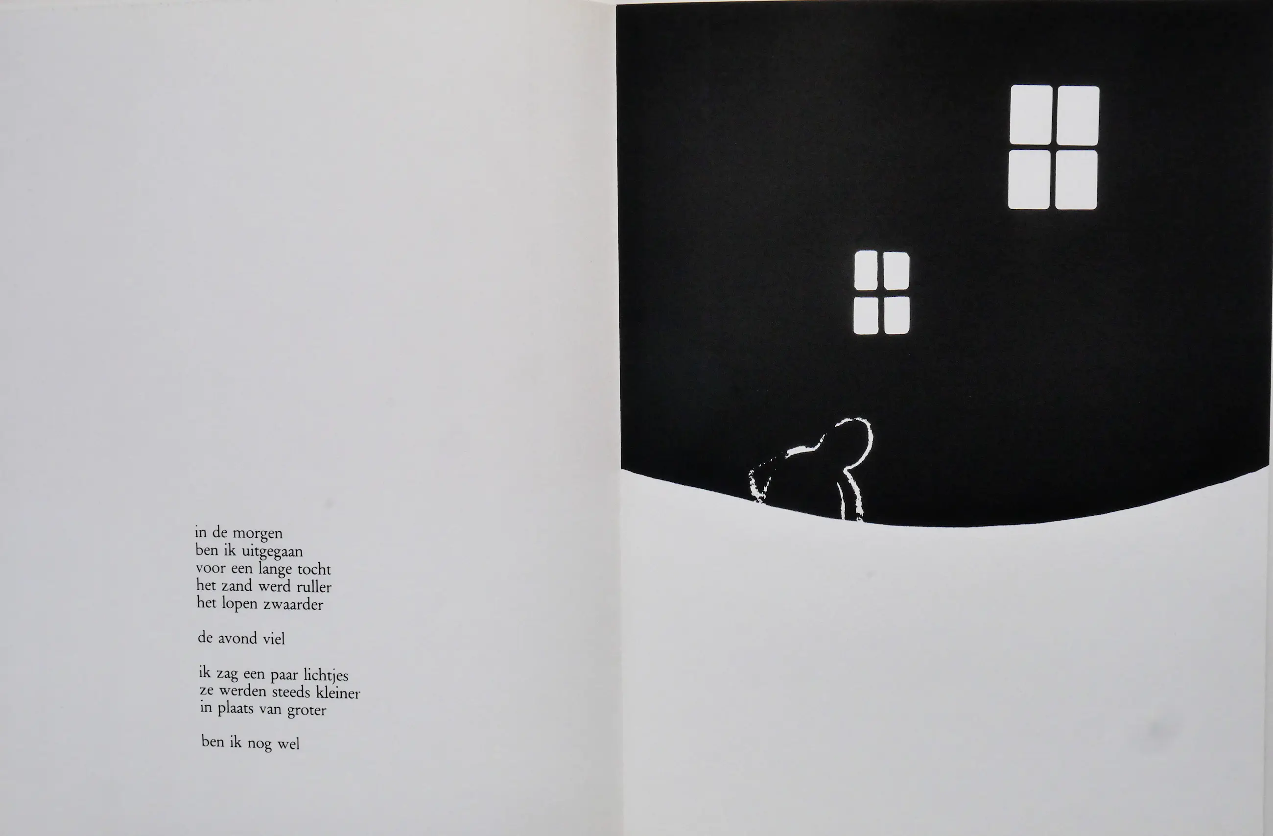 Rood linnen cassette.Inhoud; 1 originele krijttekening - gesigneerd met de hand op de achterkant14 gedichten en dertien zeefdrukken - vier zeefdrukken zijn met de hand ingekleurd.Elk dubbelvel bevat een gedicht en een zeefdruk.Oplage; 100 exemplaren.Gesigneerd op het colofon. Nummering kan afwijken.